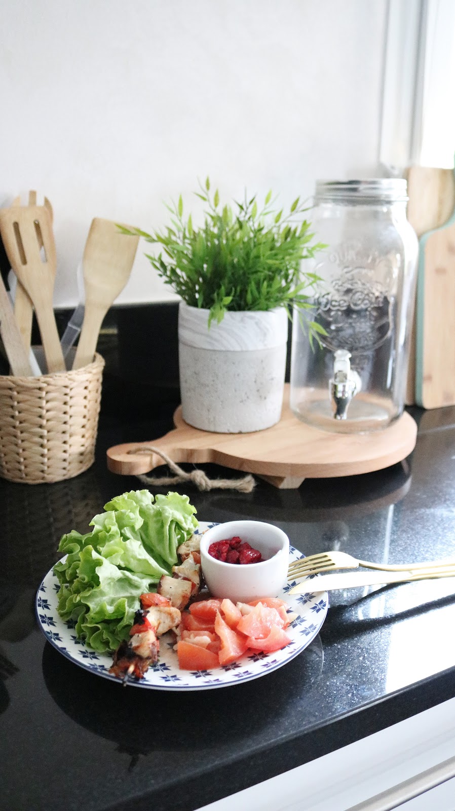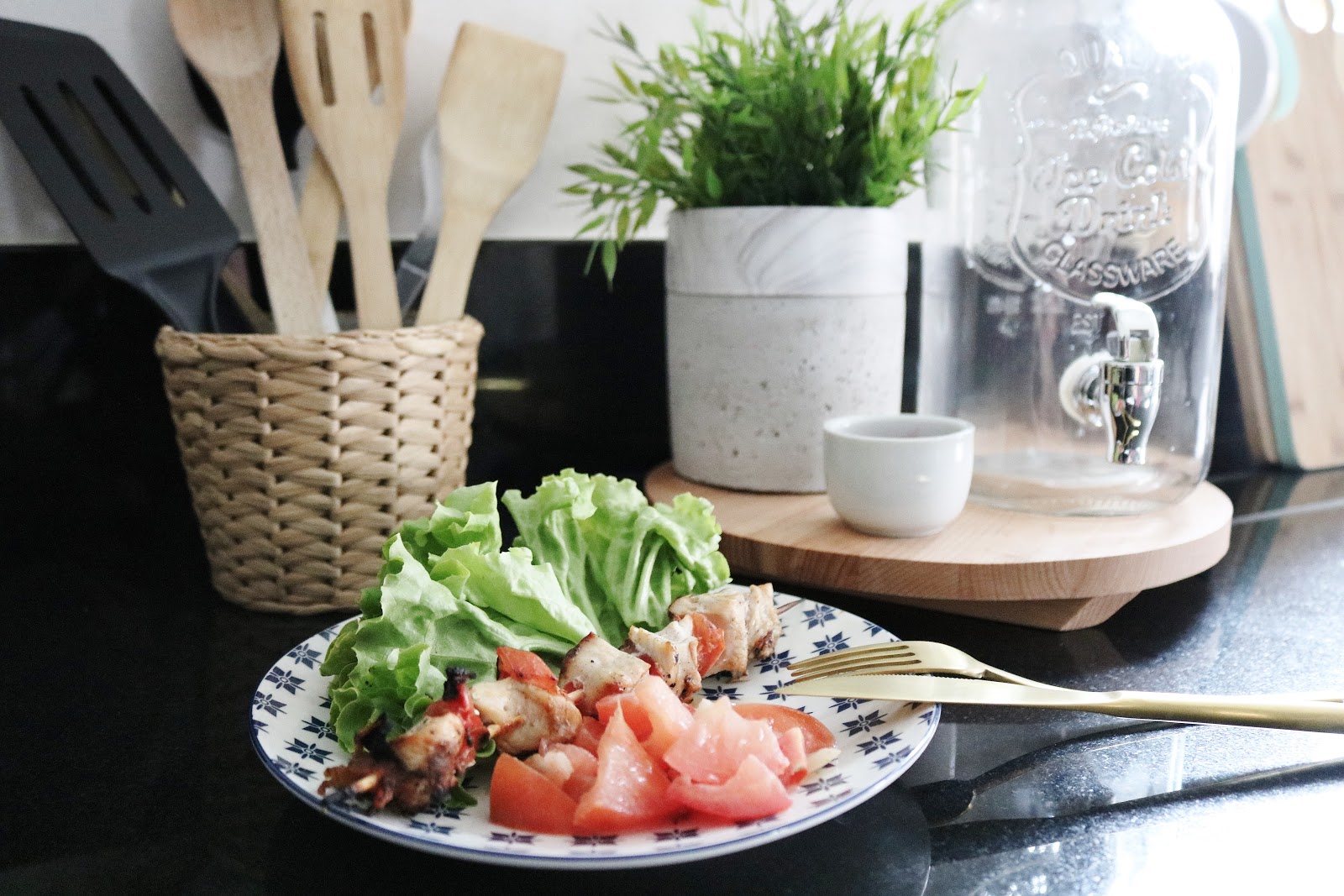 j'aime bcp ton haul et surtout la planche de bois qui fait aussi dessous de plat et le distributeur de boisson fraîche en verre