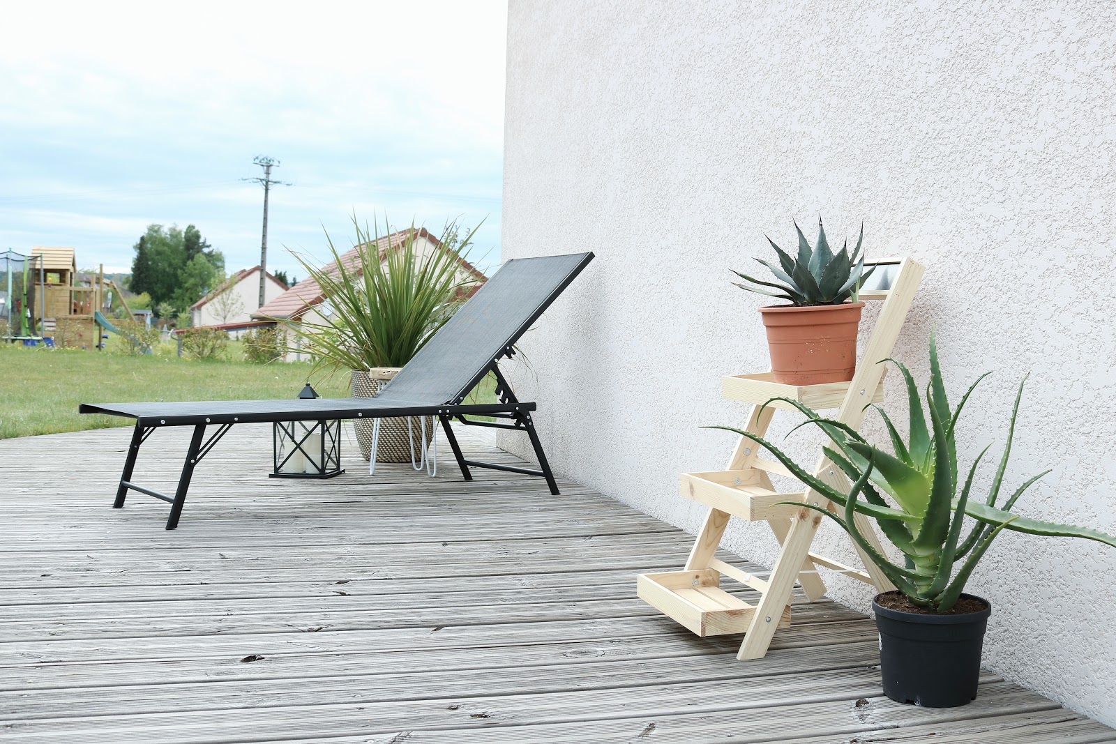 On passe à la terrasse. Seul achat Gifi : cette chaise longue pour environ 40 €. Le tabouret est nouveau, il vient d'Action et il est en bois vieilli. Il s'avère parfait comme petite table basse à côté du bain de soleil.