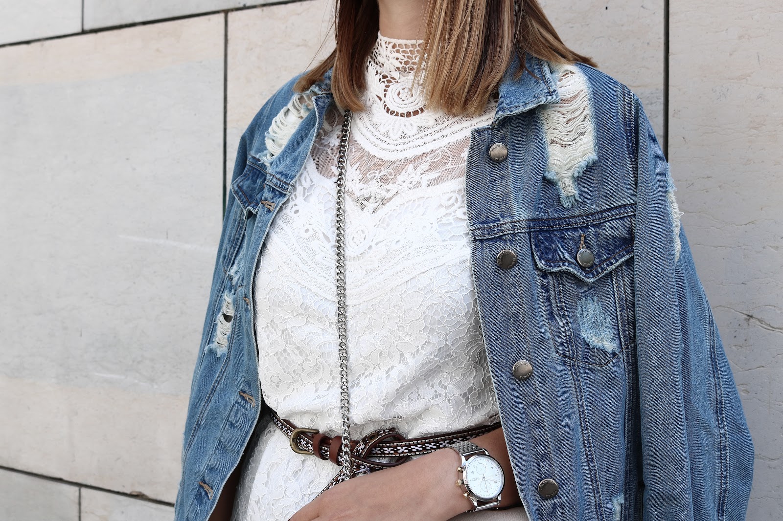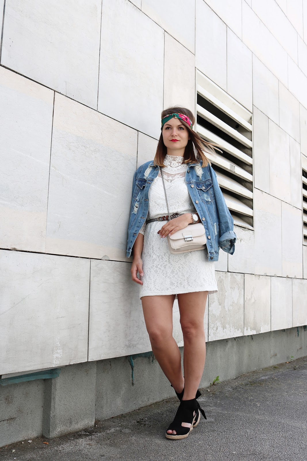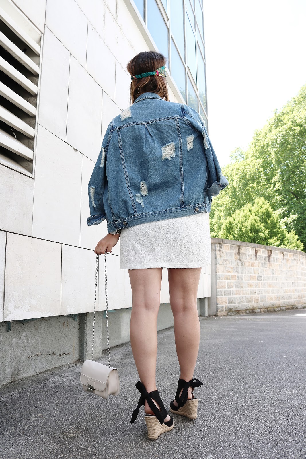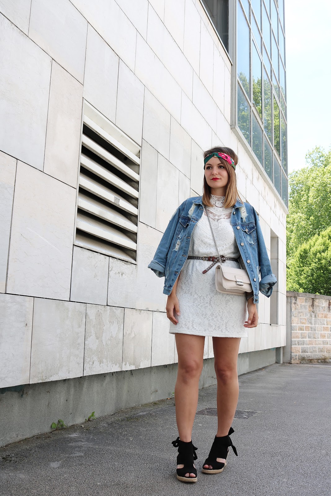 Je vous propose aujourd’hui un look qui sent bon l'été, à base de dentelle blanche et de veste en jean. Je n'ai quasiment que des nouveautés à vous présenter. Déjà cette robe : dénichée chez Promod, je suis tombée en amour pour son joli col tout brodé et je ne me voyais pas la porter sans cette veste en jean au côté destroy. J'ai également tenté le bandeau dans les cheveux (qui ont d'ailleurs pas mal raccourci depuis ces photos) pour apporter un peu de couleur et changer des éternels chapeaux que je peux porter habituellement. Aux pieds, les superbes compensées Vanessa Wu : hyper confortables les petites ! On se retrouve jeudi, en attendant une bonne semaine à tous ! (Tous les liens sont à la fin de l'article ; Merci Léa de Comptoir au Féminin pour les photos).