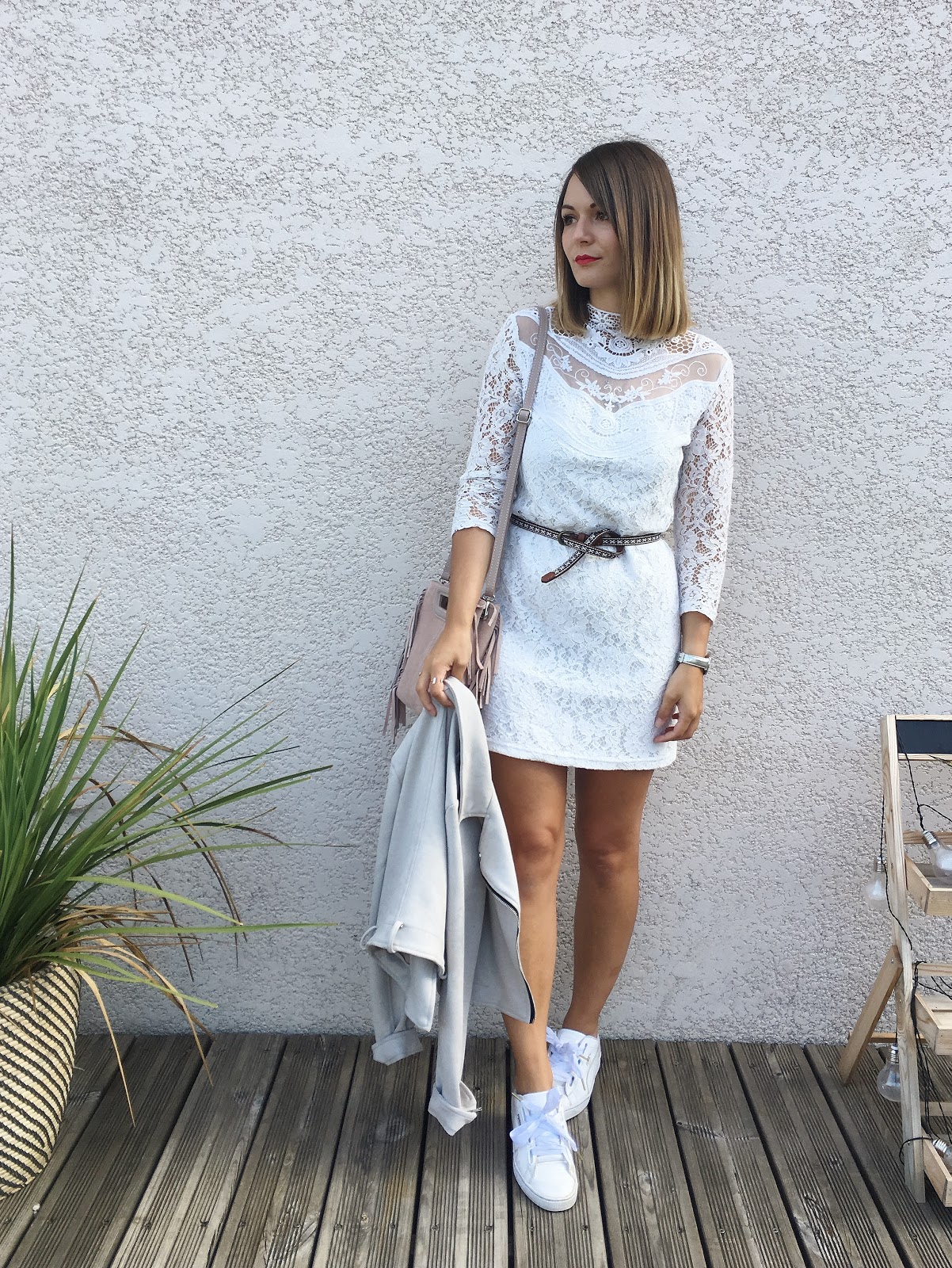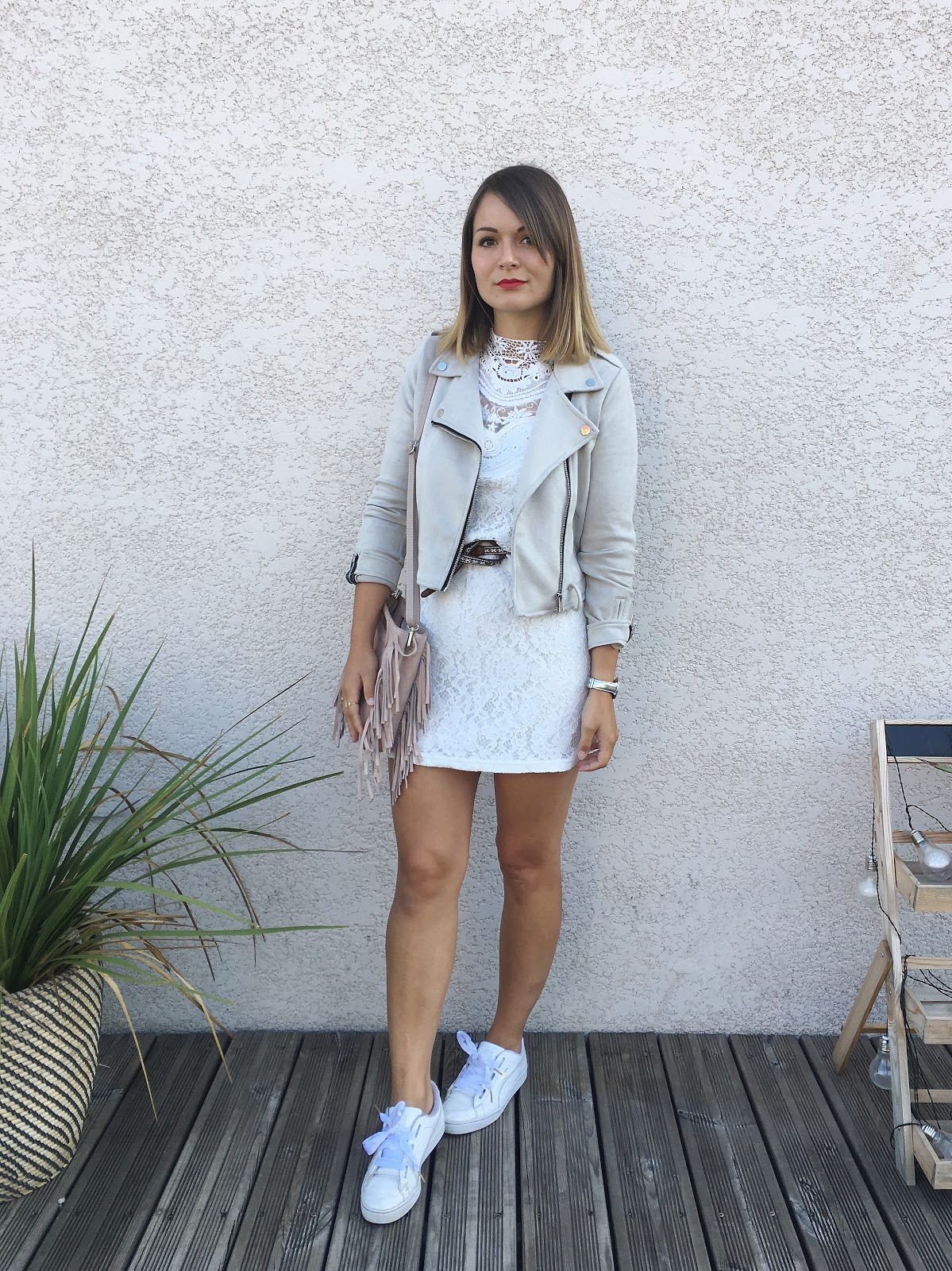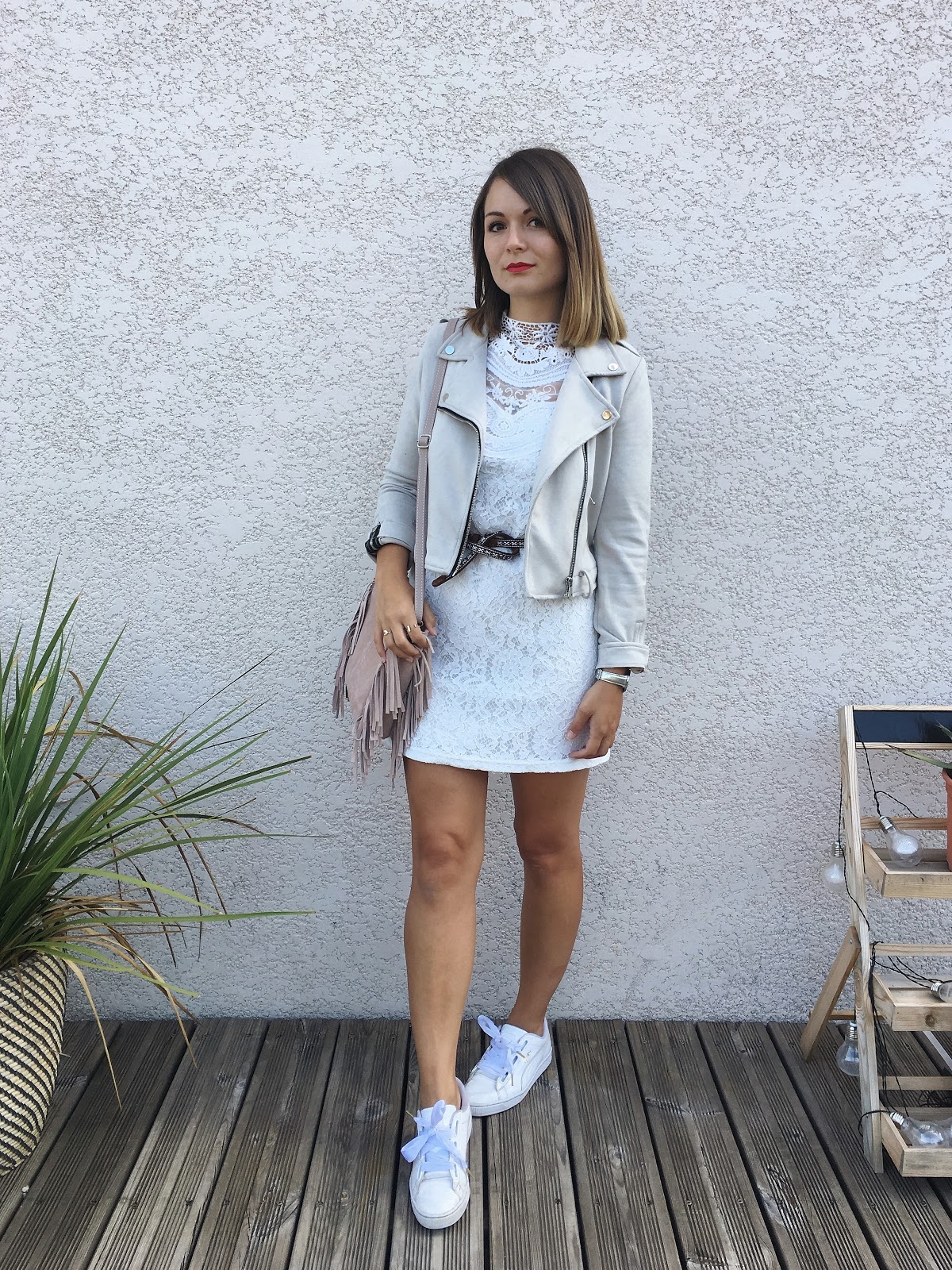 Nouvelle tenue avec cette robe Promod déjà portée en version veste en jean/compensées noires par Ici. Cette fois-ci, des teintes très claires : un perfecto gris, le sac La Fée Stylée rose poudré et mes baskets Heart trouvées à la boutique Legend à Montbéliard. White is White, ou Wight is Wight comme dirait Michel Delpech, quoiqu'il en soit on adore l'été pour se permettre de ne porter que du blanc sur une peau bronzée.