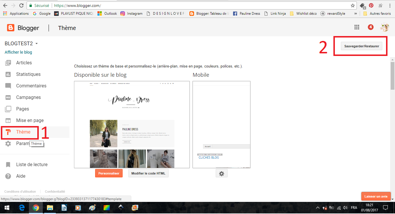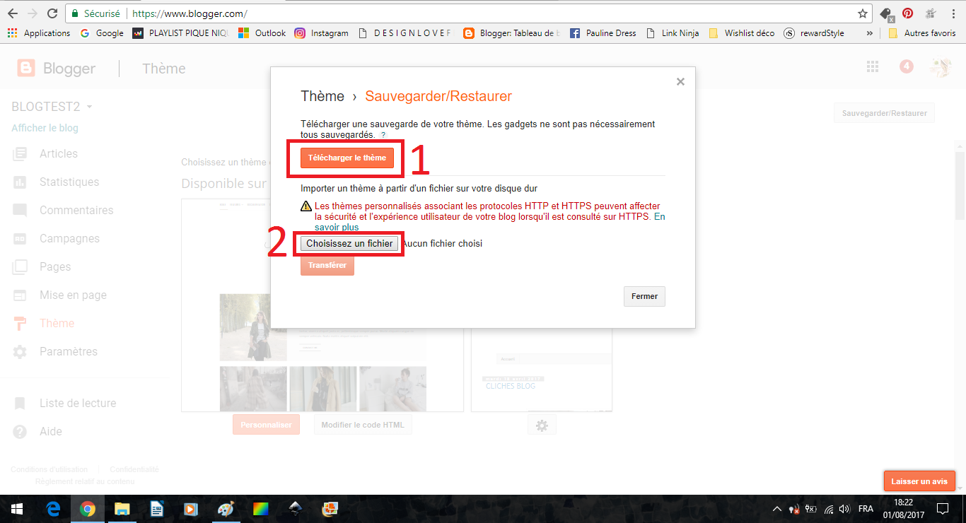 Sauvegardez votre thème (1), cela permettra s'il y a un problème de ré-importer votre blog existant. Puis (2) Choisissez un fichier, et allez chercher le thème que vous venez de télécharger.
