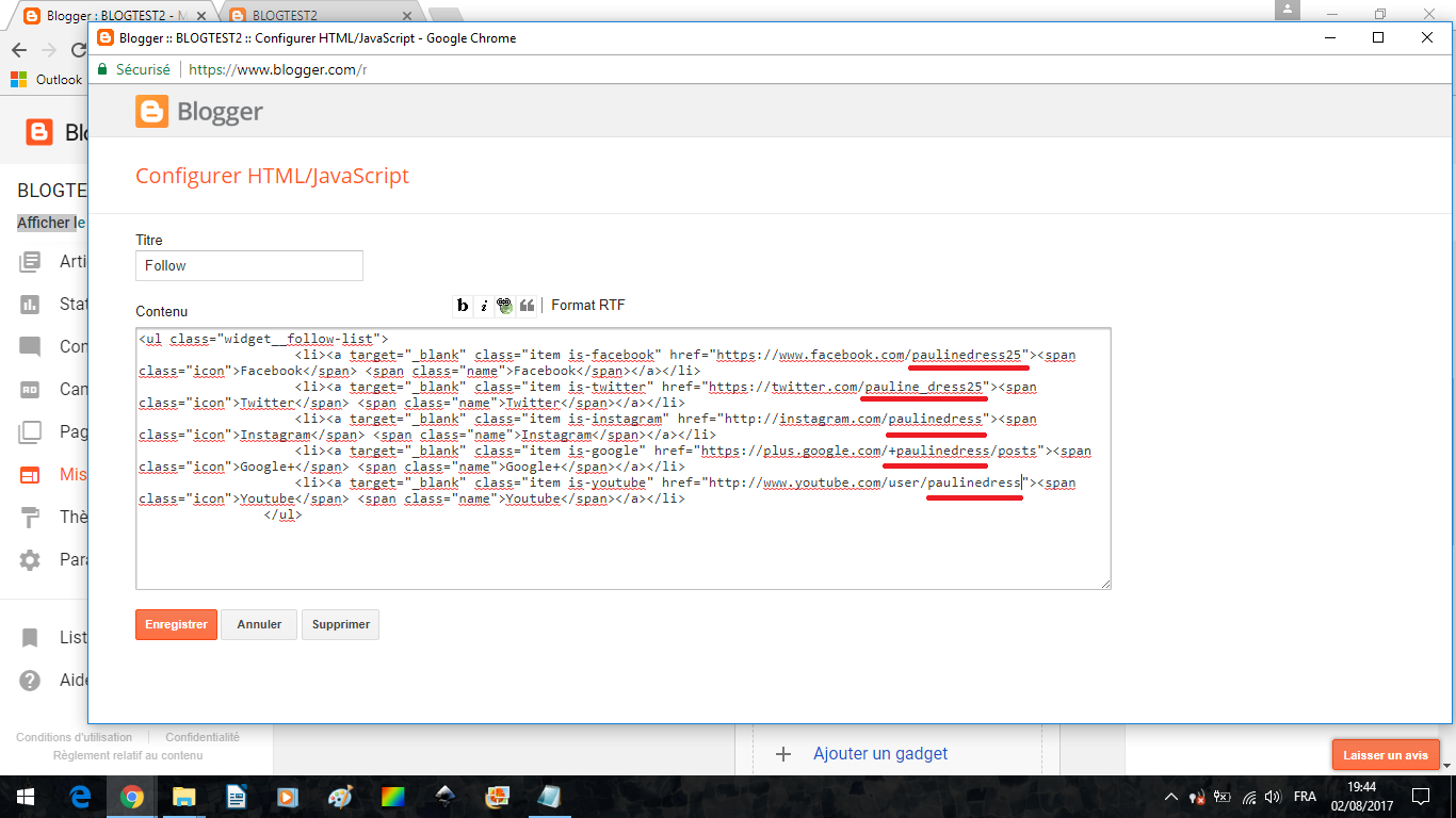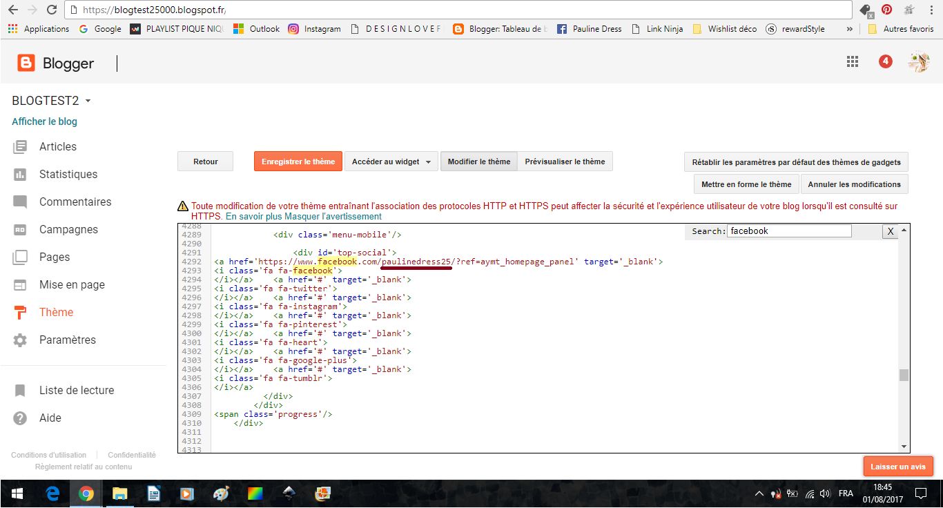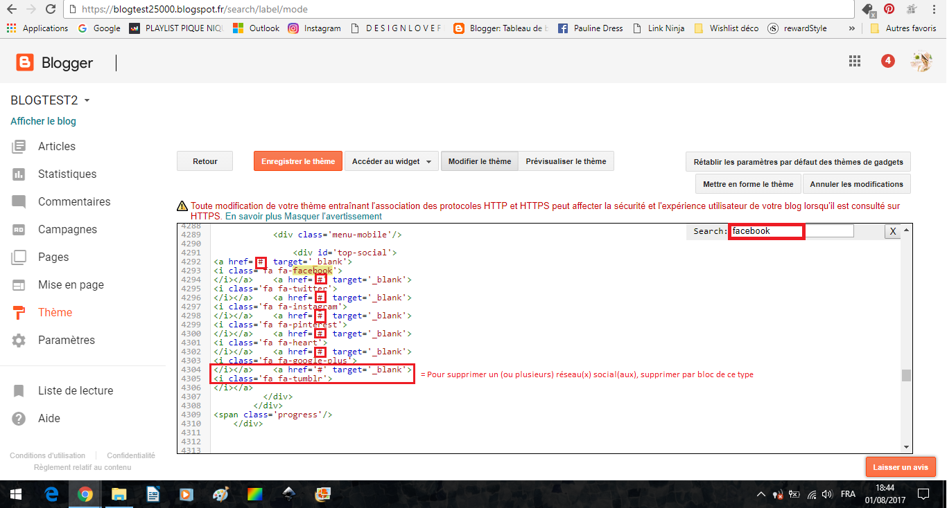 Grâce à la fonction recherche, trouvez dans le code le paragraphe ci-dessus (recherchez "Facebook" pour atterrir facilement dessus). Et modifiez les # entourés en rouge par les liens vers vos réseaux. Attention veillez à bien laisser les guillemets autour de vos liens, comme ci-dessous :
