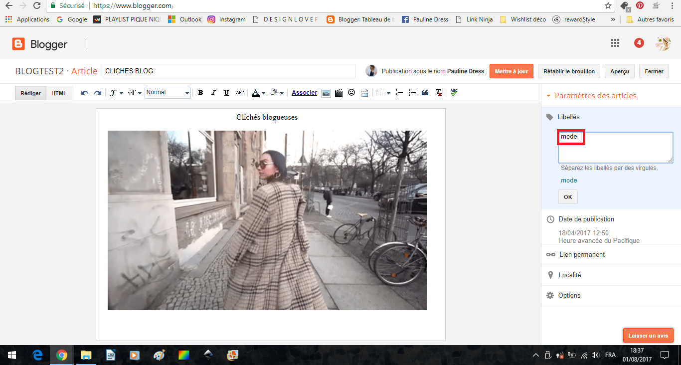 Pour appliquer un libellé, quand vous rédigez ou modifiez un article, écrivez le ou les libellé(s) qui conviennent dans la case prévue à cet effet à droite. Vous pouvez écrire plusieurs libellés pour un article, il suffit de les séparer avec des virgules. Exemple : "mode, haul". Une fois que vous avez écrit un libellé dans un article, vous le retrouvez dans vos futurs articles, il suffit alors de cliquer dessus (comme ici avec le petit "mode" en bleu juste en dessous du cadre blanc des libellés).