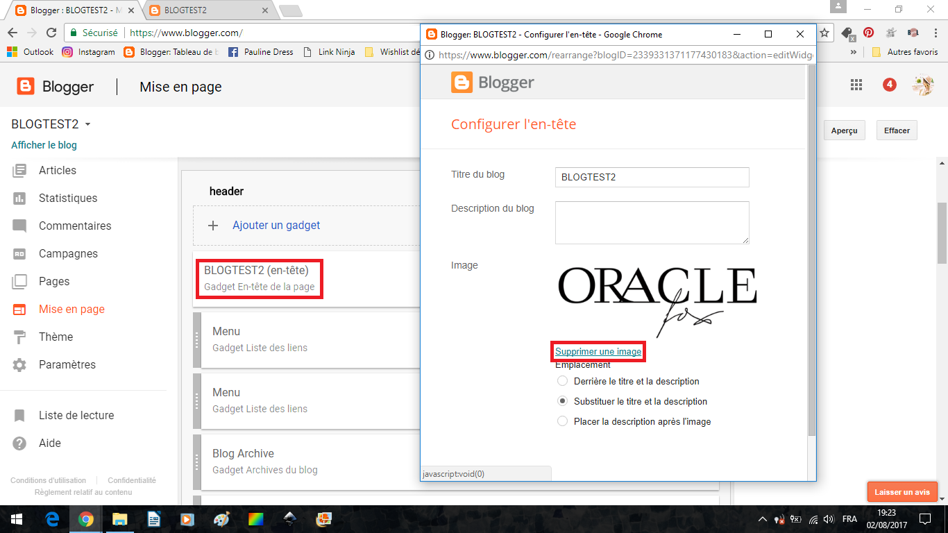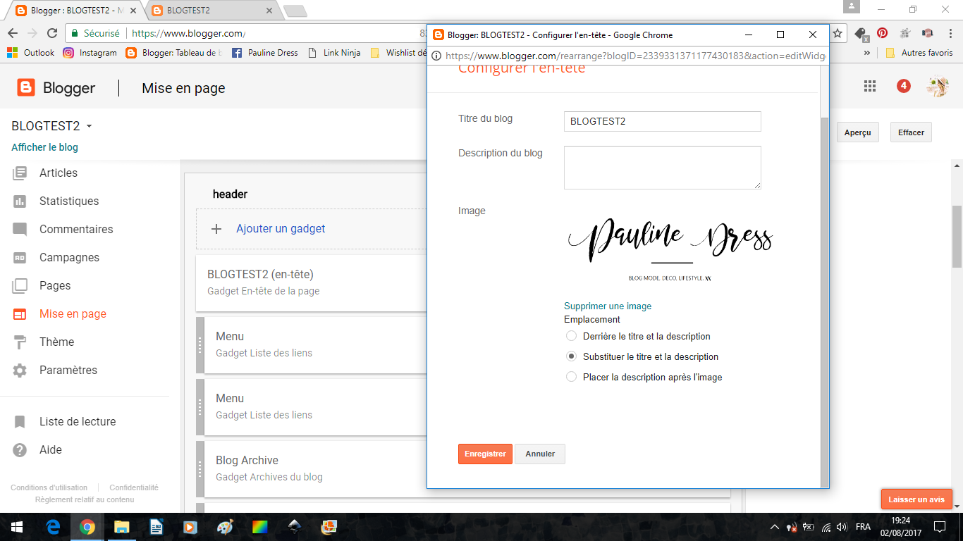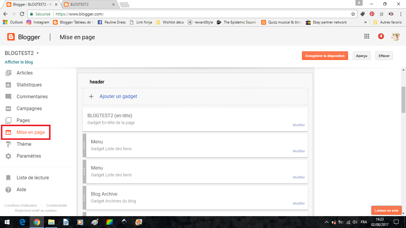 Allez dans Mise en Page. C'est là que vous pouvez mettre en forme et changer les blocs de construction de votre blog. On peut ici changer la bannière en cliquant sur "modifier" dans le gadget EN-TETE.