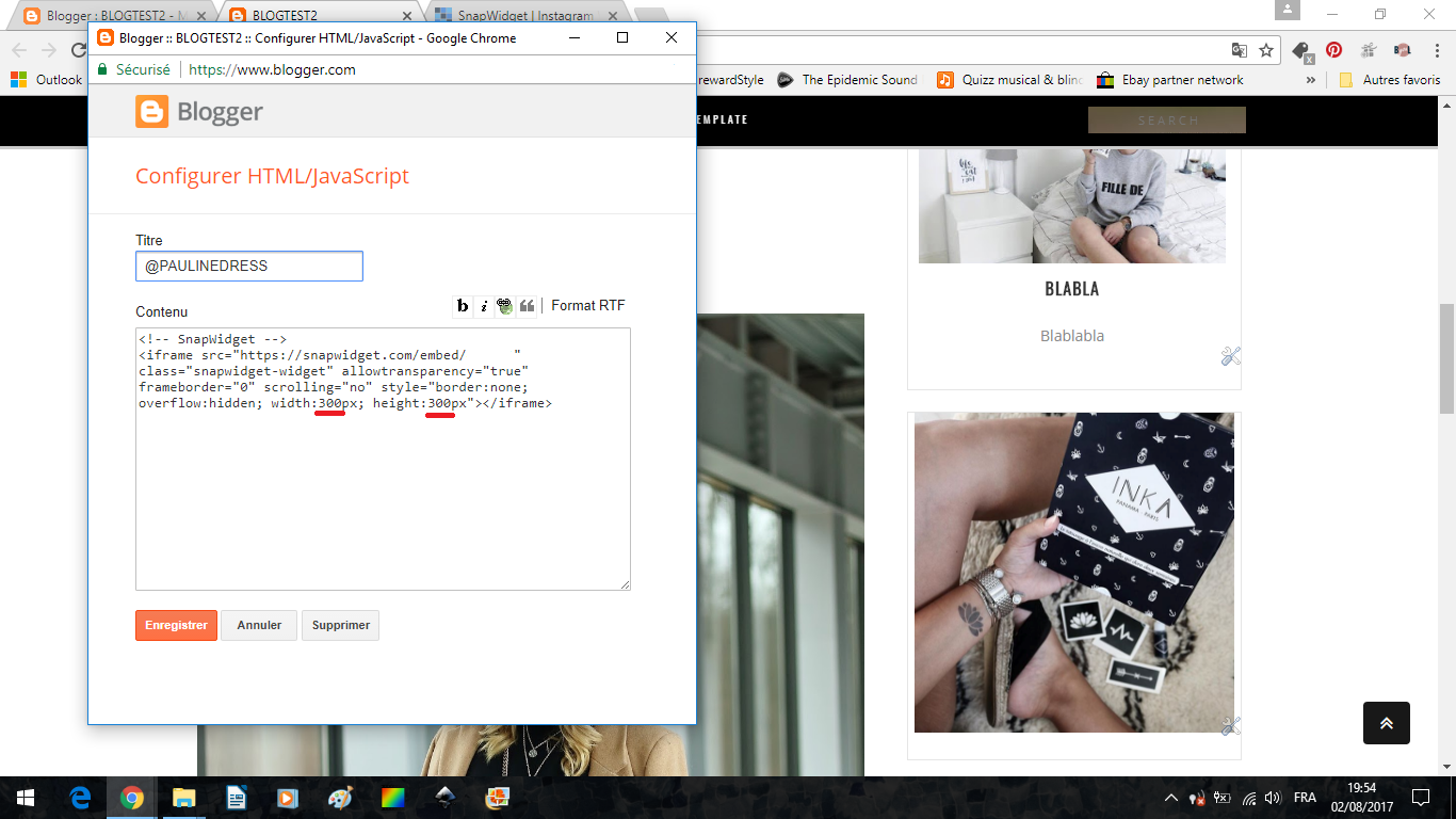 Pour une ligne on choisit du 8 (environ) x 1. Comme avant, on copie le code obtenu, et on le colle sur le blog dans un gagdet HTLM.