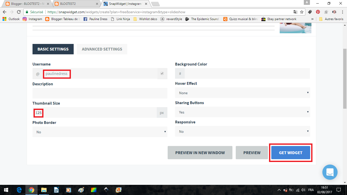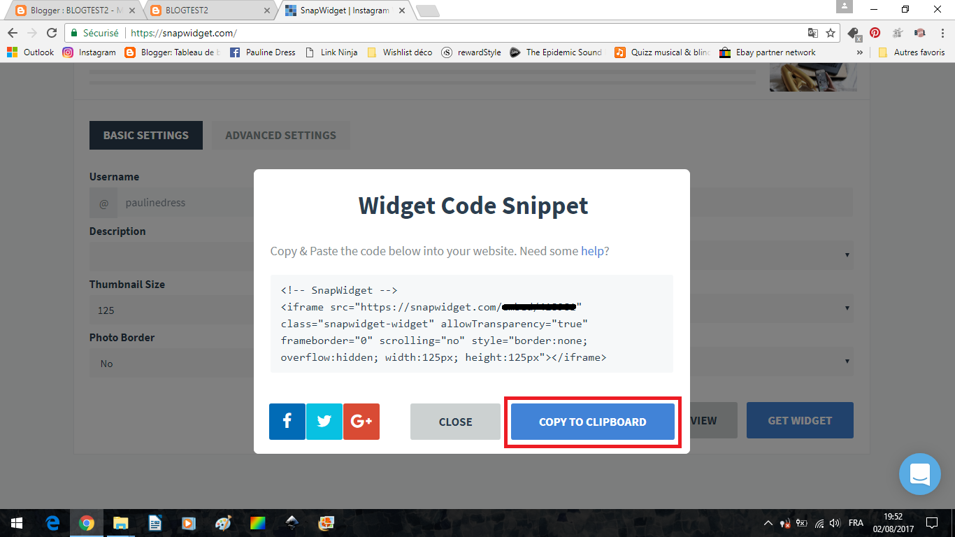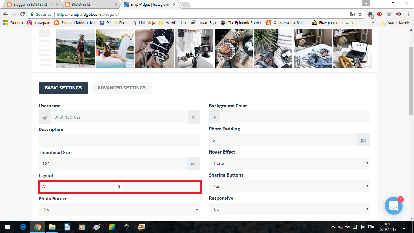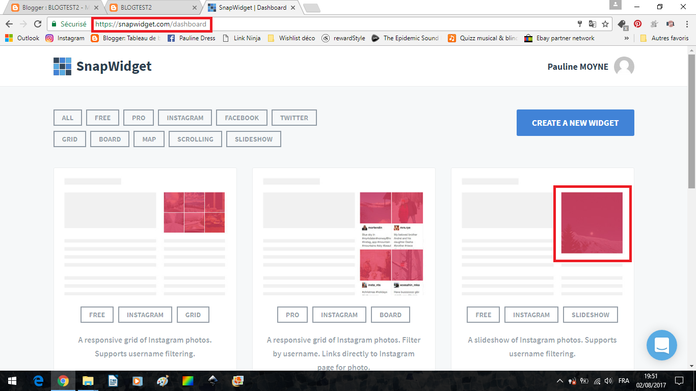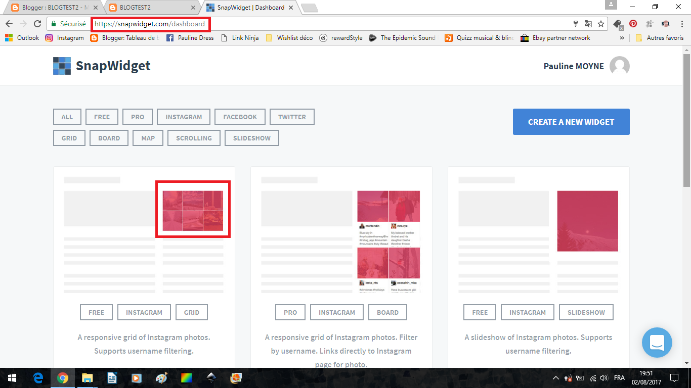 Rendez-vous sur le site SnapWidget.com, vous pourrez, une fois après avoir créé votre compte, insérer un gadget qui fera défiler vos photos Instagram (ou Facebook, twitter... plusieurs choses sont proposées). Commençons par un encadré carré photo par photo.