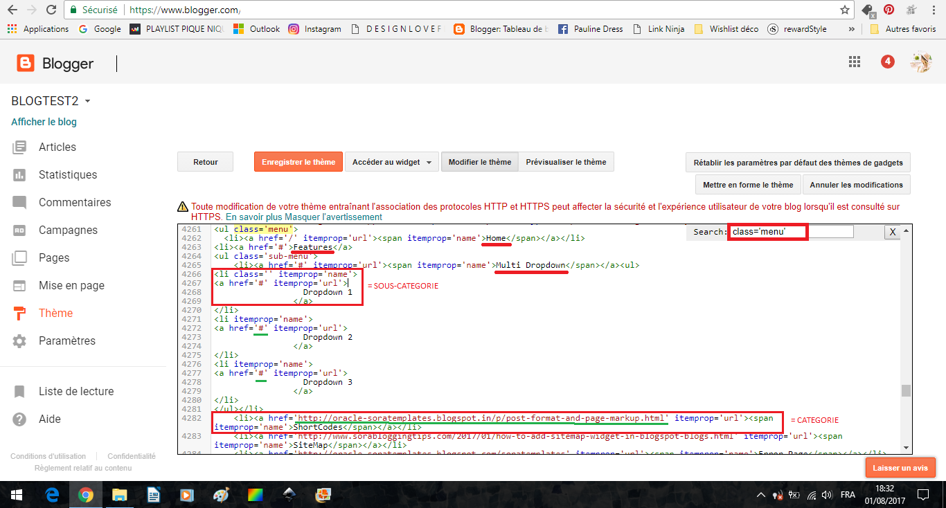 Toujours en vous basant sur la recherche, allez sur le paragraphe ci-dessus dans votre code. J'ai recherché "class=menu" pour le trouver. Ce paragraphe représente les Catégories et les Sous-Catégories de votre menu déroulant. Apprenez à reconnaitre les blocs de paragraphes qui composent le code. Je vous ai encadré ci-dessus les blocs correspondants. Si vous voulez supprimer ou ajouter quelques catégories ou sous-catégories, sélectionnez bien toute la partie correspondante. Je vous ai souligner le nom des catégories en rouge (Home, Features..) qu'on retrouve sur le blog sous cette forme :