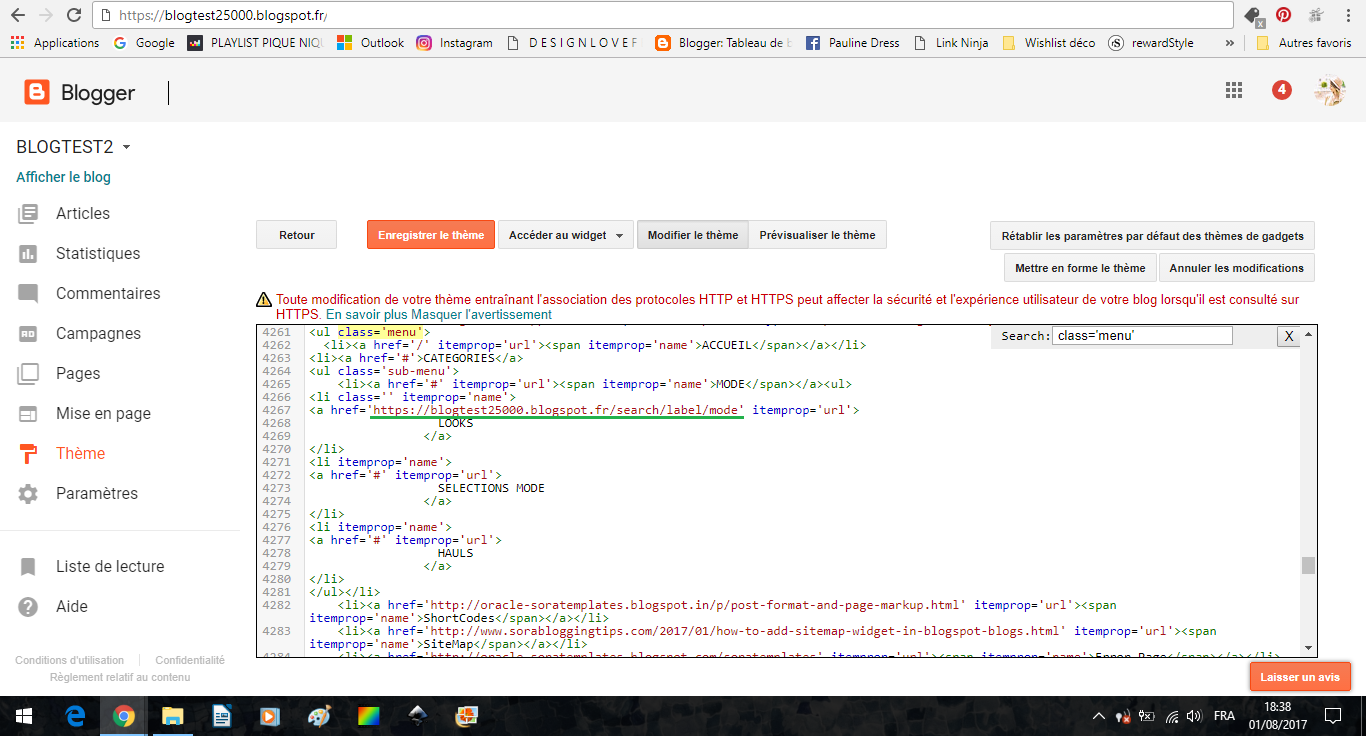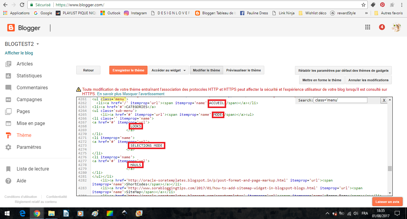 Par exemple, ci-dessus j'ai remplacé les noms HOME, FEATURES, etc.. par les noms ACCUEIL, MODE, et j'ai remplacé les noms des sous-parties par LOOKS, SÉLECTIONS MODE et HAULS. Je veux du coup que quand on clique sur la catégorie LOOKS, on soit renvoyé vers tous les articles qui parlent de mode sur mon blog. Je vais donc remplacer le # du début de la ligne LOOKS (la ligne 4267) par le lien correspondant.