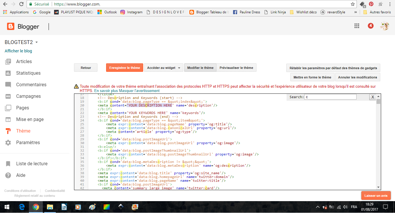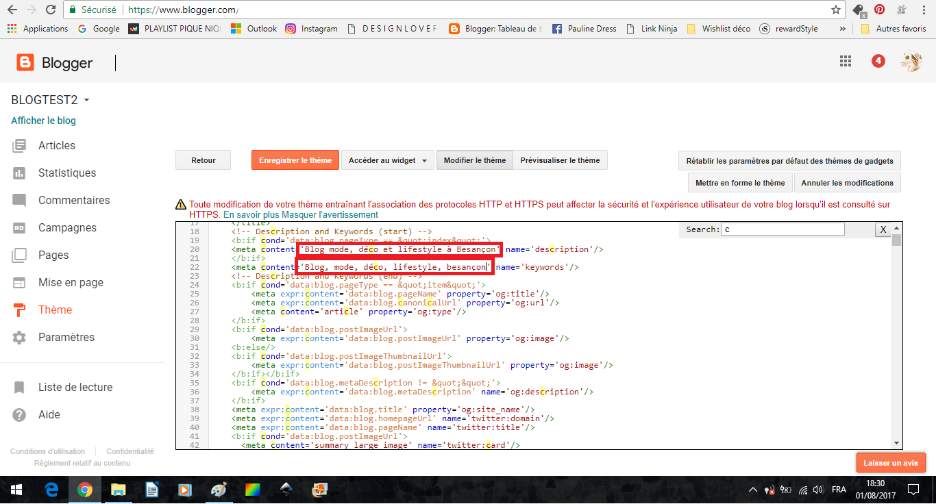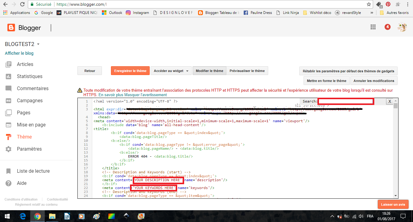 Le code peut vraiment effrayer ! Et en effet, mieux vaut ne pas se tromper et ne pas supprimer ni modifier n'importe quoi. Je vous rassure, je ne parle pas du tout le langage du code, mais j'ai appris à reconnaître ce qui m'intéressait et ce qui pouvait être changé. Dans votre modèle, recherchez (pour rechercher, cliquez quelque part dans le code et appuyez sur CTRL+F, la barre de recherche apparaîtra comme ici en haut à droite). Recherchez le mot "DESCRIPTION" jusqu'à atterrir à un code comme celui qui est ci-dessus. Vous pouvez modifier ce qui est dans les encadrés rouges avec la description et les mots-clés de votre choix, tout en veillant à bien rester dans les guillemets.