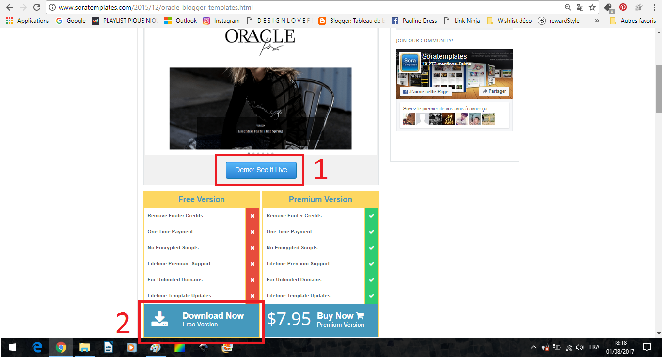 Cliquez ensuite sur (1) "Demo : See It Live". Vous aurez un aperçu sur un faux blog créé par Sora Templates et pourrez tester les différentes fonctionnalités du modèle. Si le modèle vous plait, qu'il s'adapterait parfaitement à votre blog, que les polices, le format des photos vous conviennent, vous pouvez le télécharger gratuitement en cliquant sur le (2).