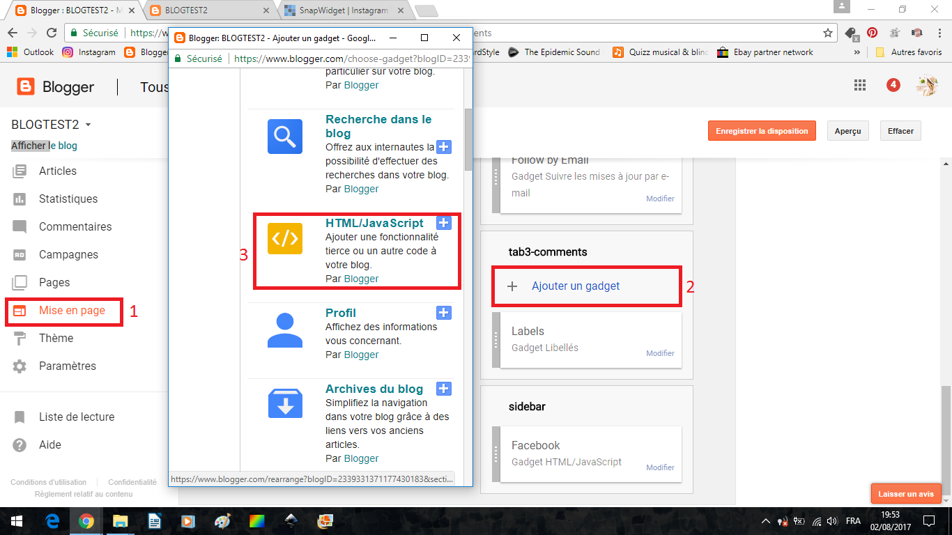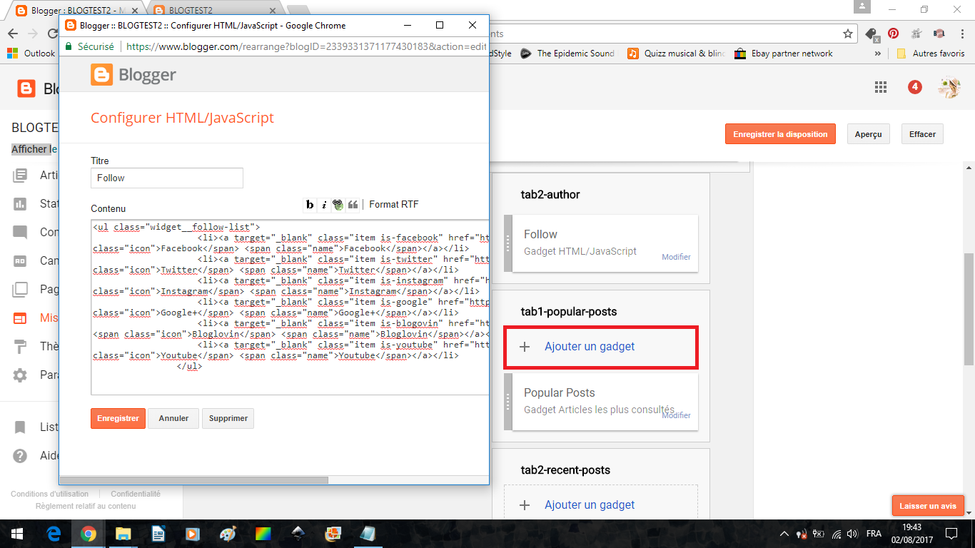 Sur Blogger, dans mise en page, ajoutez un gadget, choisissez encore une fois un HTML/Java Script, et collez y le code.