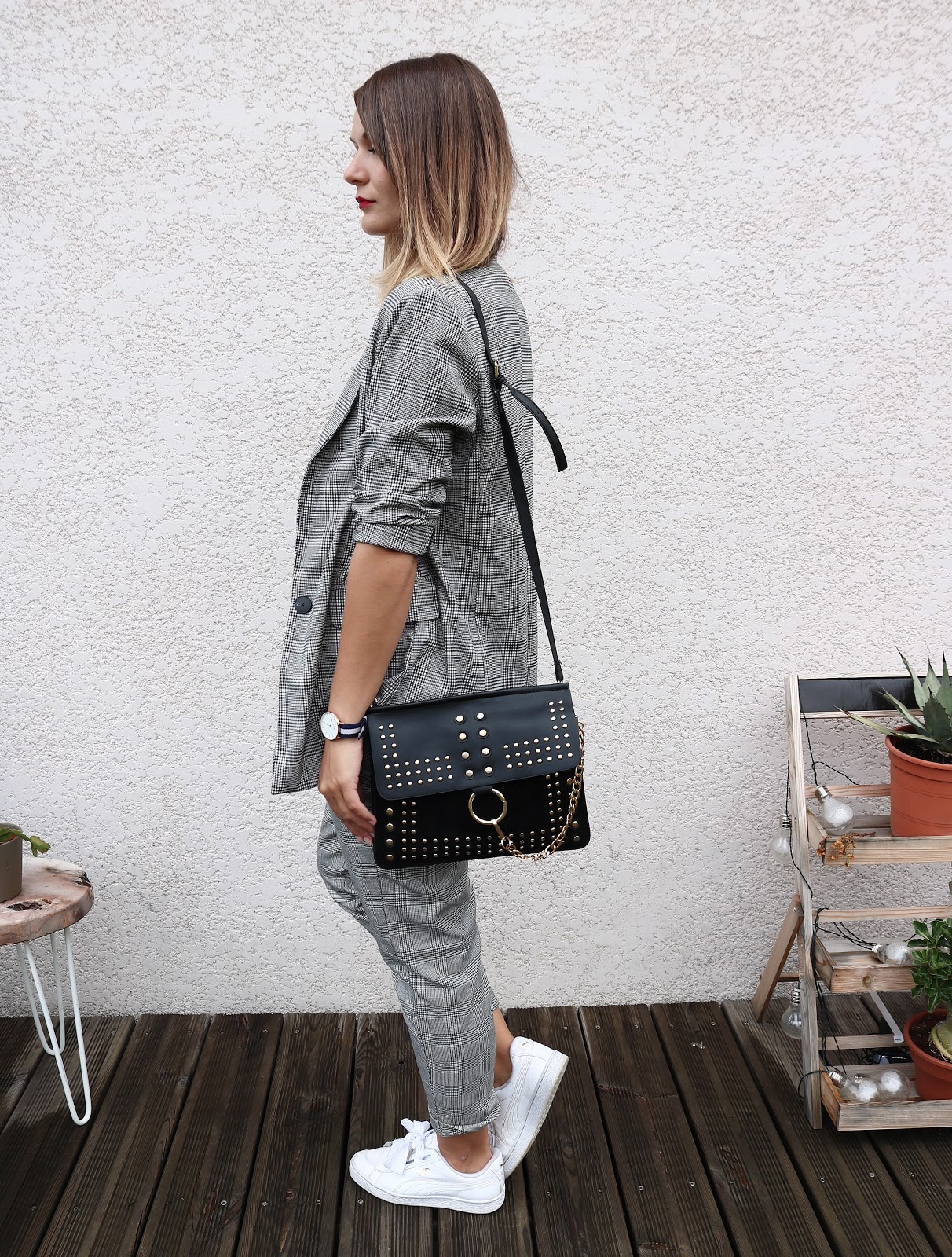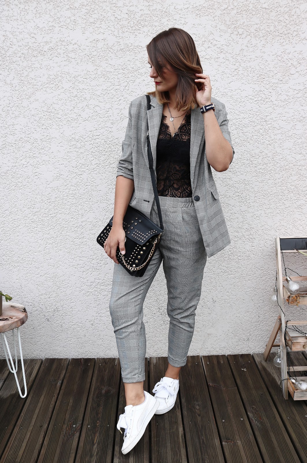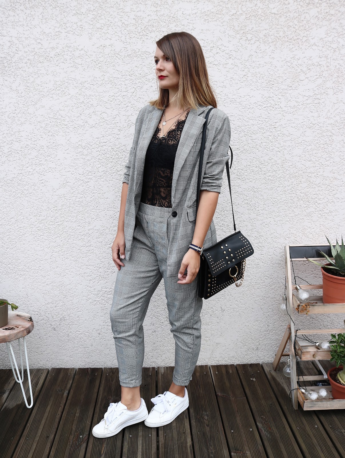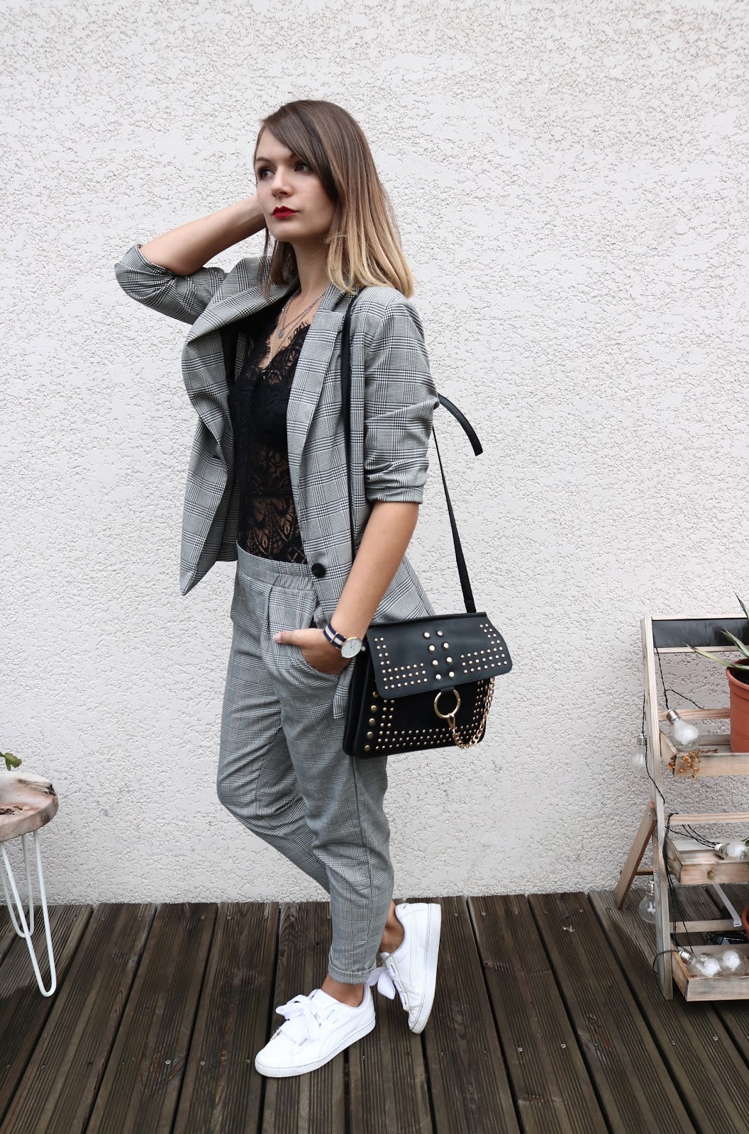 Hello tout le monde, j'ai profité de cette semaine de vacances pour vous préparer un petit look Bershka. J'avais déjà testé la version veste et shorts assortis, mais cette fois-ci le pantalon est de sortie. La qualité n'est pas exceptionnelle mais j'ai craqué en voyant la veste assortie à mon jogger. Porté ici avec un body dentelle pour casser le côté trop masculin et mes Puma Heart.