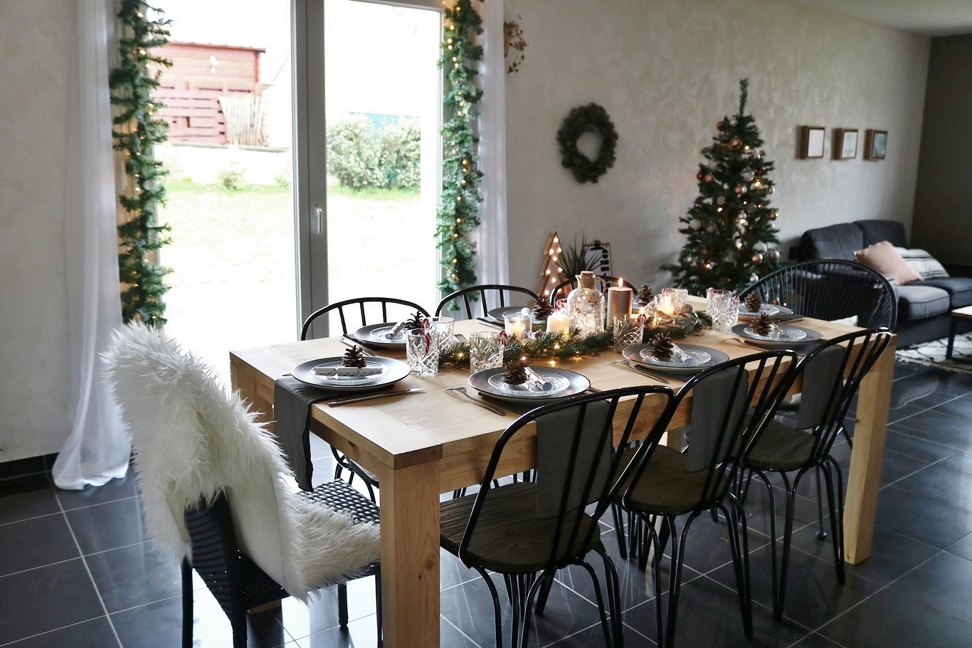 J'ai donc tout misé sur le centre de table, et j'ai pris le parti de ne mettre ni nappe ni chemins de table. J'ai hésité entre accumuler les feuilles d'eucalyptus ou les branches de sapin et j'ai finalement opté pour cette dernière idée. J'avais envie de mettre des vraies branches mais finalement plutôt que d'aller en couper j'ai préféré en commander 6 sur Amazon que je pourrai réutiliser les prochaines années. J'ai commandé en même temps la grande guirlande que j'ai mise autour de la fenêtre. La guirlande lumineuse à l'intérieur est incluse et se branche sur une prise. Au centre de la table j'ai mis quelques bougies, une lanterne en verre de chez Action et une guirlande à led que j'ai eue dans la dernière My little box. Elle s'alimente grâce à un port USB, j'ai donc caché une batterie externe (qui sert normalement à recharger les téléphones) sous un bougeoir pour pouvoir l'allumer sur la table. Au niveau du sapin, j'en ai fait un faux mais je pense que l'année prochaine je vais me laisser tenter par un vrai pour une fois ! La plupart des boules du sapin viennent de Maisons du Monde et le tour de pied de sapin en bois vient de Action.