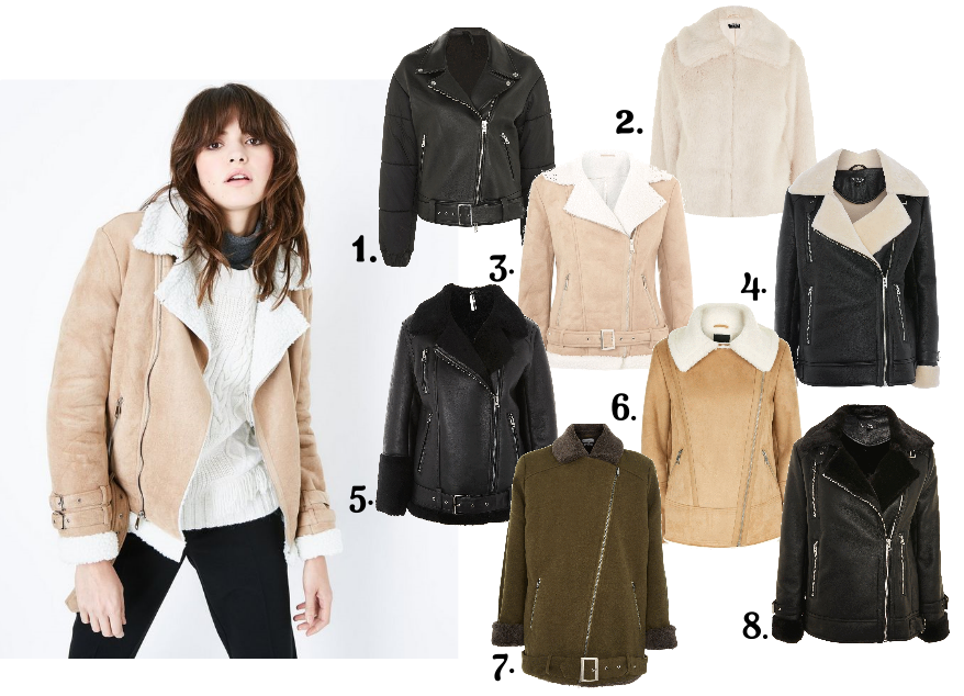 1. Bombardier doudoune - Topshop / 2. Manteau poilu blanc retourné - Topshop / 3. (et photo) Camel - New Look / 4. Bombardier noir et laine - Topshop / 5. Noir et peau retournée - Topshop / 6. Ocre - New Look / 7. Bombardier kaki - Topshop / 8. Noir et laine noire - Topshop
