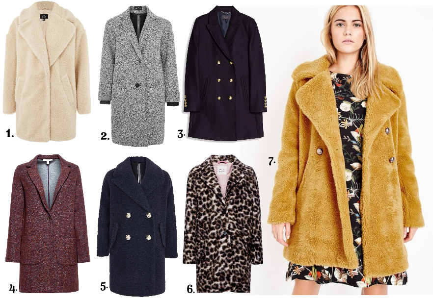 1. Manteau cocoon blanc - Topshop / 2. Long moucheté gris - Topshop / 3. Marine et boutons dorés - Esprit / 4. Bordeaux moucheté - Esprit / 5. Bleu à double rangée de boutons - Topshop / 6. Léo - Esprit / 7. Jaune poilu - New Look.