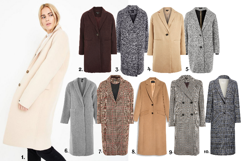 1. Rose pâle - New Look / 2. Bordeaux droit - Topshop / 3. Moucheté noir - New Look / 4. Camel - Topshop / 5. Gris moucheté - Topshop / 6. Façon peignoir gris - Topshop / 7. Tartan rouge - Topshop / 8. Camel - Esprit / 9. Manteau long imprimé carreaux - Topshop / 10 - Tartan bleu - Esprit.