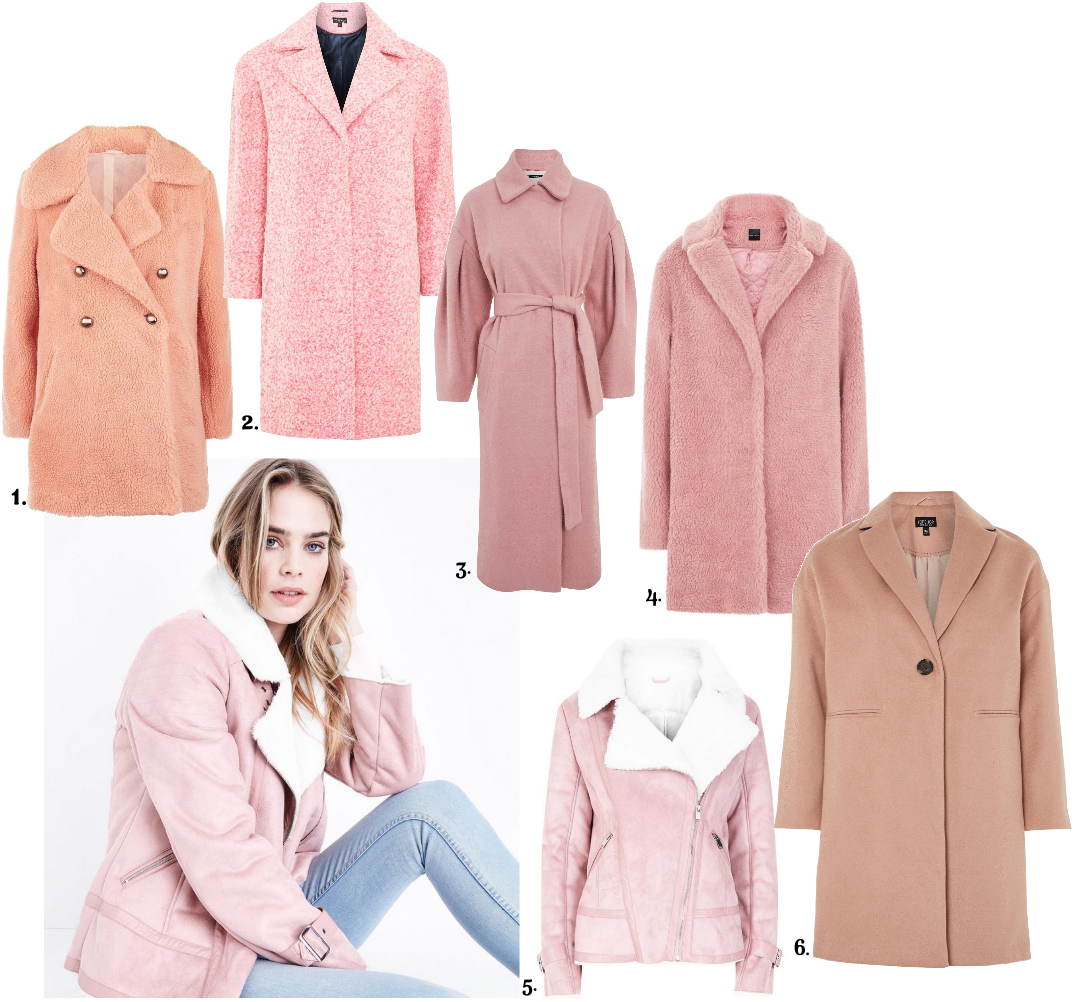 1. Manteau doudou rose - New look / 2. Rose moucheté - Topshop / 3. Trench - Topshop / 4. Manteau poils rose - New Look / 5. Bombardier rose - New Look / 6. Long manteau rose - Topshop.