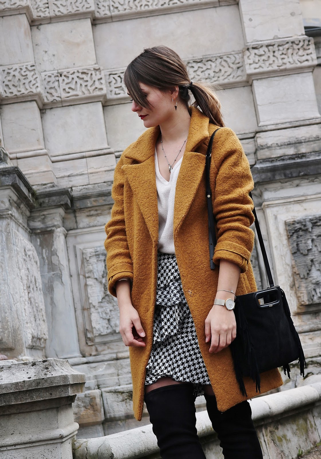 Ce manteau vient d'une ancienne co de chez Promod et il a déjà fait quelques apparitions par ici. Le moutarde ne va pas avec tout mais j'adore cette pièce. Sous le manteau, ma nouvelle jupe Asos, à l'imprimé pied-de-poule. Le lien est juste en dessous, dans le widget. En haut, un pull de chez PrettyWire avec le bout de la manche en lace-up. Ils viennent d'ailleurs de le ressortir en plusieurs coloris, et rayures, mais avec des boutons dorés à la place du lace-up (juste Ici). Les cuissardes viennent comme toujours de chez Jonak (je n'aurai jamais autant porté de cuissardes que cette saison ! Le prochain look n'y fera d'ailleurs pas exception), ce sont de vraies merveilles. J'attends deux nouvelles paires de chez eux, j'ai tellement hâte de vous les montrer ! Retrouvez juste ci-dessous le lien de la jupe et de pièces similaires à celles que je porte dans cette tenue :