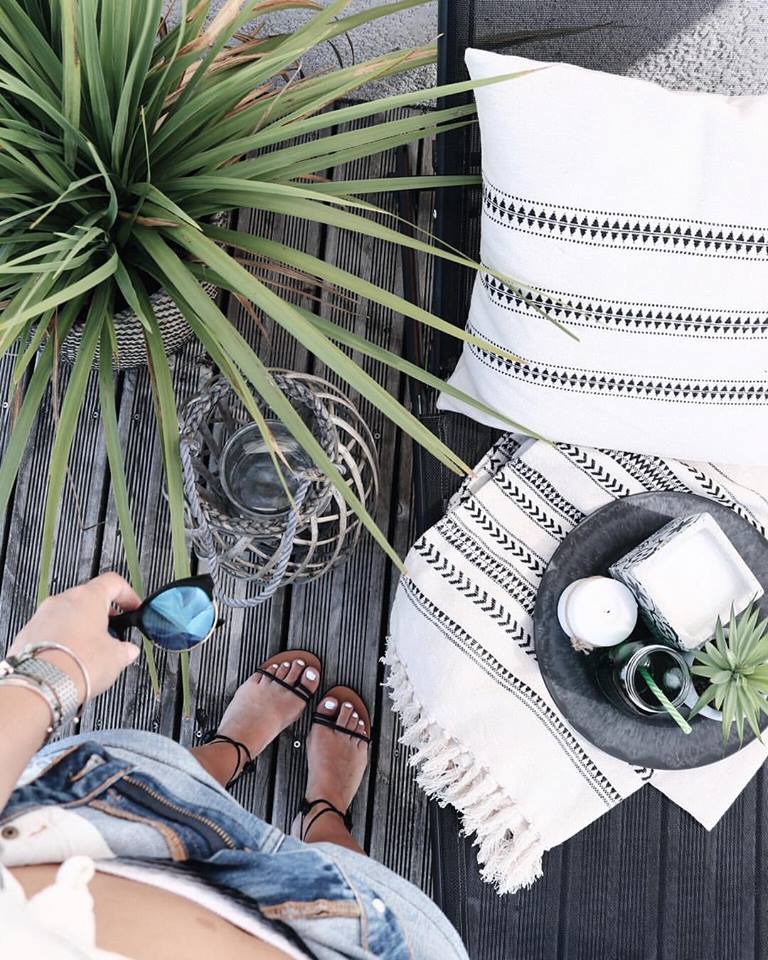 Hello tout le monde, cette année, c'est décidé j'aménage ma terrasse comme il se doit. J'ai envie de créer une ambiance cocooning, façon terrasse du sud, à l'inspiration bohème chic. Je trouve ça parfois compliqué d'aménager un espace vide, et de ne partir de rien. J'avais pour projet de trouver un joli salon de jardin, ou de le fabriquer avec des palettes (j'adore le rendu mais cette solution là est déjà vue un peu partout). Vu que la terrasse est grande j'avais envie de créer des "espaces" délimités : un coin salon d’extérieur, un coin repas, un espace détente avec des chaises longues. Et pour séparer la terrasse du jardin, trouver de grosses jardinières toutes en longueur avec à l'intérieur de hautes plantes au feuillage assez fourni. Tout cela reste un projet, mais les idées arrivent et se concrétisent petit à petit. En tout cas pour l'instant je fouille les e-shops et j'ai eu envie de vous faire profiter de mes coups de cœur et trouvailles sur différents sites.