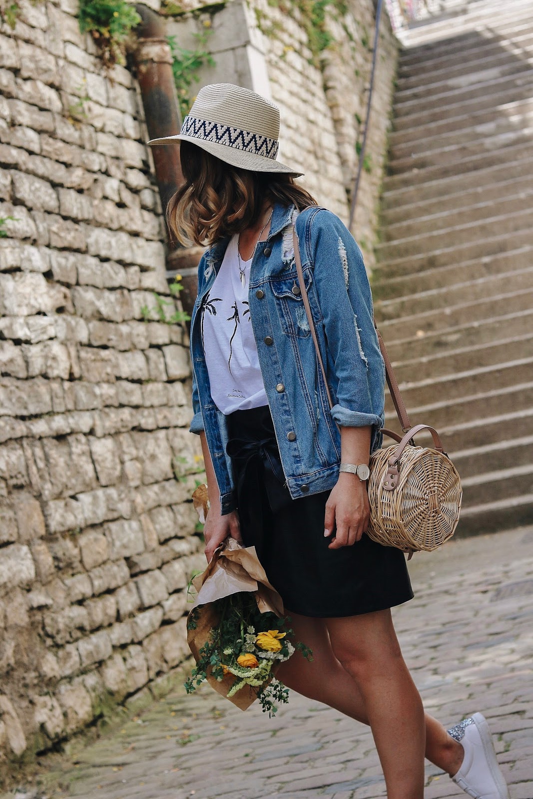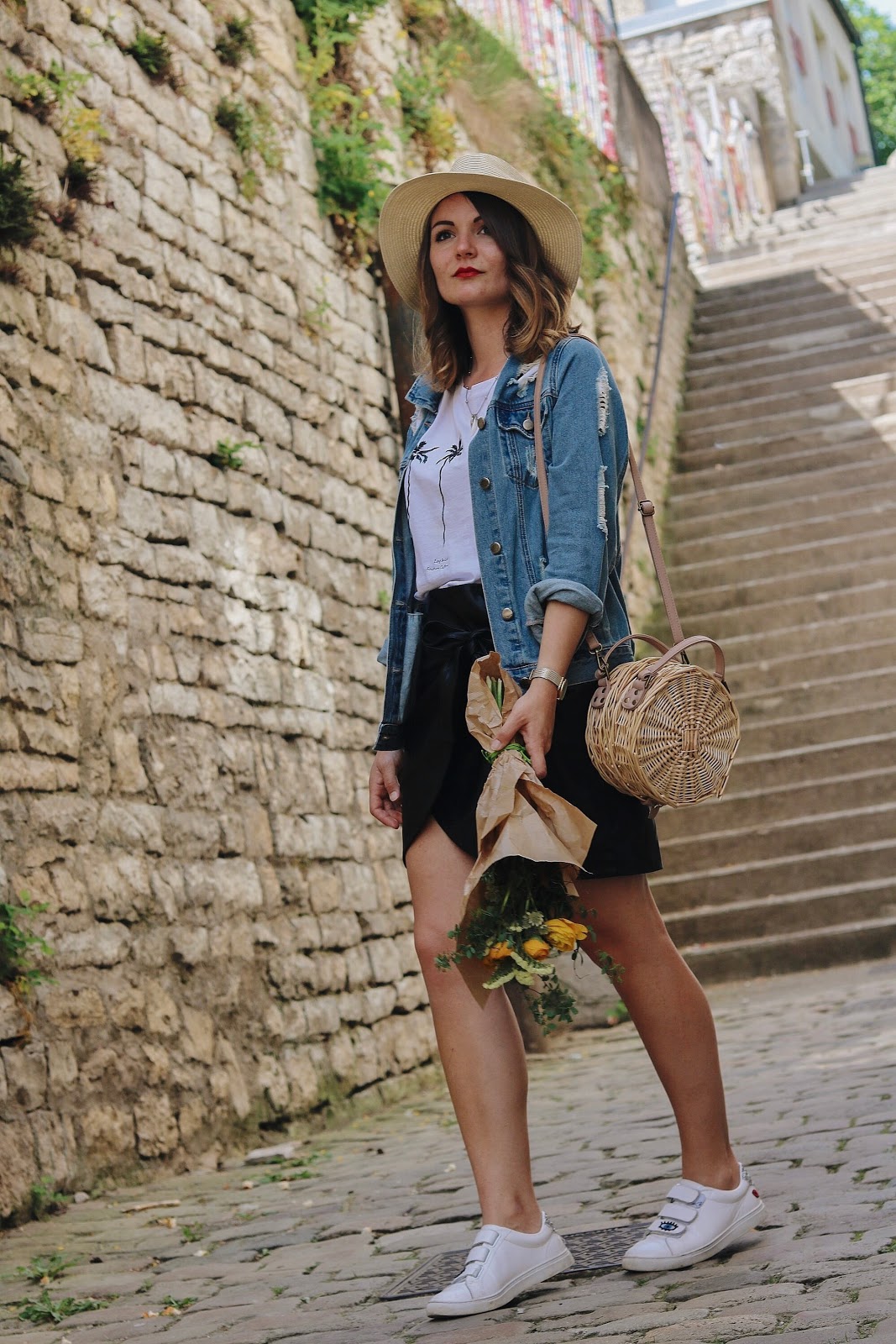 Au niveau du look, vous pouvez retrouver les liens du haut, du sac et de la jupe dans le widget juste ci-dessous. La jupe est géniale, c'est une Mango qui se noue avec un gros noeud en cuir et j'adore sa coupe un peu garçonne. Je vous conseille aussi totalement le tee-shirt, qui ne coûte que 13 € et quelques et qui est canon : les inscriptions sont brodés dans le coton et il y a quelques paillettes noires sur les palmiers. J'adore le match des deux qui donne vraiment une tenue cool mais sans prise de tête. Des sneakers ou une paire de boots cloutées aux pieds, et un sac rond : on tient la tenue confort par excellence.