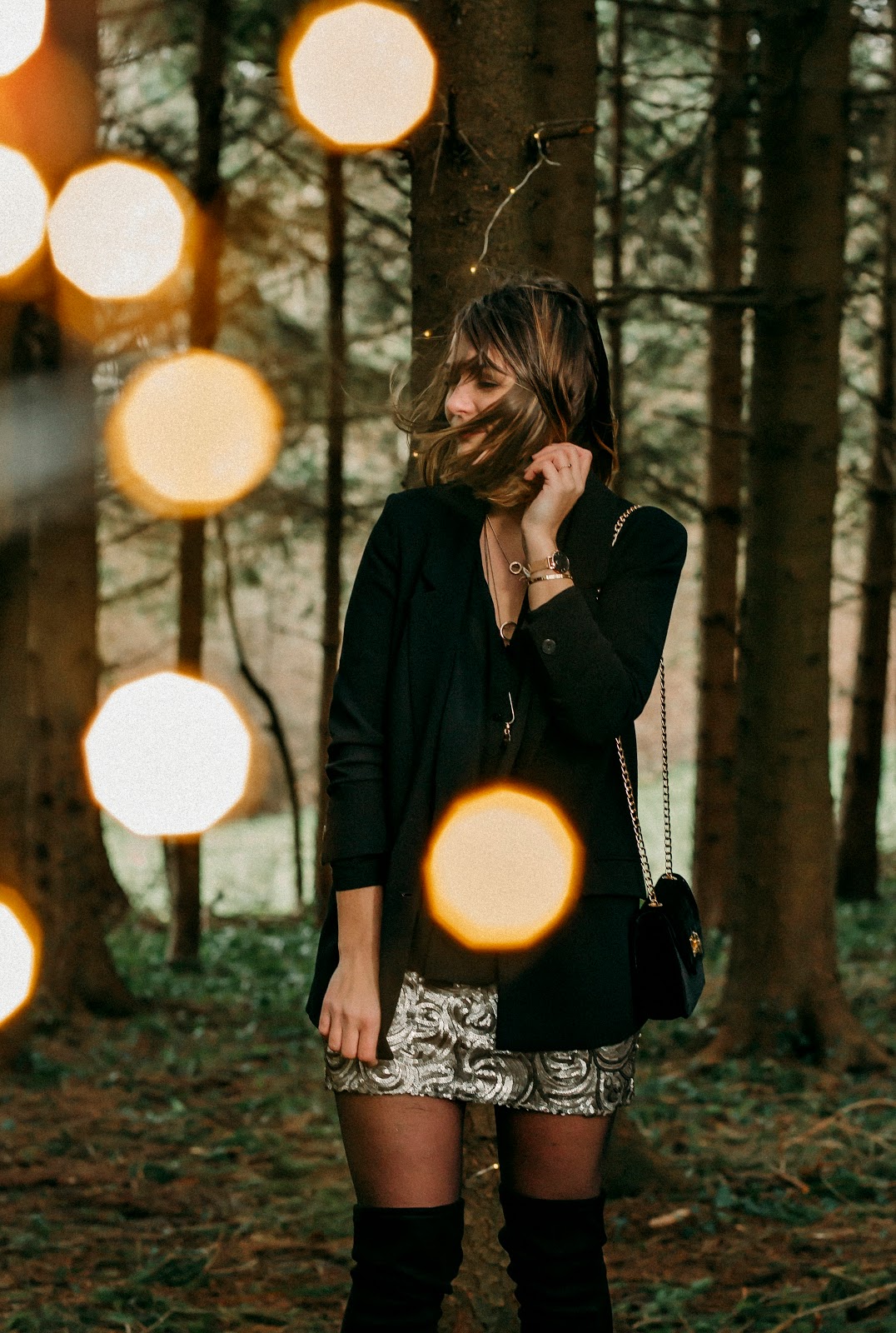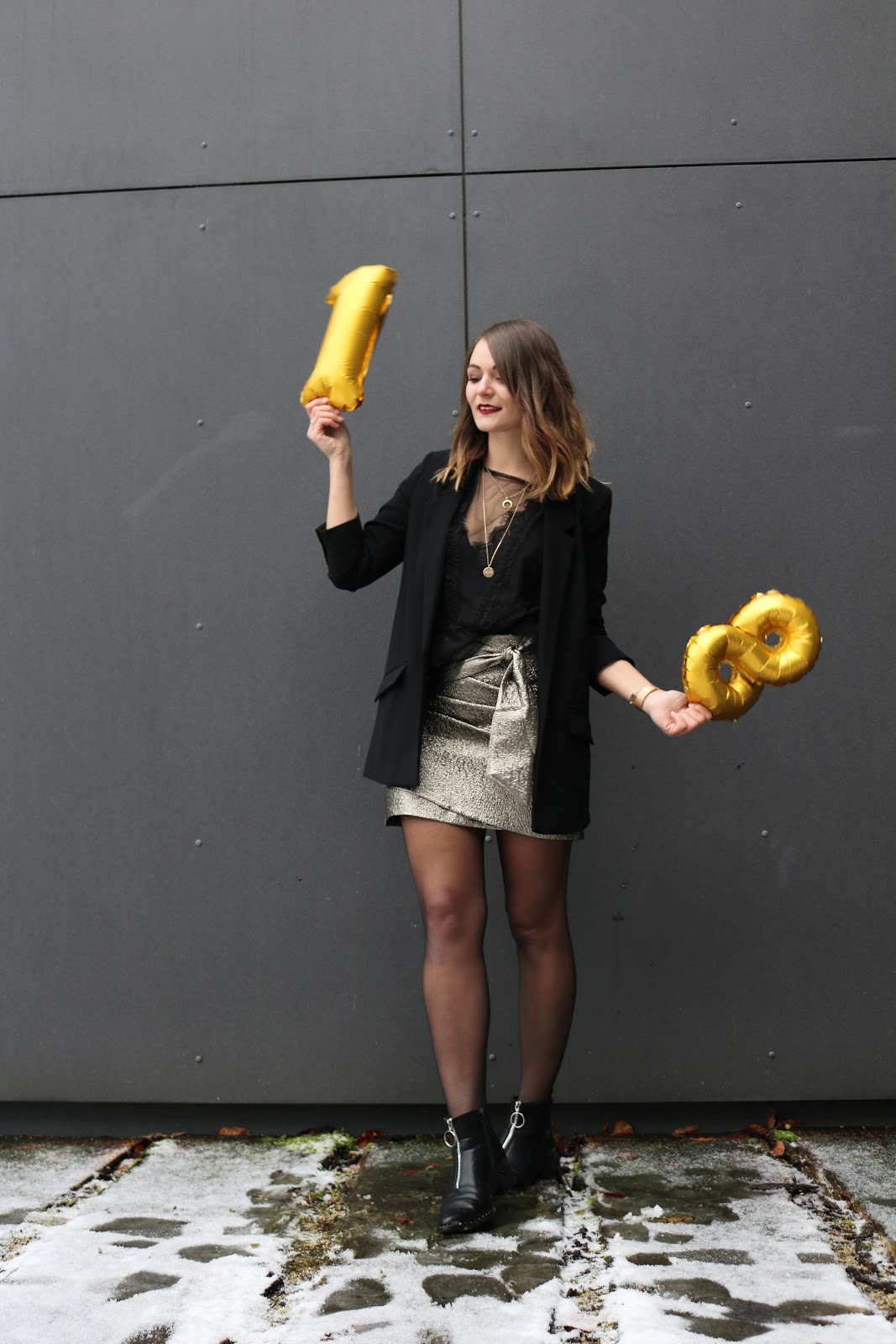 BODY DENTELLE NOIR - ZAFUL / JUPE DORÉE - MANGO / BLAZER LONG - MANGO / TOP TRANSPARENT - H&M / COLLIERS - JOLIE DEMOISELLE / BOTTINES - KIABI.