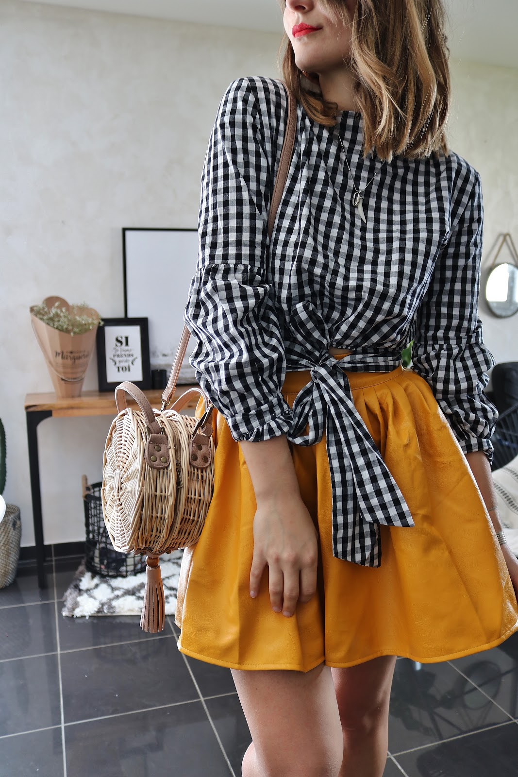 TOP VICHY - JINZA SHOP / JUPE PATINEUSE SIMILI - JINZA SHOP / PERFECTO VERT - NA-KD / SAC NOIR - CLAUDIE PIERLOT / BASKETS - BONS BAISERS DE PANAME.