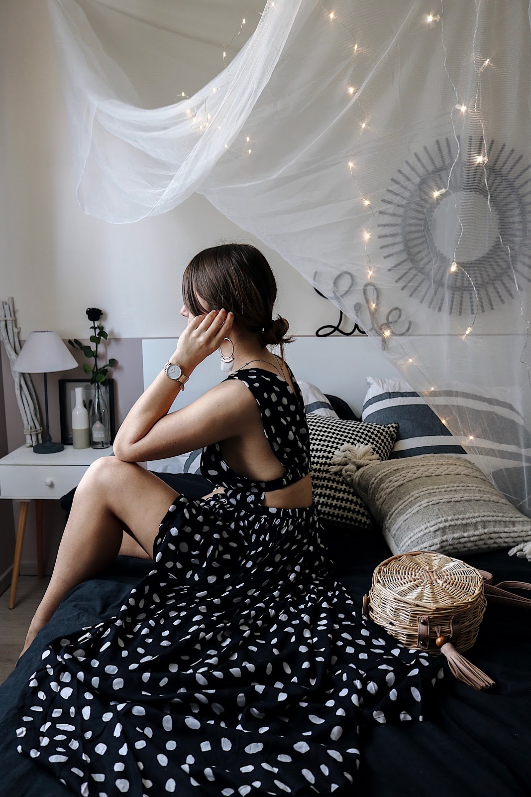 ROBE À POIS - ASOS / VESTE EN JEAN - BOUTIQUE AKTUEL / SAC ROTIN ROND - MYROUNDBAG / SNEAKERS - PUMA HEART VIA LGD SHOES.