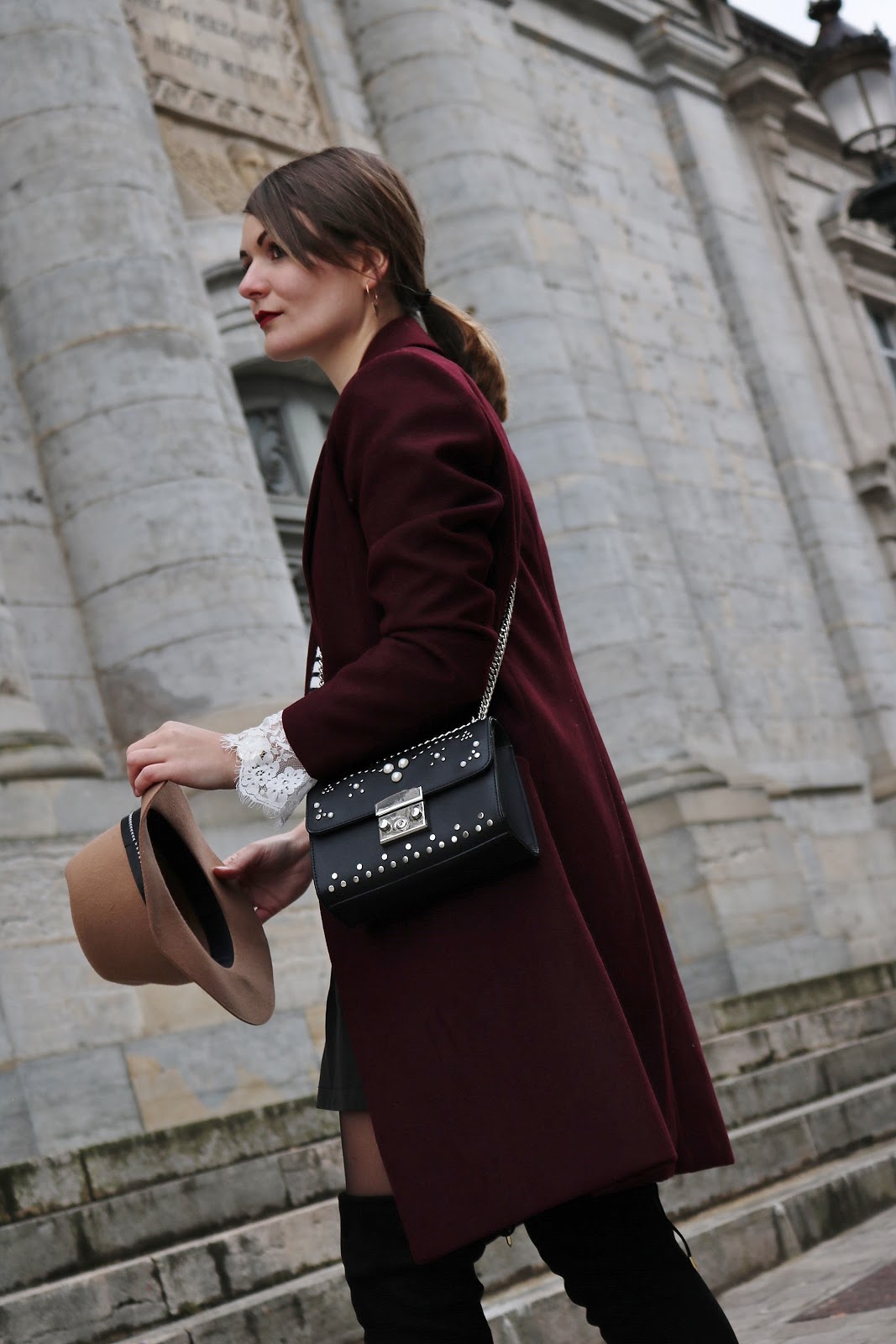 MANTEAU BORDEAUX - KIABI / PULL - BUBBLEBEADOFF / JUPE - VERO MODA / CUISSARDES - JONAK / SAC - BERSHKA / CHAPEAU - PIMKIE.