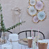 Pour la déco murale, j'ai complètement craqué sur l'attrape-rêve. J'aime le petit côté naturel mais très délicat qu'il apporte ici. Finalement je l'ai laissé au mur et je pense qu'il va désormais rester sur ma terrasse. J'avais aussi repéré depuis un sacré moment ces grands ronds dorés et pastels, qui habillent pour le coup le mur à la perfection. Pour les attacher j'ai utilisé des petits clous, et des ficelles transparentes qui étaient fournies.