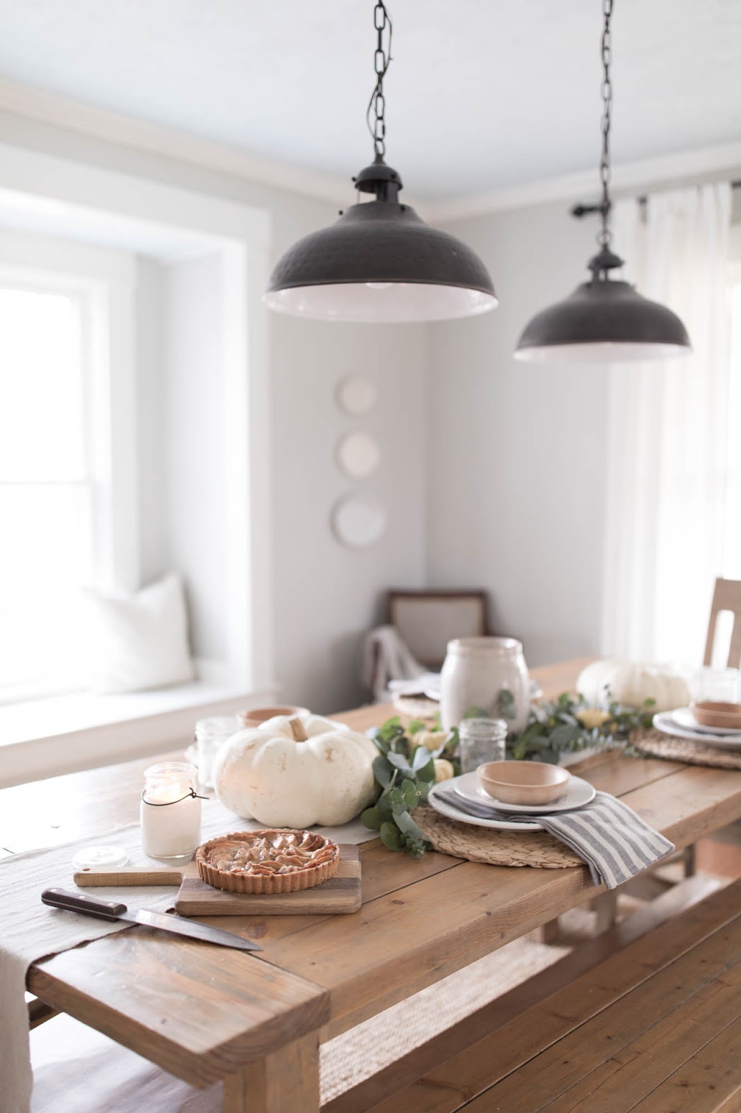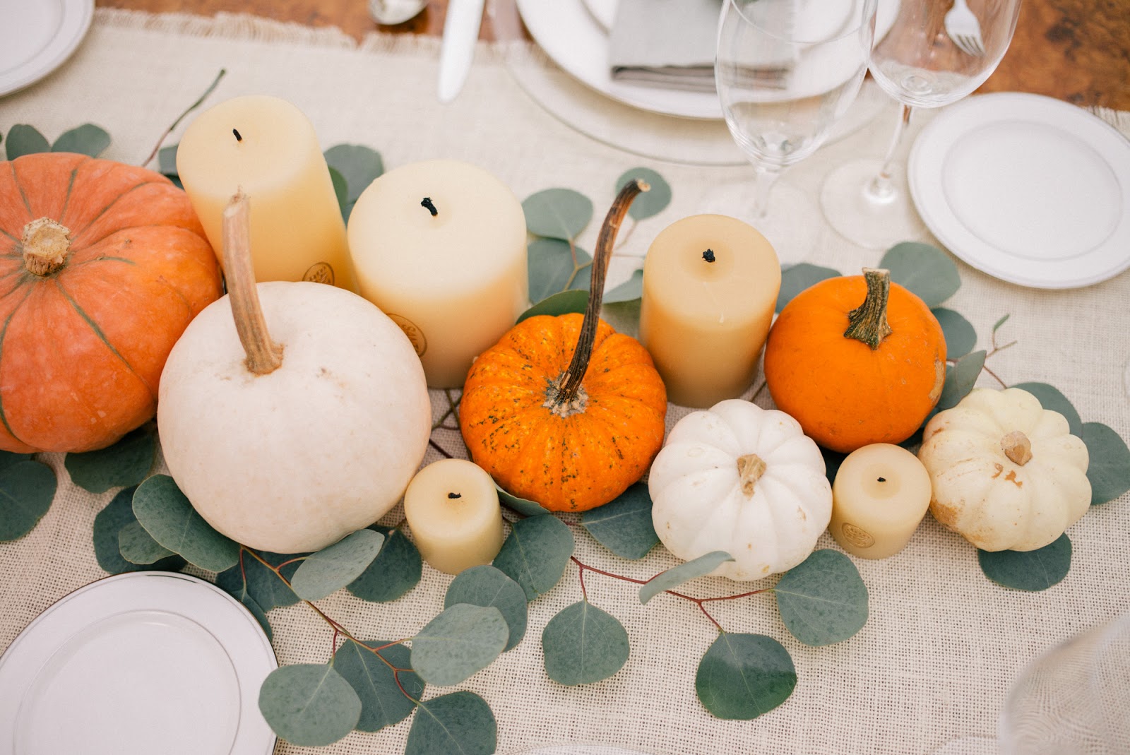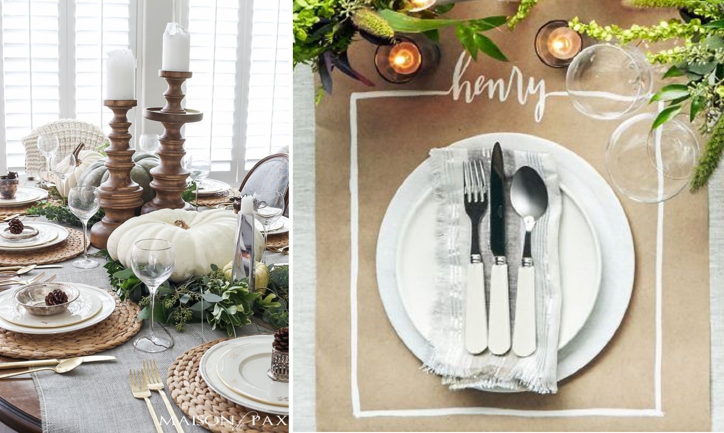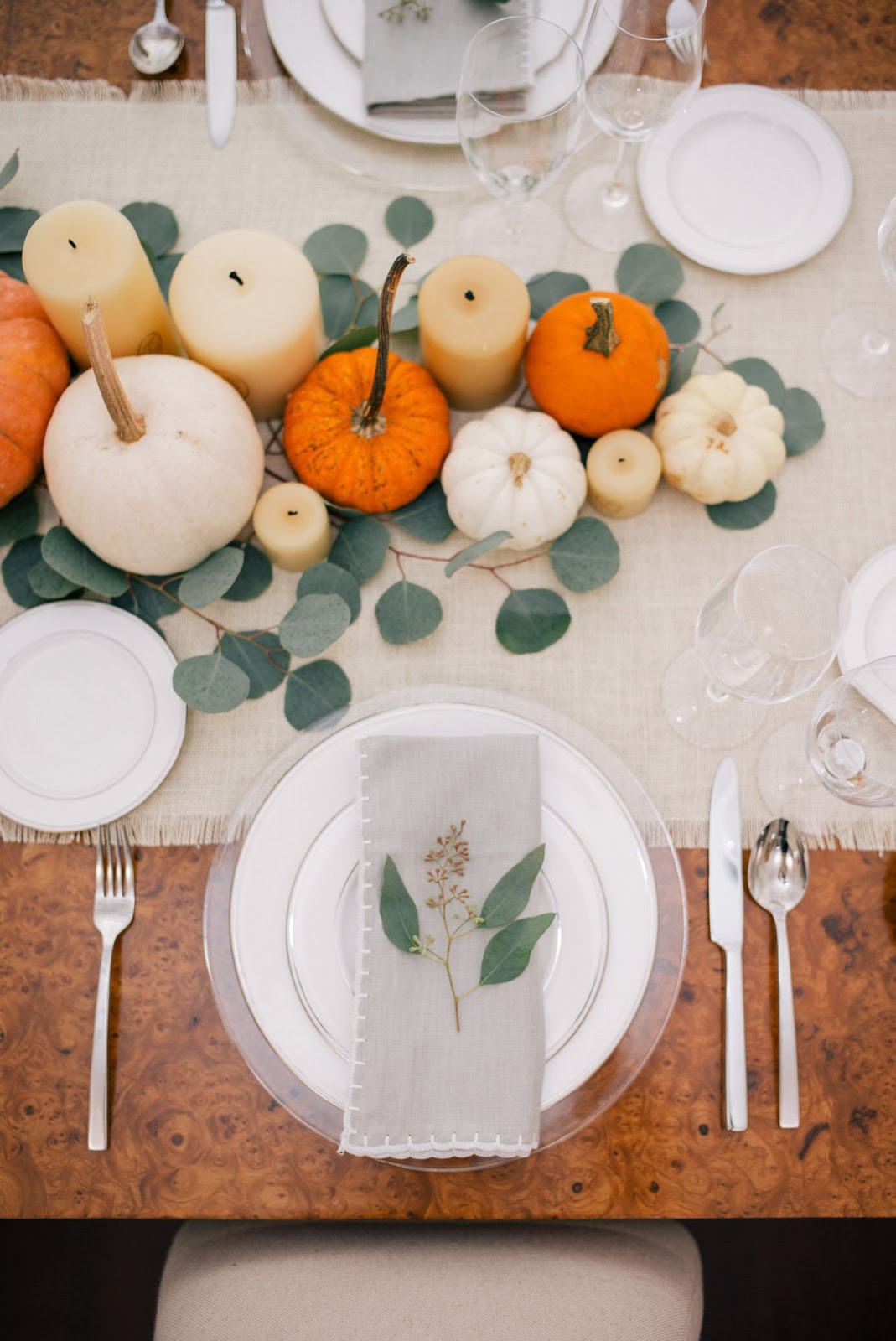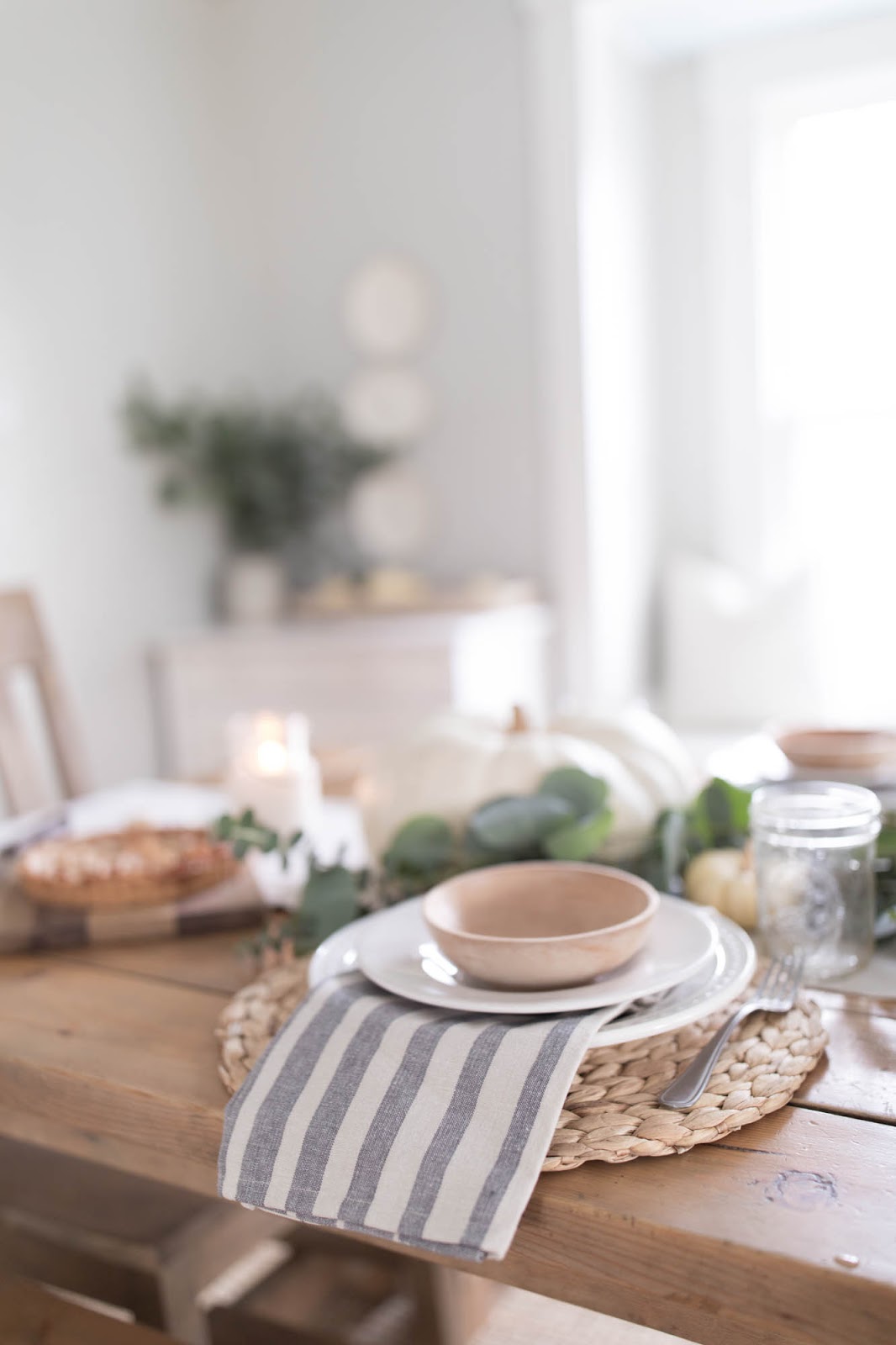 Rien à dire, la simplicité de cette table en jette : un chemin en eucalyptus, deux grosses citrouilles blanches, des dessous d'assiettes Ikea tressés et la touche qui fait tout : ces serviettes rayées en tissu.