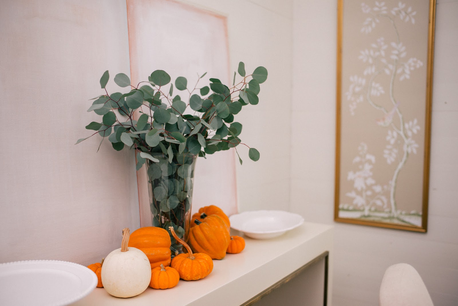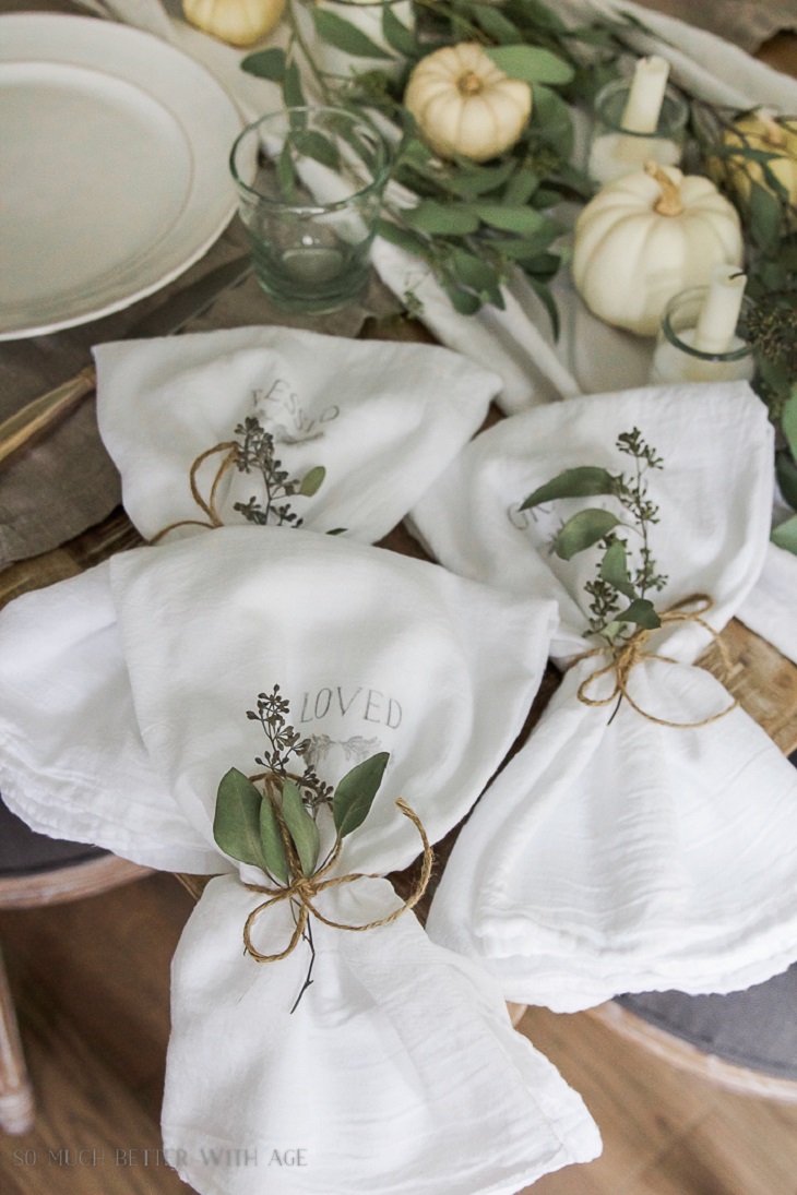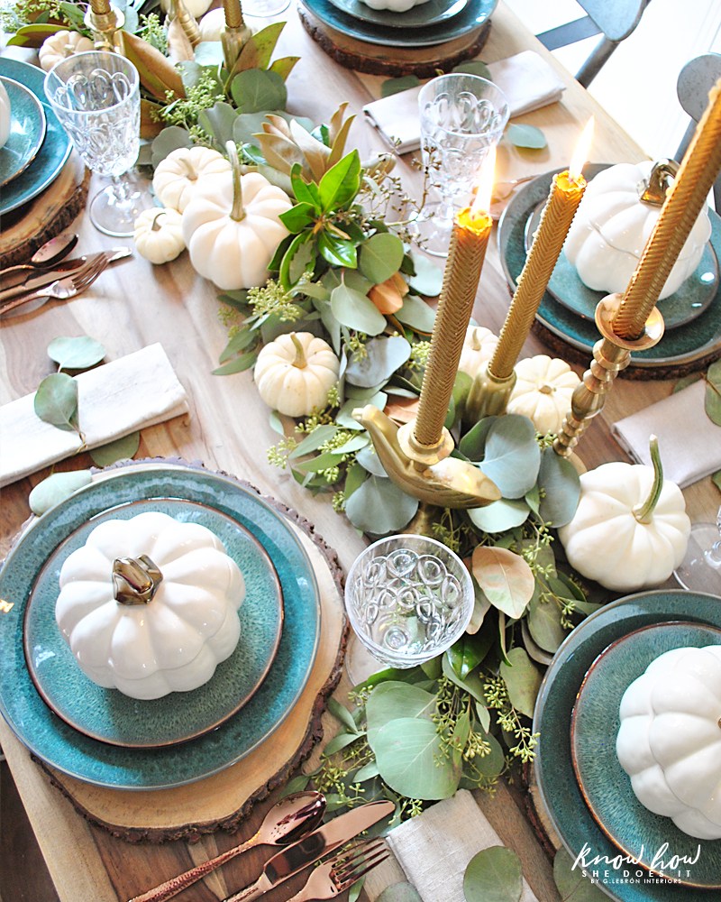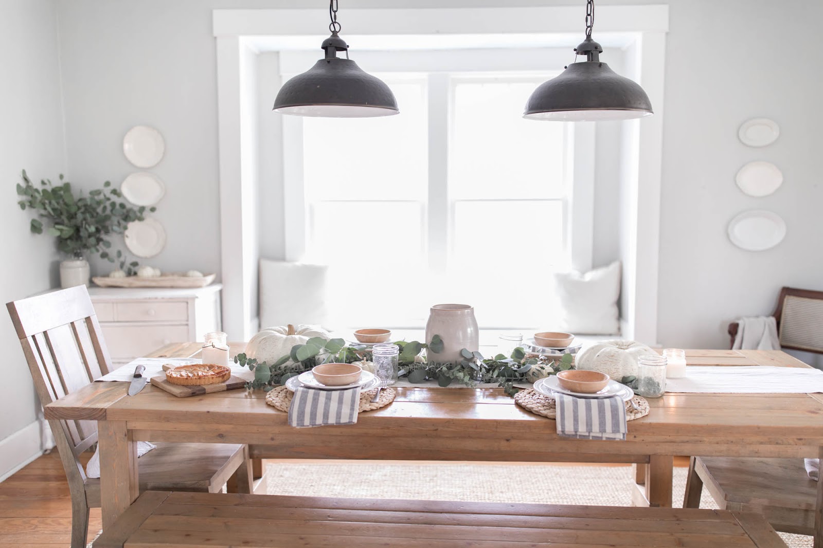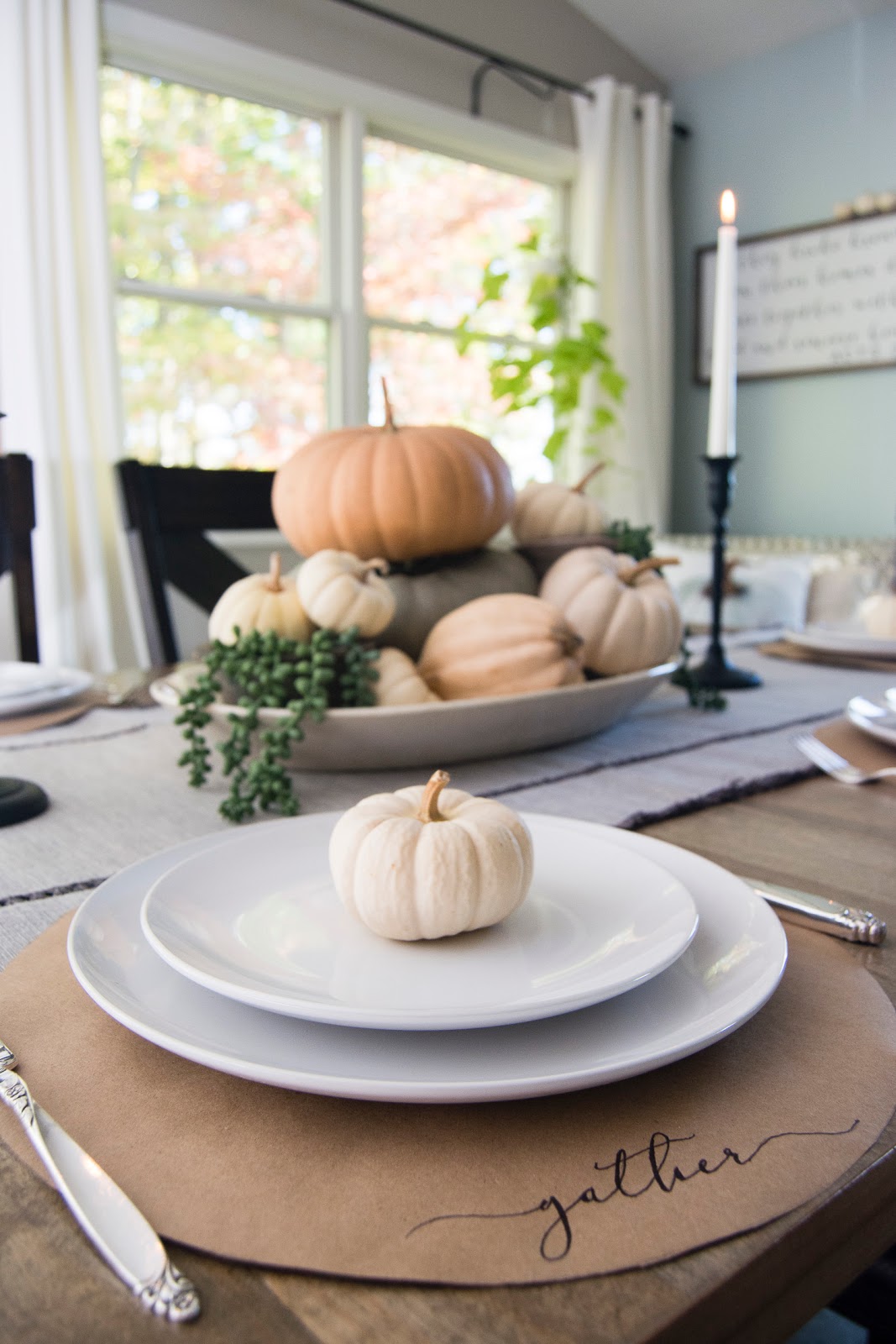 Rien à dire, la simplicité de cette table en jette : un chemin en eucalyptus, deux grosses citrouilles blanches, des dessous d'assiettes Ikea tressés et la touche qui fait tout : ces serviettes rayées en tissu.
