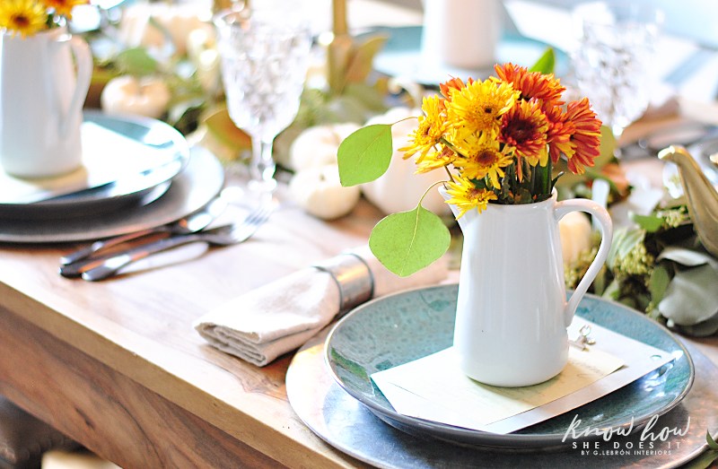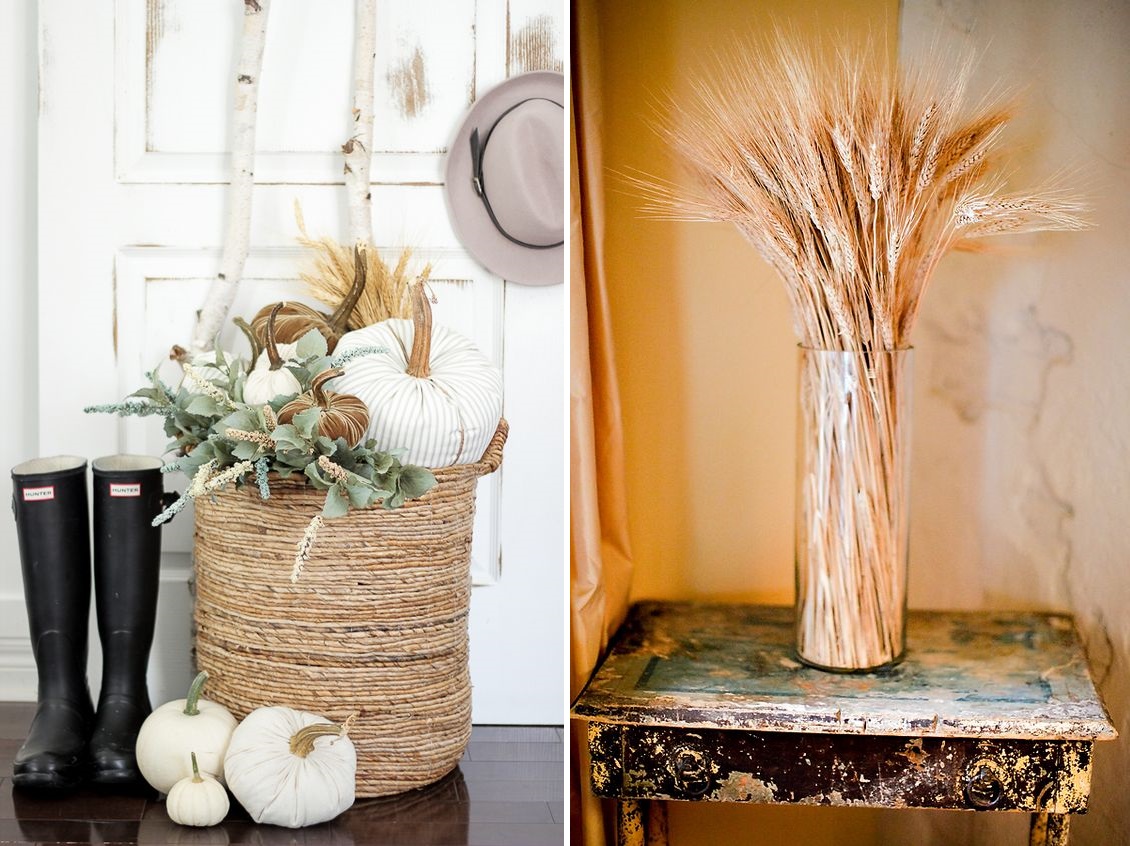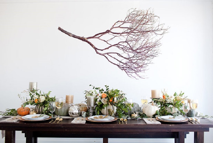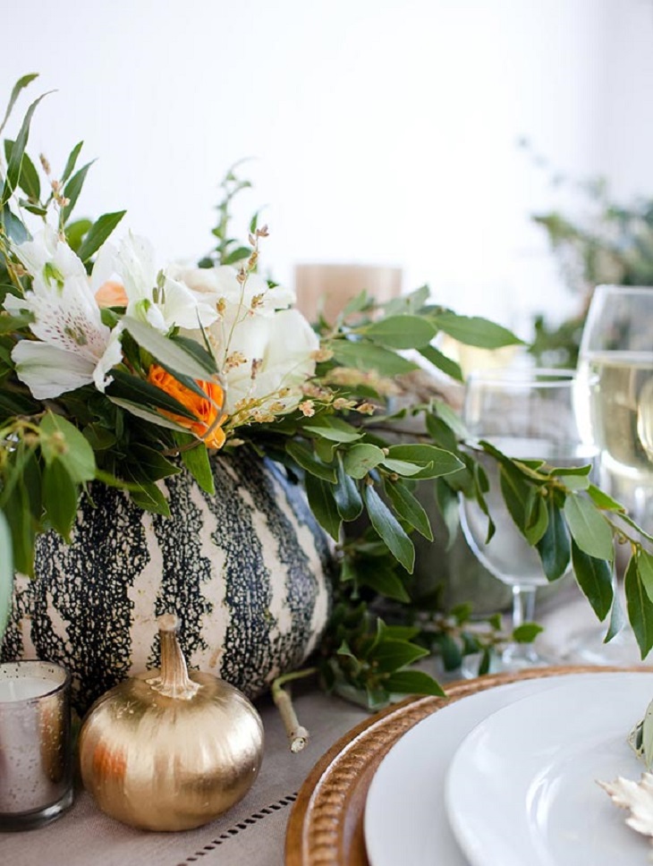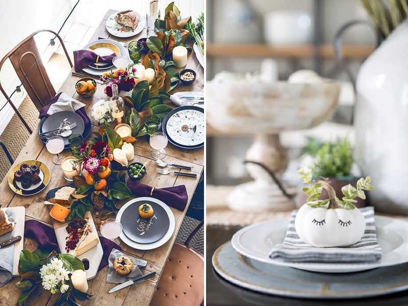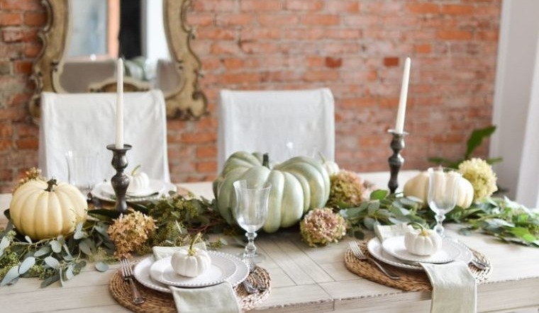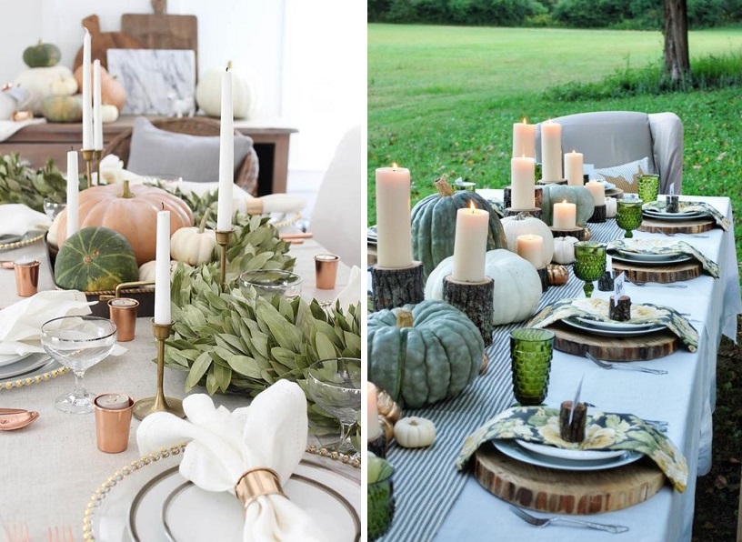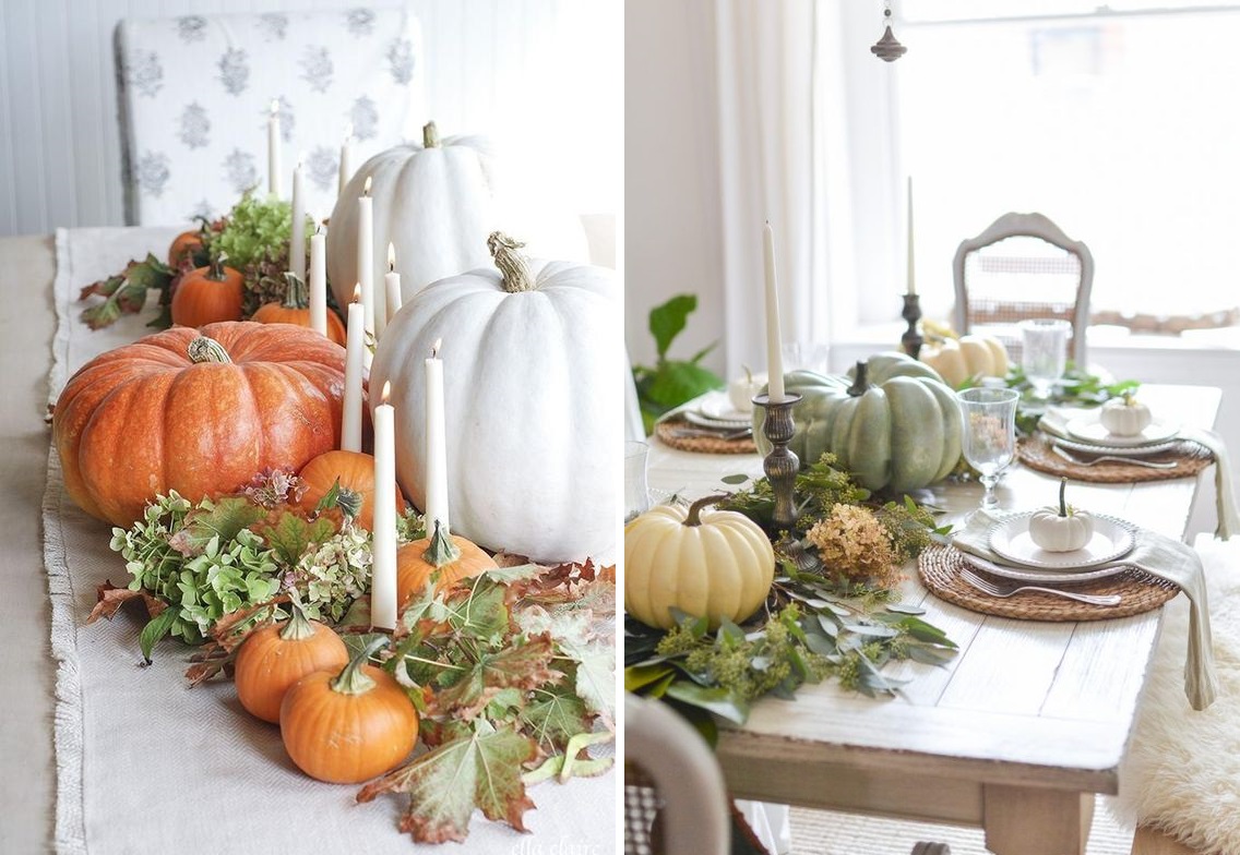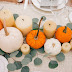 Les centres de table avec citrouilles sont l'idée numéro 1 des tables d'Halloween et de Thanksgiving. Elles sont la plupart du temps associées à des chemins de tables ou des nappes clairs, voir directement posées sur la table en bois.