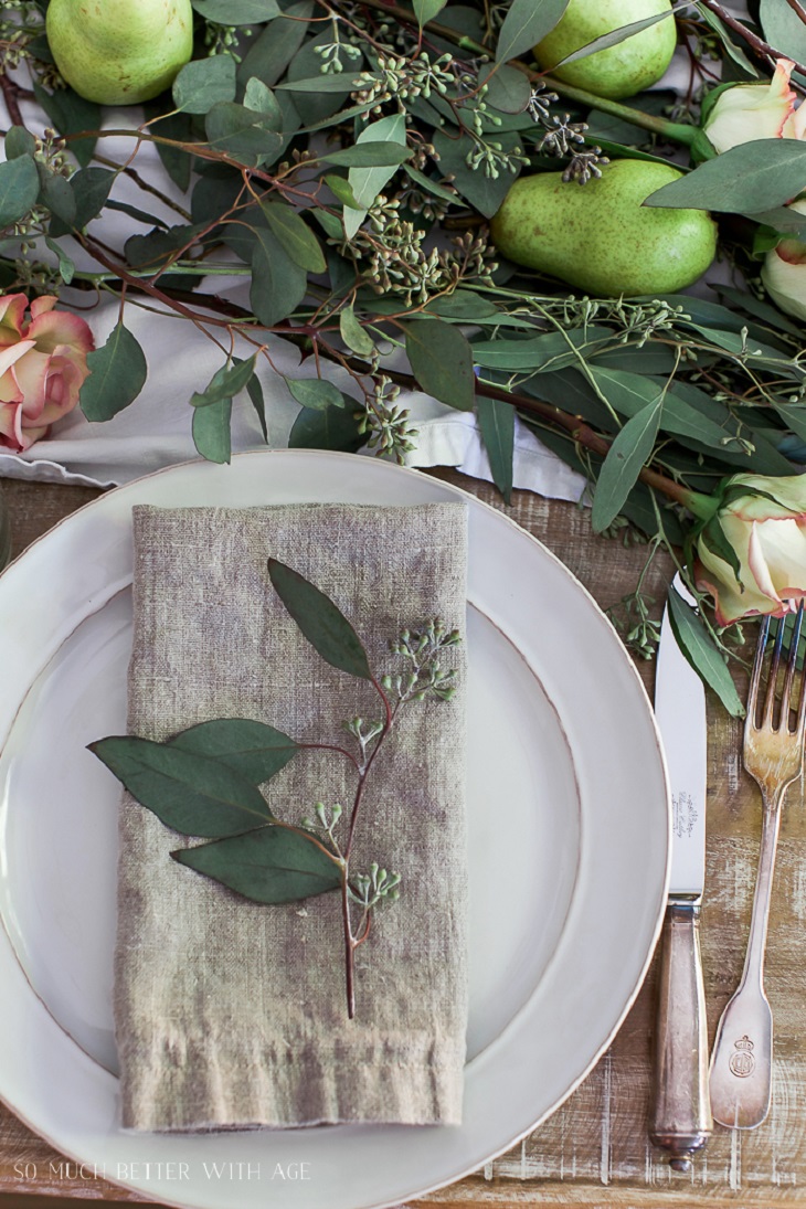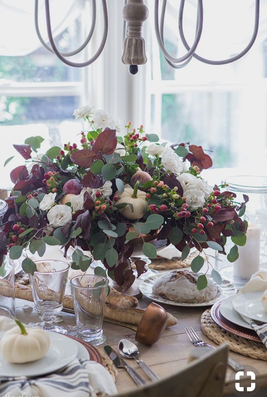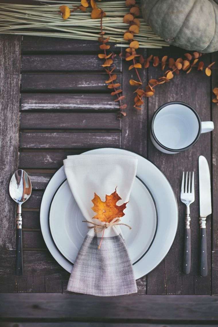 Pour rappeler l'automne on peut miser sur des élèments naturels comme les feuilles d'arbres ou les pommes de pin. La vaisselle blanche à liseré est une super idée, comme les serviettes en lin et le vieux volet en table en bois.