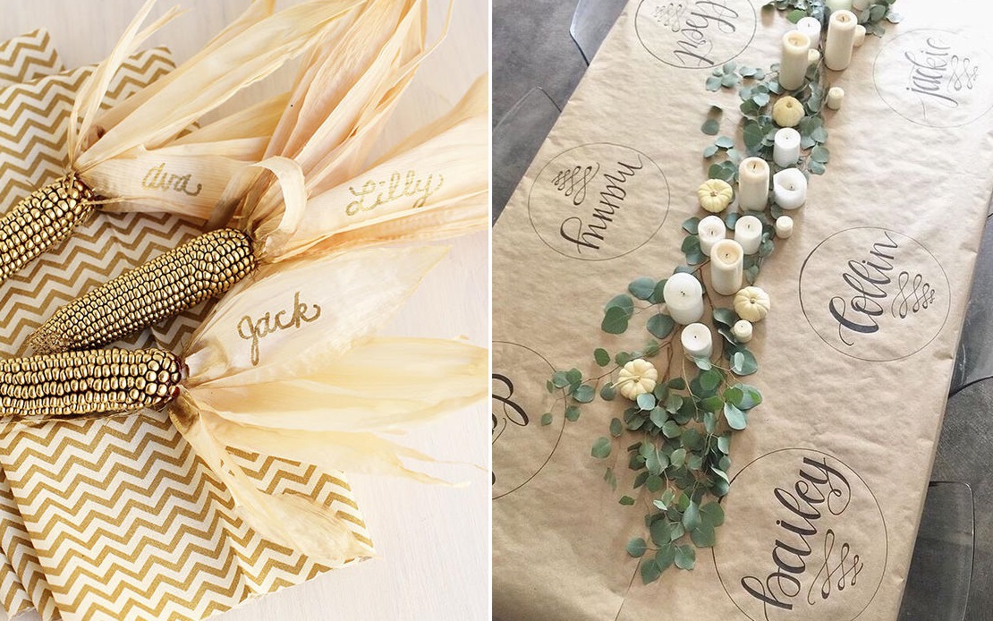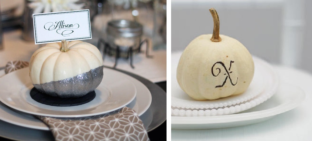 Autre idée à retenir : la petite citrouille dans l'assiette. On peut y inscrire le nom de l'invité au marqueur ou sur une petite étiquette qu'on accroche à la tige ou qu'on pose en dessous. Cliquez sur la source, vous tomberez aussi sur un DIY pour faire ses desssous d'assiettes en carton à moindre coût.