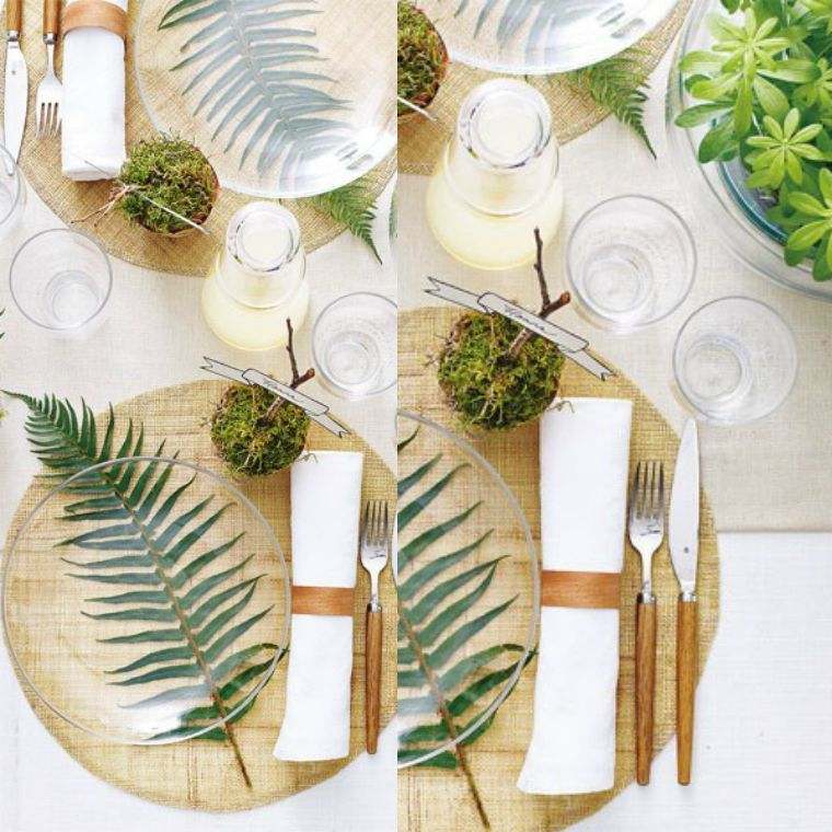 Toujours dans la lignée du naturel, une feuille et une assiette transparente, et un petit pot rempli de mousse en tant que marque-place.