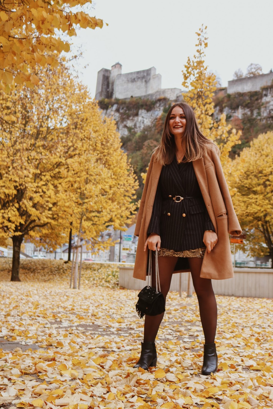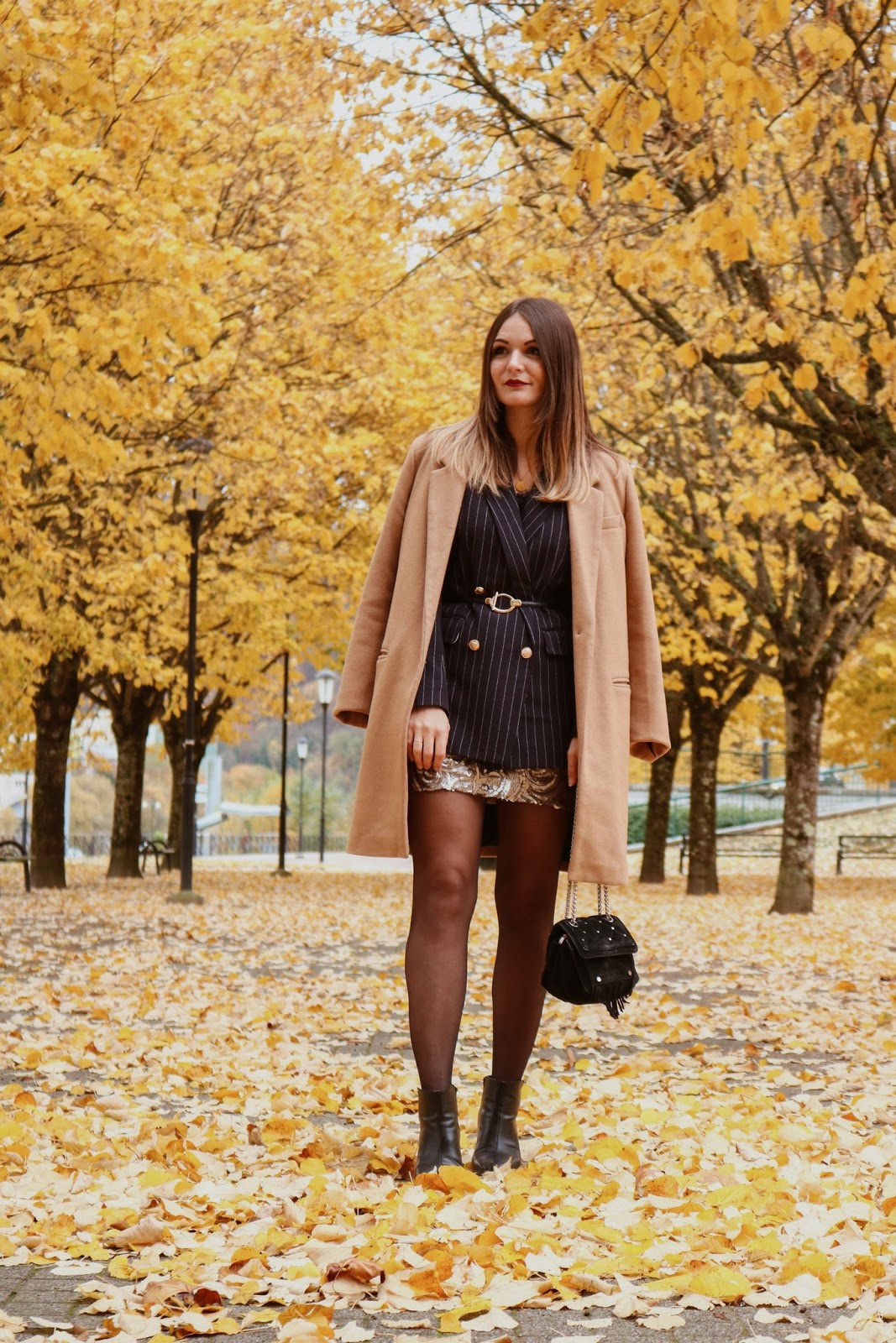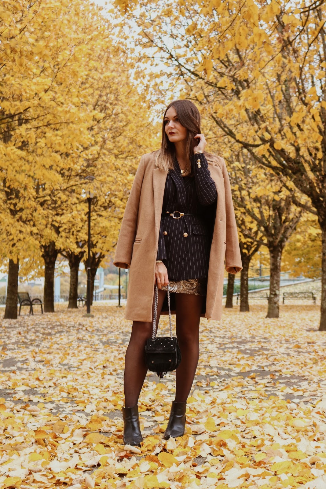 MANTEAU - PIMKIE / BLAZER - H&M / CEINTURE DOREE - SHEIN / JUPE - MANGO OUTLET / BOTTINES - H&M / SAC - CLAUDIE PIERLOT