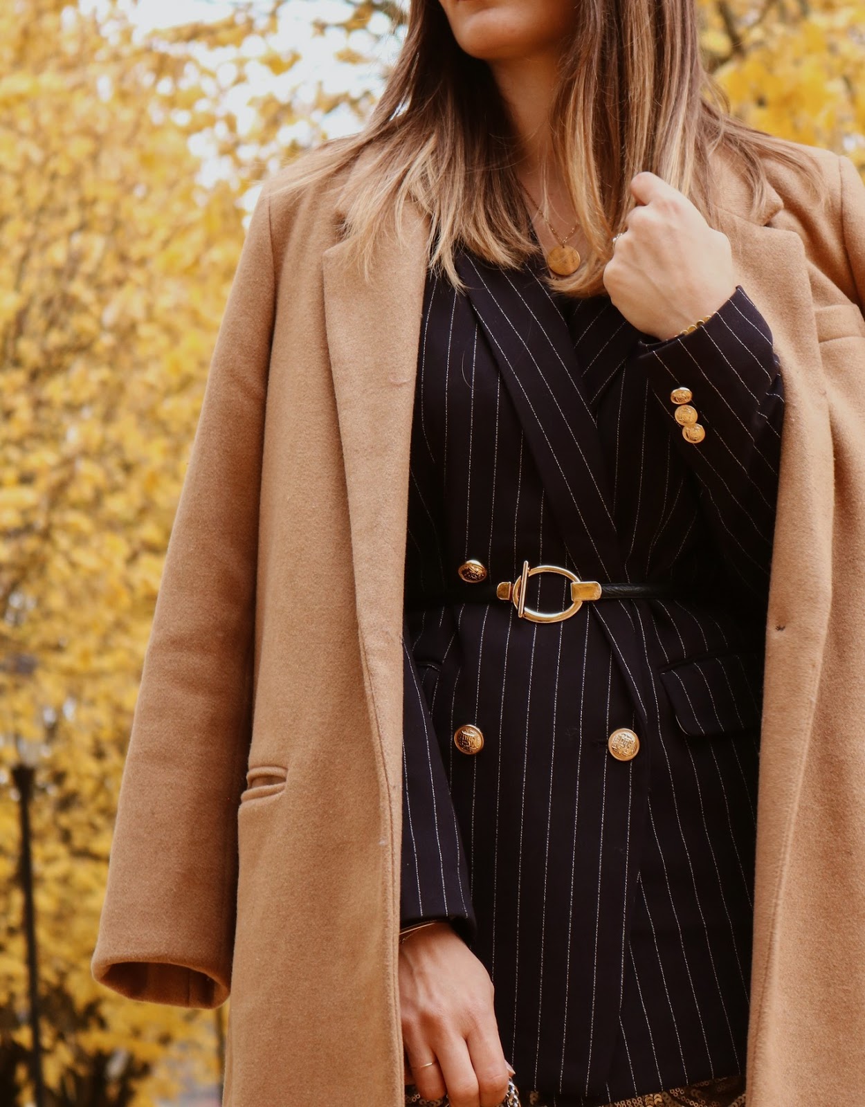 Hello tout le monde, je reviens aujourd'hui avec une tenue de saison. Je crois que visuellement l'automne est vraiment la saison que j'aime le plus. J'en ai pris plein les yeux ce week-end avec toutes les feuilles qui sont entrain de tomber et de recouvrir le sol de ce mélange de jaune, d'orange et de brun. Niveau tenue, j'ai sorti cette veste H&M de la nouvelle co, que j'ai ceinturée avec une ceinture dorée Shein. Elle se resserre à l'arrière et convient donc pour toutes les tailles, je vous la recommande à 100 %. Bizarrement j'ai toujours eu du mal à associer le bleu marine.. Je n'aime pas le porter avec du noir et je n'avais pas vraiment de pantalon beige ou clair dans mon dressing. C'est là que je suis tombée sur cette jupe dorée que j'ai shoppée il y a déjà plusieurs années chez Mango Outlet et ça a fait le déclic : quoi de plus joli que le bleu et le doré ?!