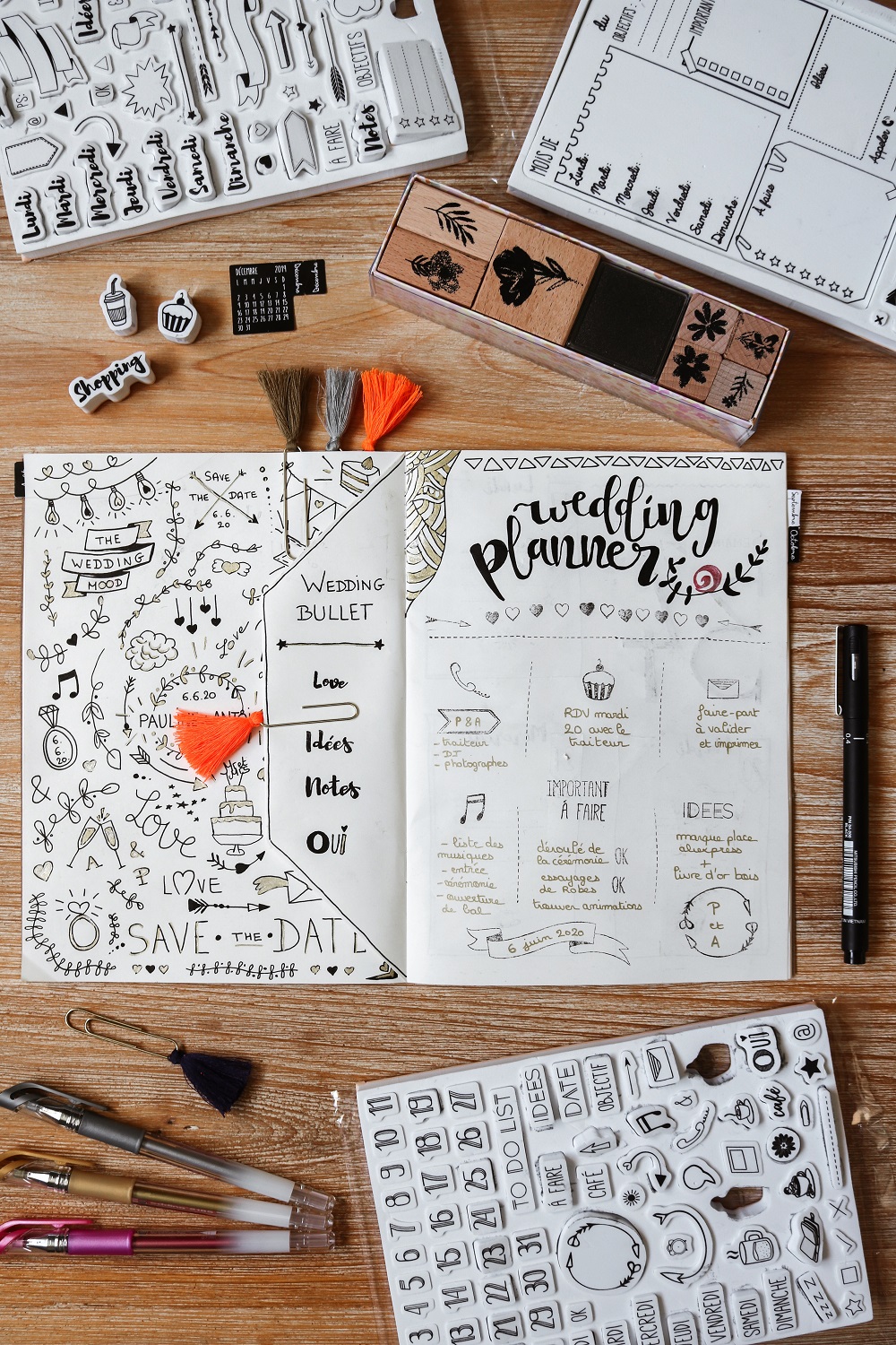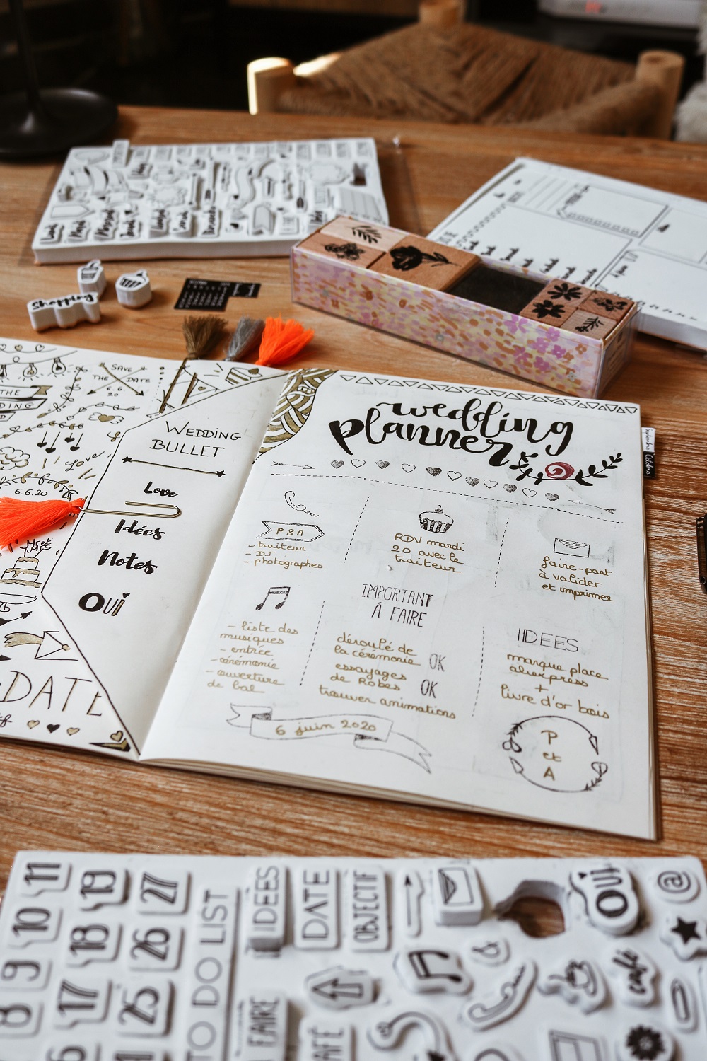 Toute la structure de la première page a été faite avec un tampon géant qu'on voit juste derrière le carnet sur cette photo. Il vous suffit donc ensuite de compléter les cases, c'est super pratique !