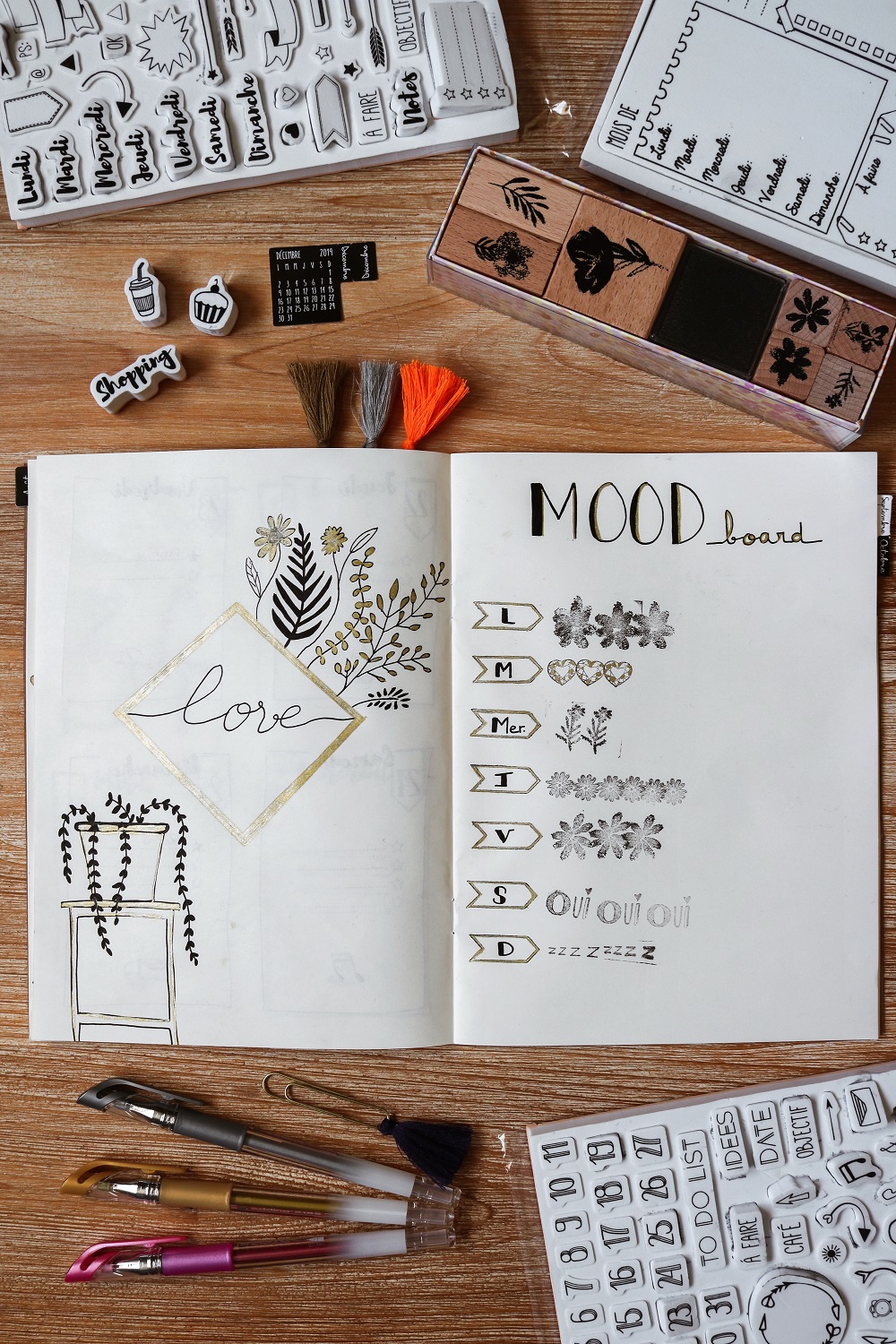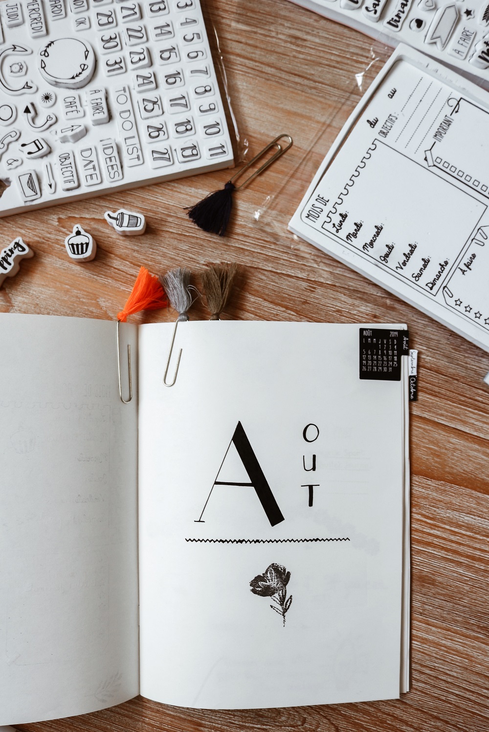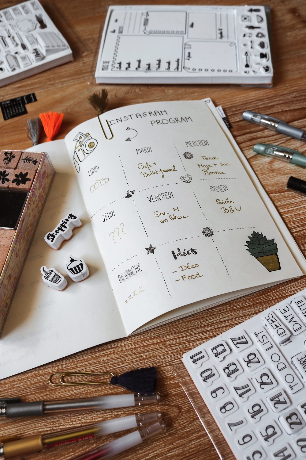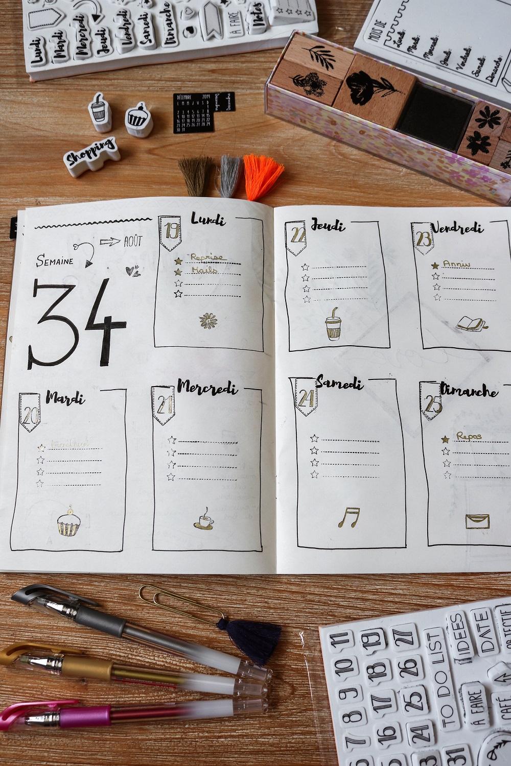 Dans le Bullet Journal on retrouve en général des agendas de ce type pour inscrire ses rendez-vous, ses to-do list. Ça peut vite être pénible d'inscrire à chaque fois les jours, la date.. Je vous conseille donc de vous procurer quelques stickers ou tampons encreurs pour le faire un peu plus rapidement. Essayez de vous procurer au moins les basiques : les jours, les chiffres, les mois et quelques signes ou banderoles.