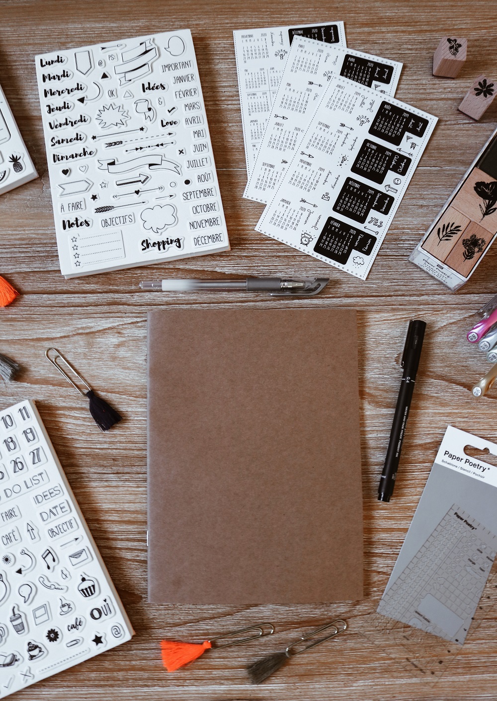 Le site Creavea m'a proposé de tester ses produits, notamment ceux de la catégorie planner, tampon, encreur... Avec un budget de 50 €, j'ai décidé de commander les essentiels à la réalisation de ce journal : un petit carnet A5 en kraft, quelques stickers calendriers, plusieurs planches de tampons, un pochoir, des trombones avec des pompons pour marquer les pages, de jolis stylos métalliques et un stylo noir à la pointe fine qui a servi à remplir presque 80 % du carnet.