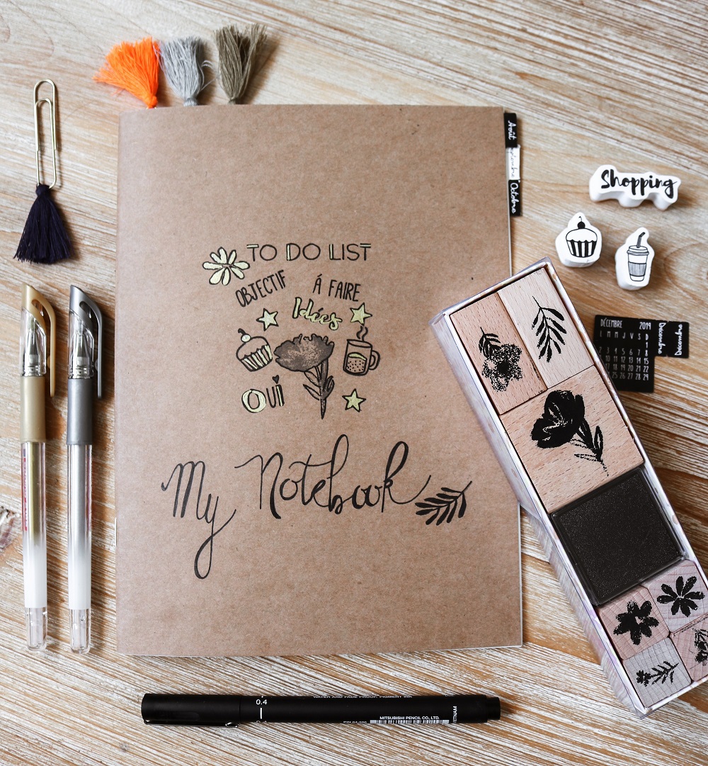 Le carnet, prêt à être rempli. À partir de là, j'ai foncé sur Pinterest, qui recense des milliers de photos de Bullet Journal, certains comptes sont même devenus célèbres dans cette catégorie. Une vraie communauté du BJ s'est développée ces dernières années et voir les photos donne vraiment envie de s'y mettre aussi. Pas besoin d'être doué en dessin pour se lancer, il suffit de savoir tracer des traits, écrire et de se servir comme moi de jolis tampons. Des petits tutos sur Pinterest expliquent même pas à pas comment dessiner de petits objets comme des ampoules, des appareils photos, des plantes...