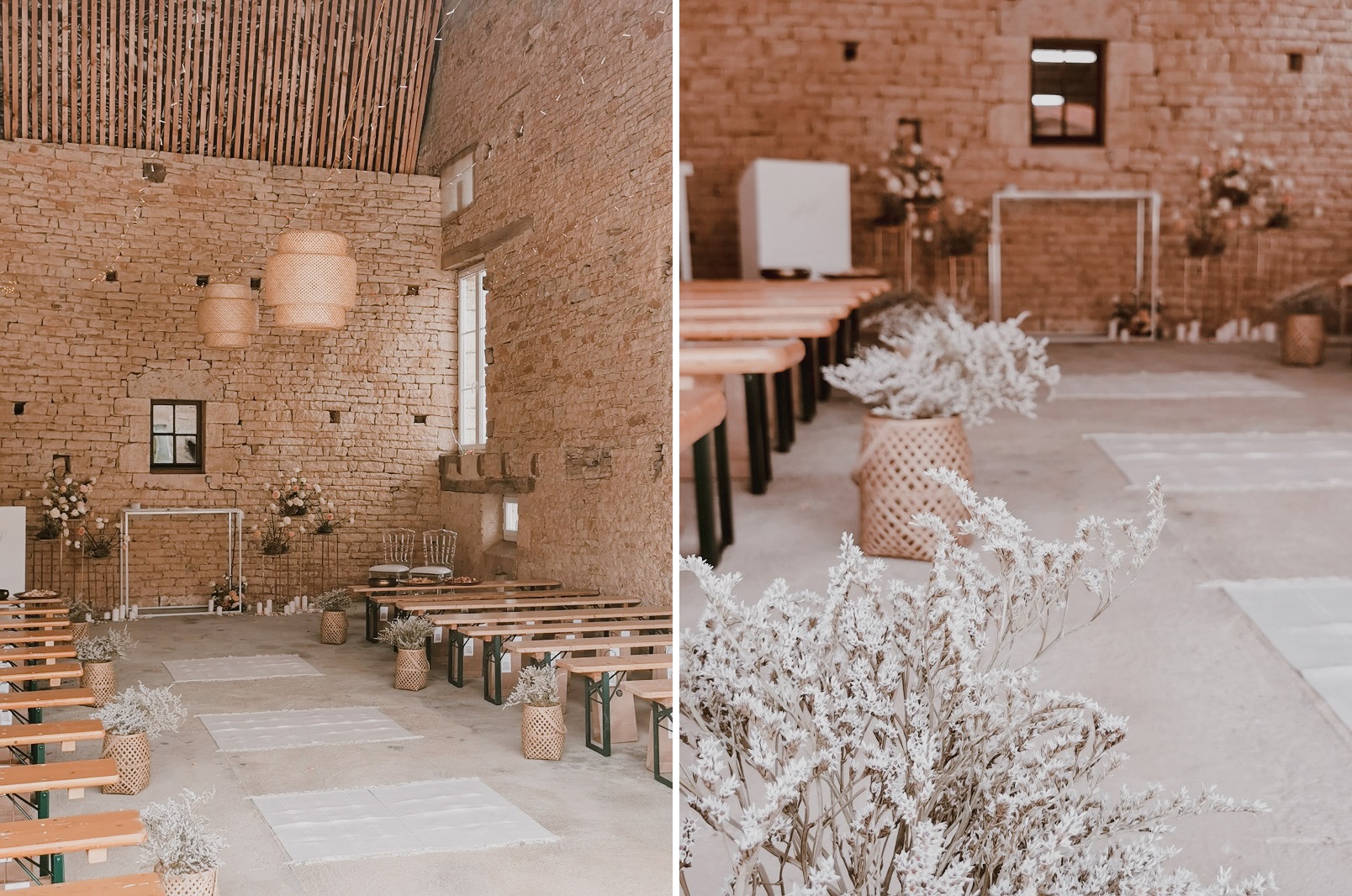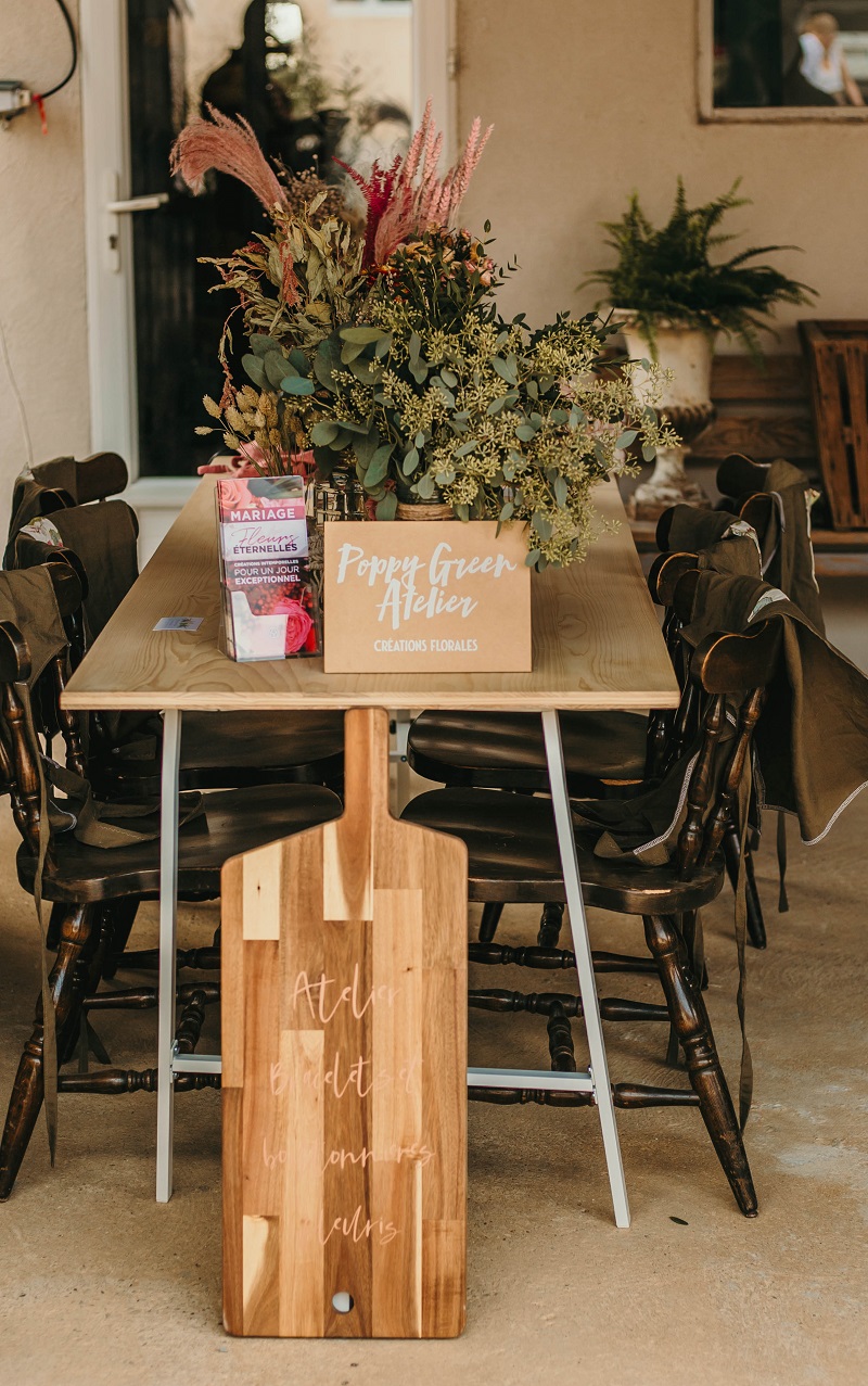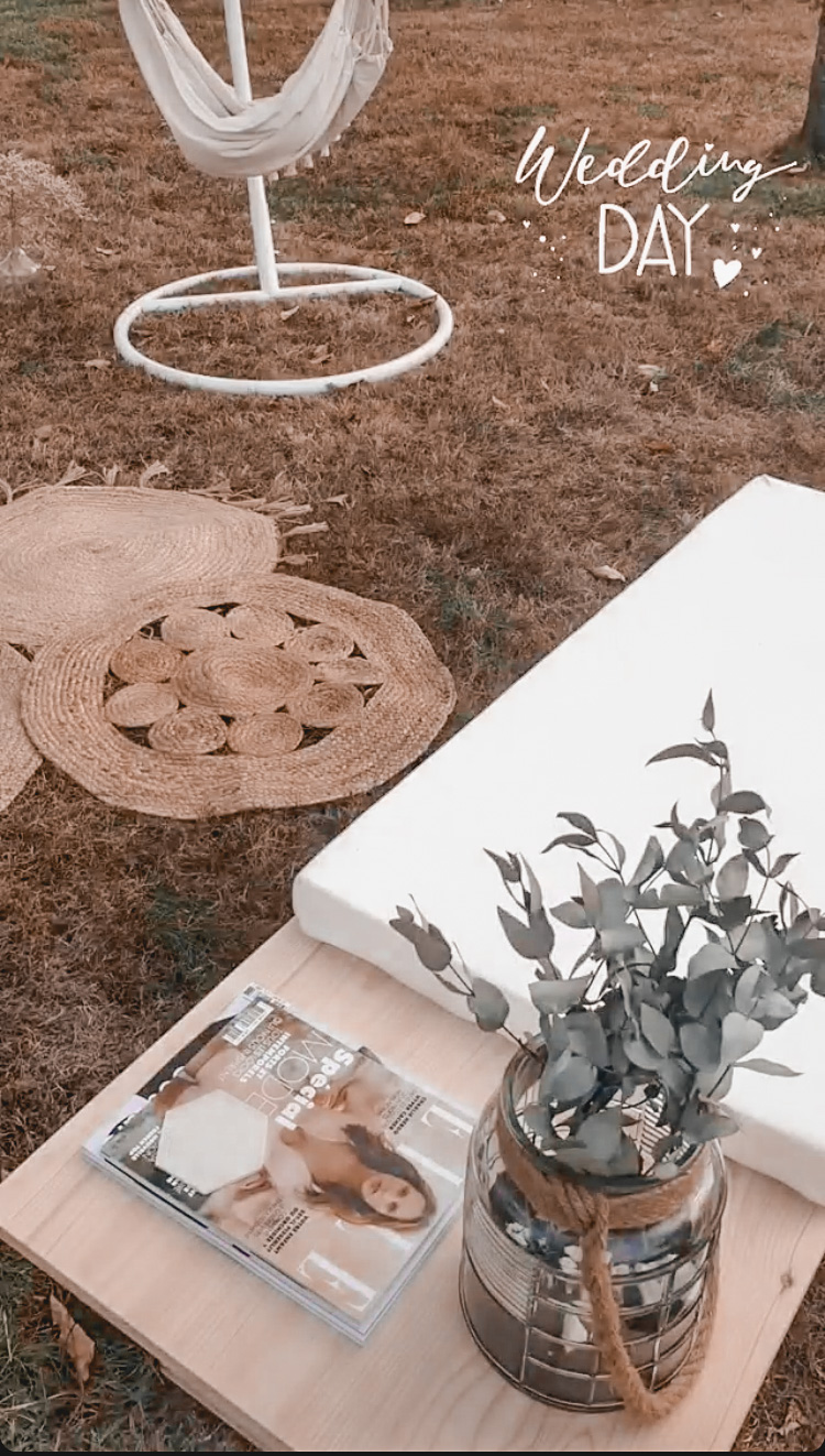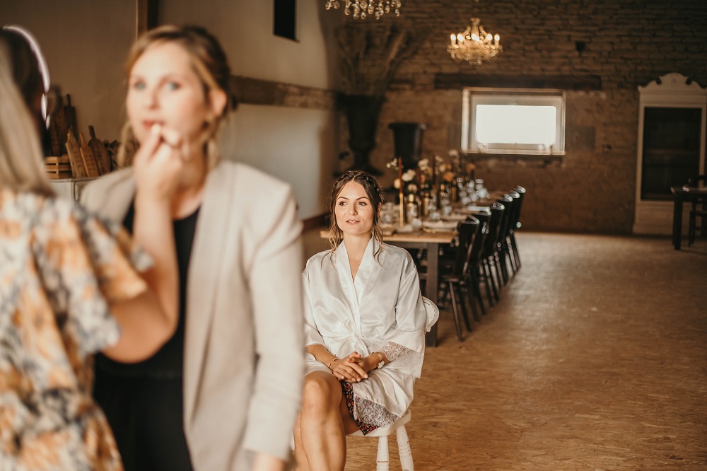 Une fois la coiffure finie, et le soleil étant revenu, j'ai foncé installer la décoration extérieure. Mais c'était vite l'heure du maquillage, j'ai donc délégué un peu aux témoins et aux proches présents. J'ai trouvé ça adorable car ils ont mis tout leur cœur à essayer de faire la même chose que ce que j'avais pris en photo pendant mes tests déco. J'avoue que j'étais assez stressée à ce moment là, j'avais vraiment envie que tout soit parfait. Je n'avais qu'une hâte : que le maquillage soit fini pour retourner à la décoration ! C'est mon côté très perfectionniste, et heureusement que j'étais bien entourée, et bien aidée par toutes ces petites mains pour me permettre d'avoir le mariage dont je rêvais. Dur de faire retomber la pression quand on a imaginé ce jour pendant près de deux ans et qu'on souhaite que tout se passe parfaitement. On a malgré tout rencontré quelques petits soucis : le vent qui faisait s'envoler notre tente en voile dans l'herbe, les sacs de bienvenue qui ne tenaient pas sur les bancs, des décorations retrouvées cassées dans les cartons.. Mais au final ce n'était que des détails et personne n'y a fait vraiment attention.
