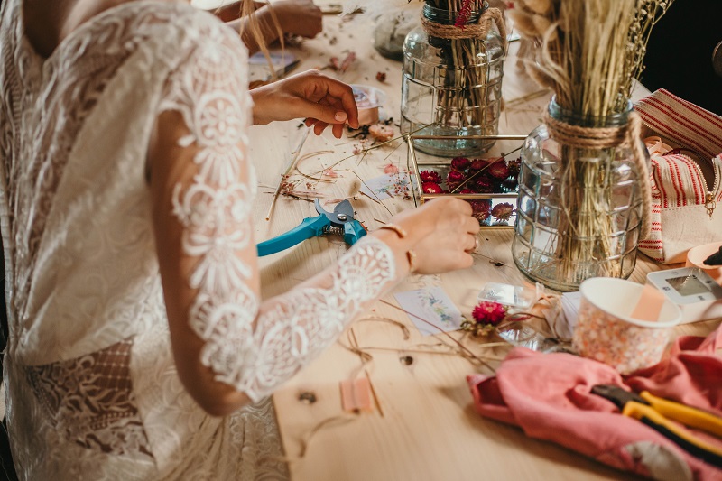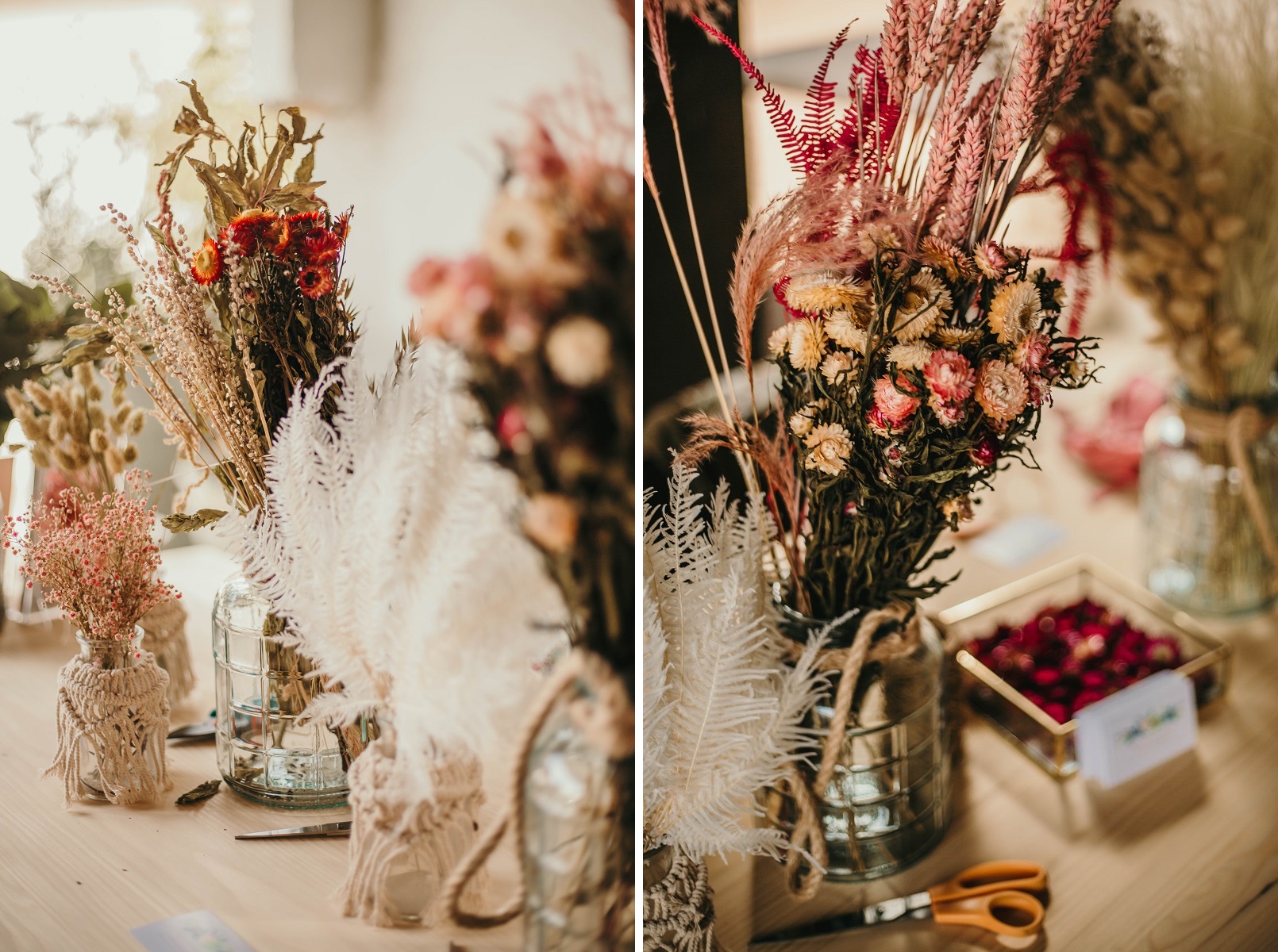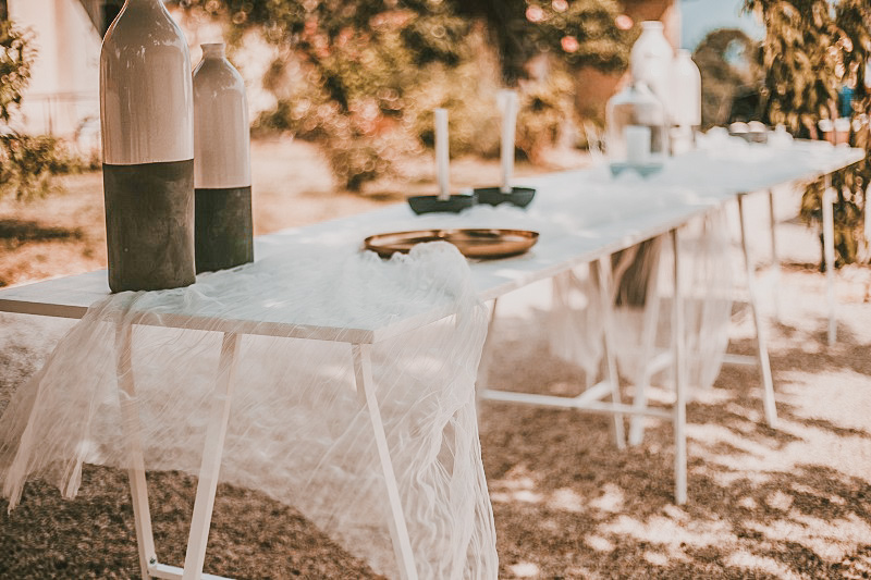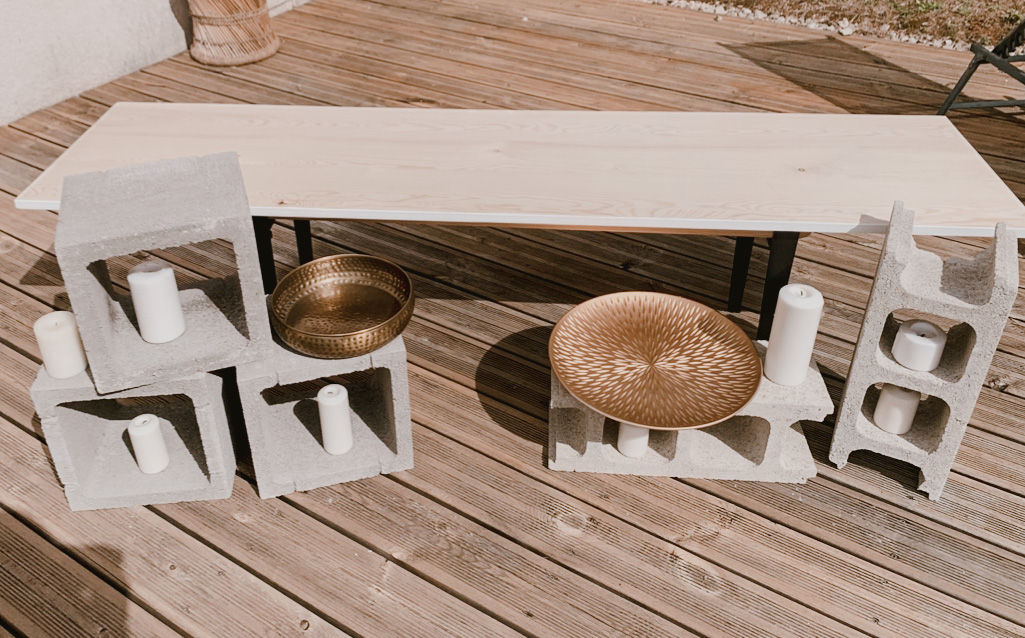 Une fois la coiffure finie, et le soleil étant revenu, j'ai foncé installer la décoration extérieure. Mais c'était vite l'heure du maquillage, j'ai donc délégué un peu aux témoins et aux proches présents. J'ai trouvé ça adorable car ils ont mis tout leur cœur à essayer de faire la même chose que ce que j'avais pris en photo pendant mes tests déco. J'avoue que j'étais assez stressée à ce moment là, j'avais vraiment envie que tout soit parfait. Je n'avais qu'une hâte : que le maquillage soit fini pour retourner à la décoration ! C'est mon côté très perfectionniste, et heureusement que j'étais bien entourée, et bien aidée par toutes ces petites mains pour me permettre d'avoir le mariage dont je rêvais. Dur de faire retomber la pression quand on a imaginé ce jour pendant près de deux ans et qu'on souhaite que tout se passe parfaitement. On a malgré tout rencontré quelques petits soucis : le vent qui faisait s'envoler notre tente en voile dans l'herbe, les sacs de bienvenue qui ne tenaient pas sur les bancs, des décorations retrouvées cassées dans les cartons.. Mais au final ce n'était que des détails et personne n'y a fait vraiment attention.
