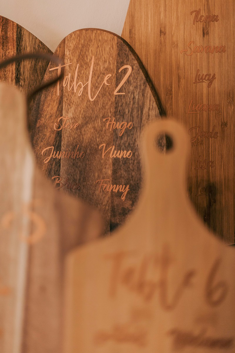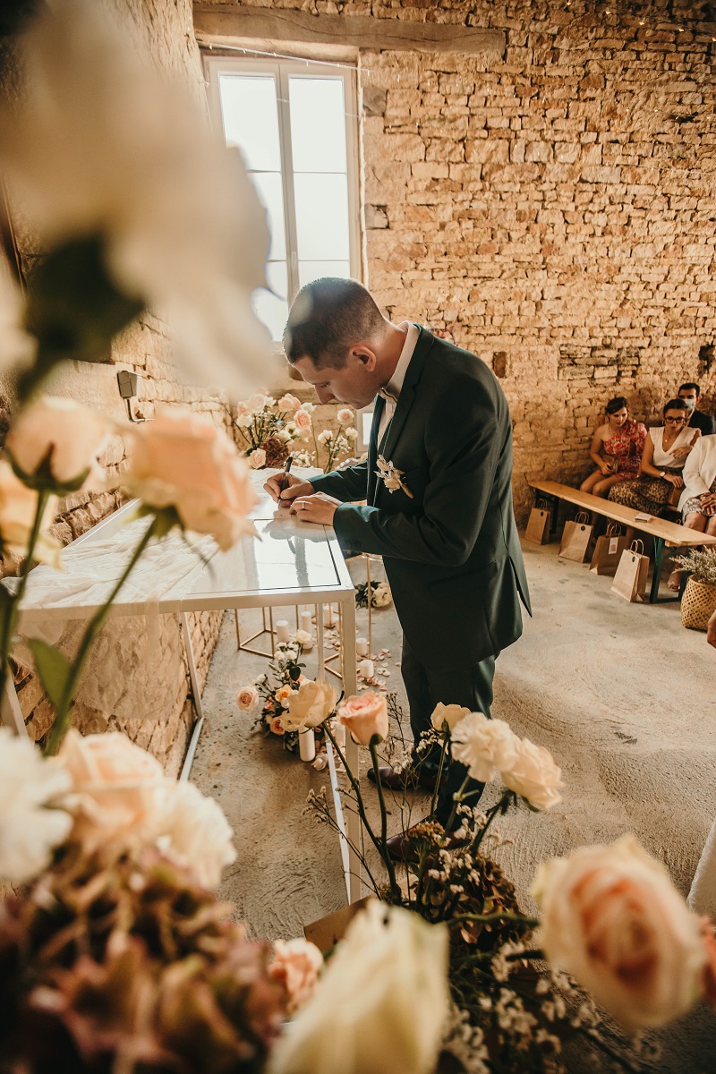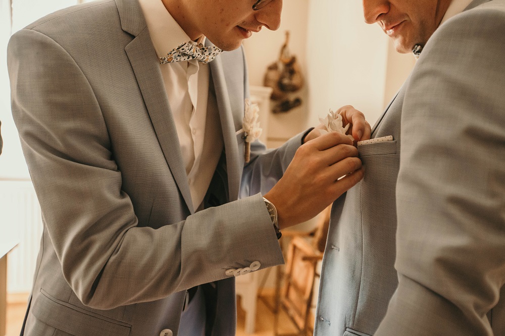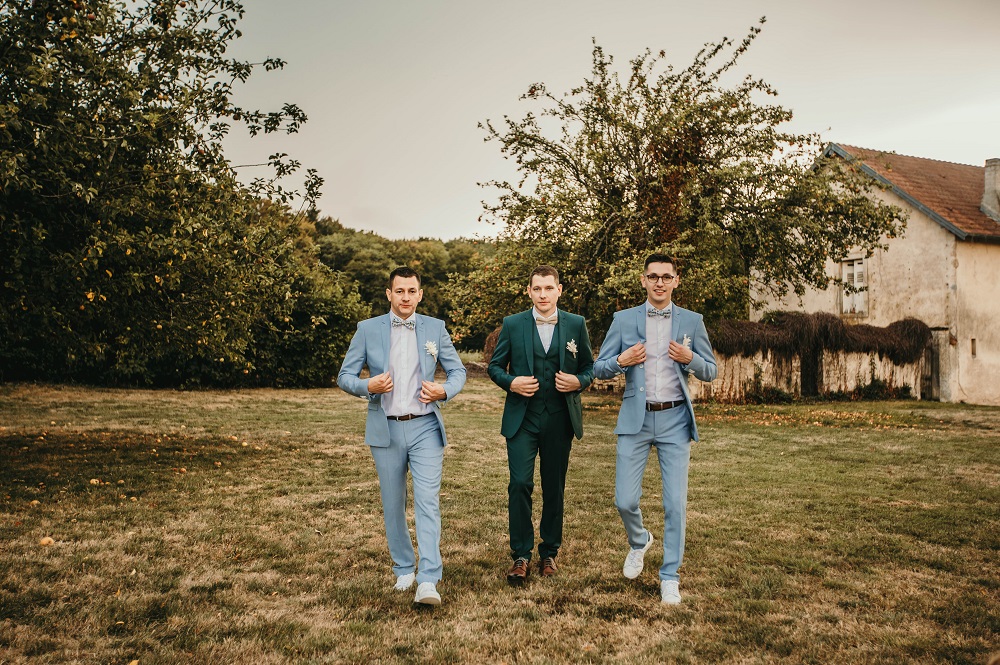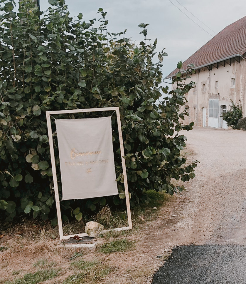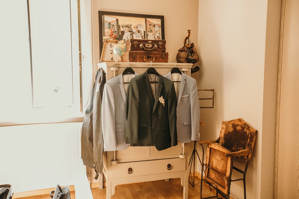 J'avais peur que la journée soit longue jusqu'à la cérémonie mais au final la matinée et le début d'après-midi ont filé à très grande vitesse. Je n'imagine pas une seconde avoir dû caser la mairie qui était à environ 20 minutes de route au milieu de cette journée. Petit à petit il a fallu accueillir également les premiers prestataires : le groupe de musique, le traiteur... L'heure est vite arrivée d'aller s'habiller. J'ai beaucoup aimé ce moment, entourée de mes proches. Mr Dress est parti de son côté également pour s'habiller avec ses témoins. J'avais prévu pour eux des cintres personnalisés, avec leurs noms en noir mat sur des cintres noirs satinés. Pour les cintres des filles, j'avais trouvé des cintres en macramé. La robe a été fabriquée par Juliette Flambard (retrouvez-ici mes trois robes de mariage et les étapes de la création sur-mesure de celle-ci). Le costume de Mr Dress vient de Father & Sons. Je lui avais soufflé la couleur, j'adorais ce vert sapin que je trouvais super original. Je ne pensais pas qu'il prendrait vraiment cette couleur car il voulait partir sur un bleu marine à la base. J'étais ravie qu'il fasse ce choix, il était tellement beau ! Les costumes bleus des témoins venaient du même endroit. Les boutonnières de fleurs venaient quant à elle de Petite Fleur à Besançon.
