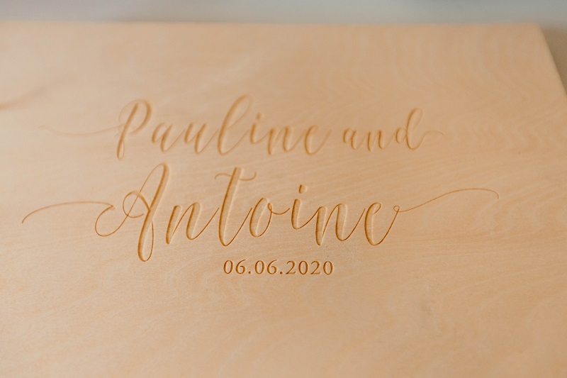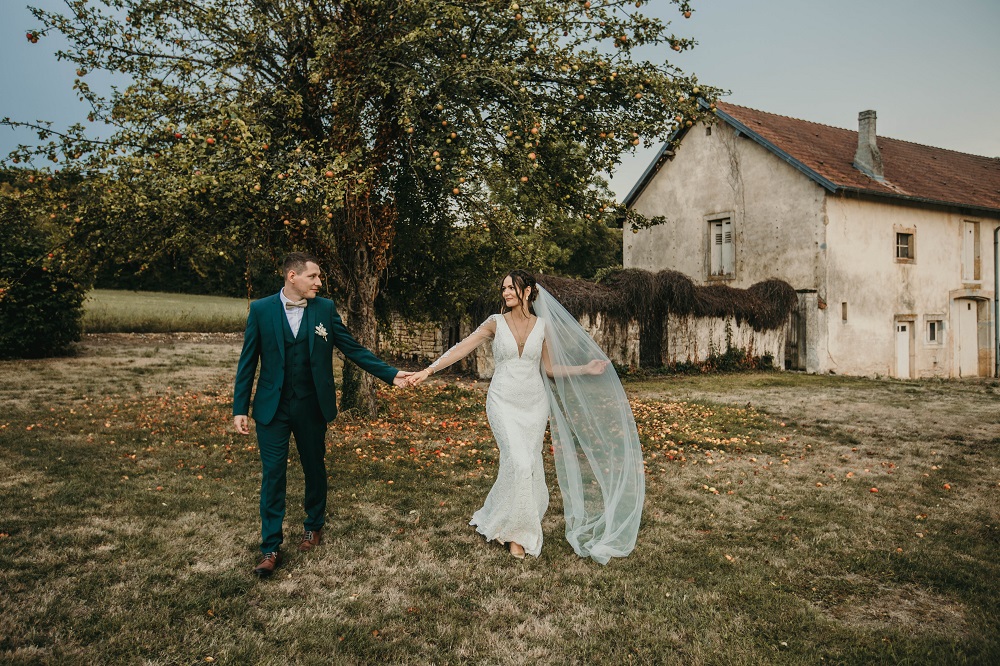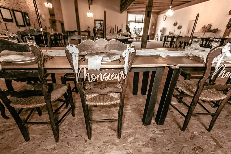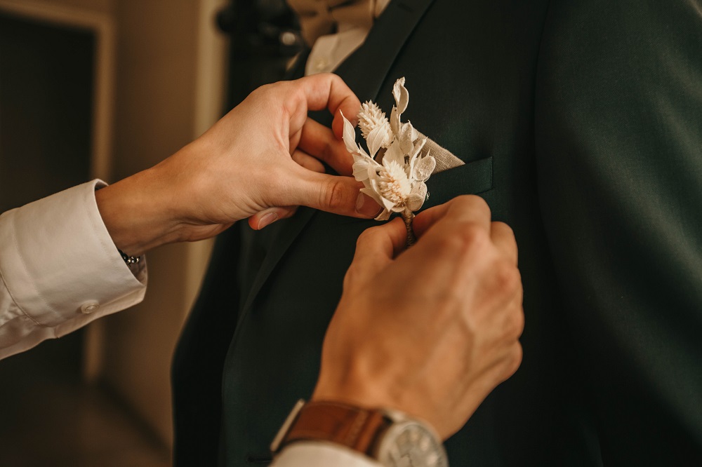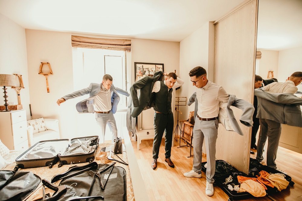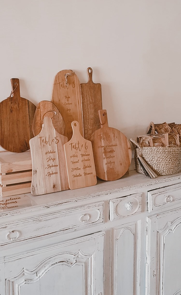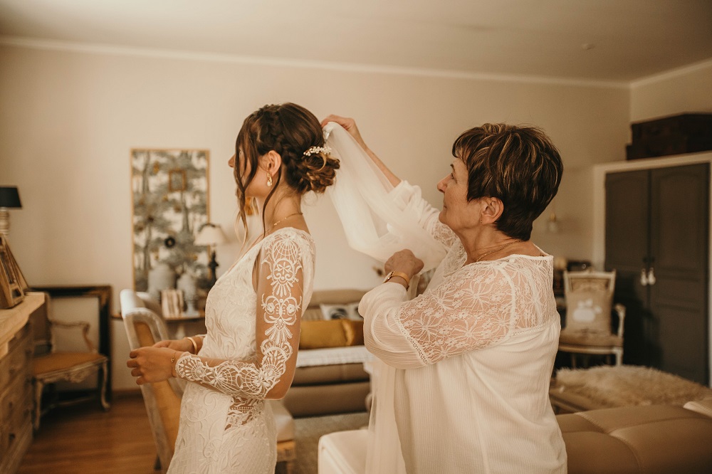 J'avais peur que la journée soit longue jusqu'à la cérémonie mais au final la matinée et le début d'après-midi ont filé à très grande vitesse. Je n'imagine pas une seconde avoir dû caser la mairie qui était à environ 20 minutes de route au milieu de cette journée. Petit à petit il a fallu accueillir également les premiers prestataires : le groupe de musique, le traiteur... L'heure est vite arrivée d'aller s'habiller. J'ai beaucoup aimé ce moment, entourée de mes proches. Mr Dress est parti de son côté également pour s'habiller avec ses témoins. J'avais prévu pour eux des cintres personnalisés, avec leurs noms en noir mat sur des cintres noirs satinés. Pour les cintres des filles, j'avais trouvé des cintres en macramé. La robe a été fabriquée par Juliette Flambard (retrouvez-ici mes trois robes de mariage et les étapes de la création sur-mesure de celle-ci). Le costume de Mr Dress vient de Father & Sons. Je lui avais soufflé la couleur, j'adorais ce vert sapin que je trouvais super original. Je ne pensais pas qu'il prendrait vraiment cette couleur car il voulait partir sur un bleu marine à la base. J'étais ravie qu'il fasse ce choix, il était tellement beau ! Les costumes bleus des témoins venaient du même endroit. Les boutonnières de fleurs venaient quant à elle de Petite Fleur à Besançon.