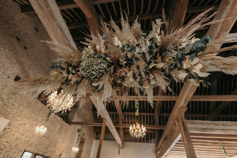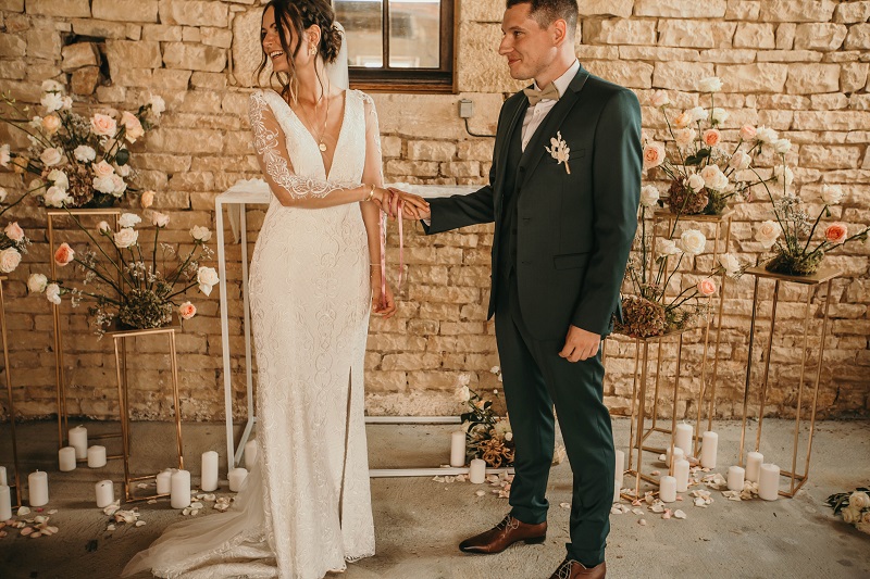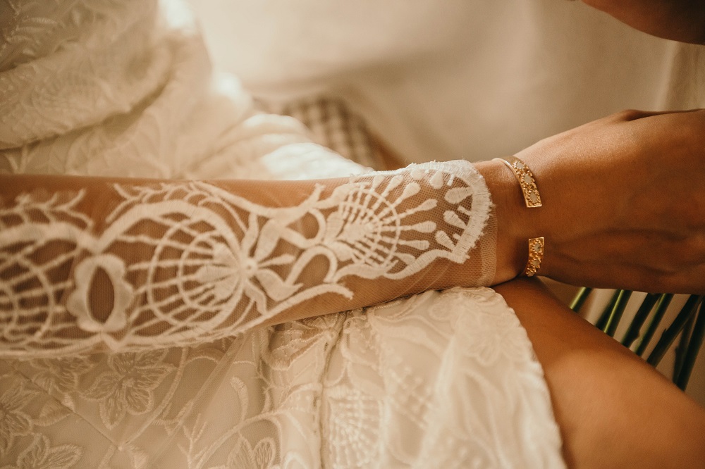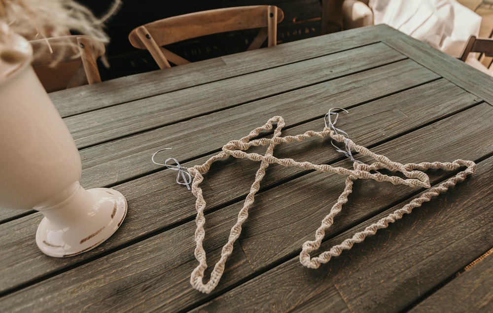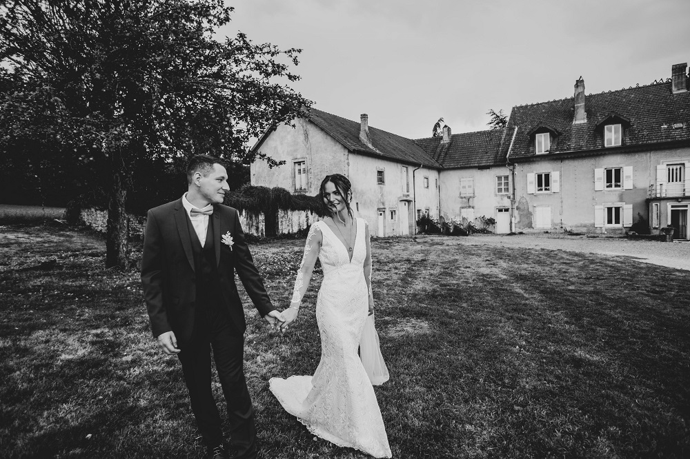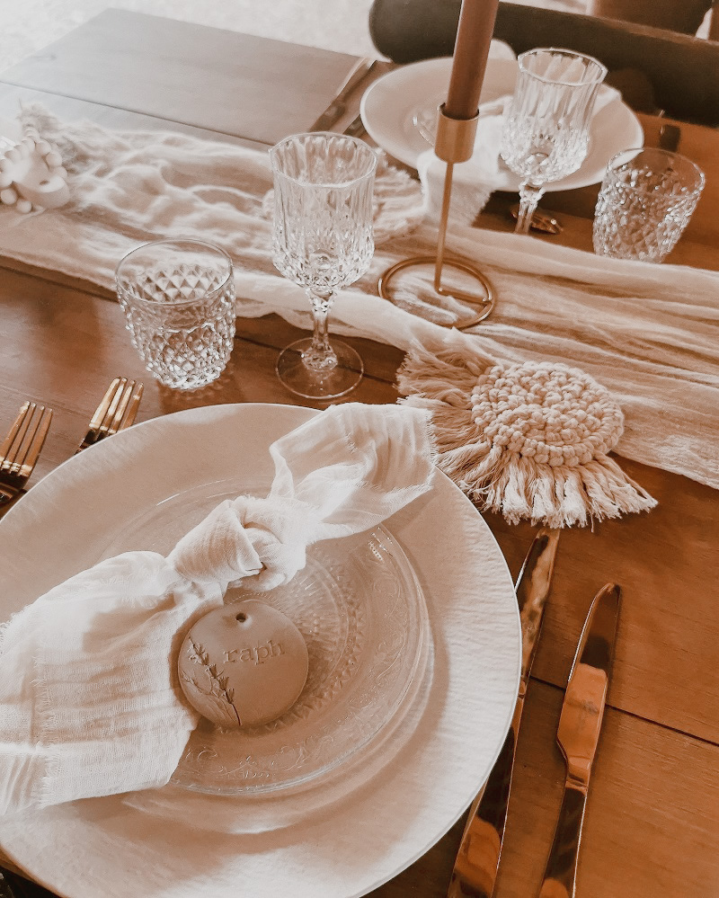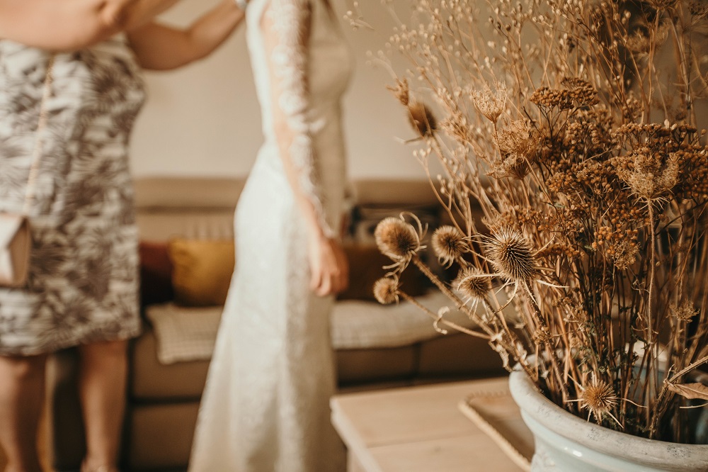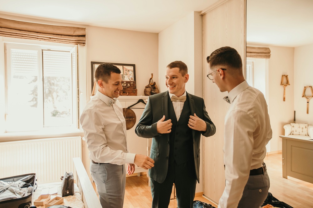J'avais peur que la journée soit longue jusqu'à la cérémonie mais au final la matinée et le début d'après-midi ont filé à très grande vitesse. Je n'imagine pas une seconde avoir dû caser la mairie qui était à environ 20 minutes de route au milieu de cette journée. Petit à petit il a fallu accueillir également les premiers prestataires : le groupe de musique, le traiteur... L'heure est vite arrivée d'aller s'habiller. J'ai beaucoup aimé ce moment, entourée de mes proches. Mr Dress est parti de son côté également pour s'habiller avec ses témoins. J'avais prévu pour eux des cintres personnalisés, avec leurs noms en noir mat sur des cintres noirs satinés. Pour les cintres des filles, j'avais trouvé des cintres en macramé. La robe a été fabriquée par Juliette Flambard (retrouvez-ici mes trois robes de mariage et les étapes de la création sur-mesure de celle-ci). Le costume de Mr Dress vient de Father & Sons. Je lui avais soufflé la couleur, j'adorais ce vert sapin que je trouvais super original. Je ne pensais pas qu'il prendrait vraiment cette couleur car il voulait partir sur un bleu marine à la base. J'étais ravie qu'il fasse ce choix, il était tellement beau ! Les costumes bleus des témoins venaient du même endroit. Les boutonnières de fleurs venaient quant à elle de Petite Fleur à Besançon.