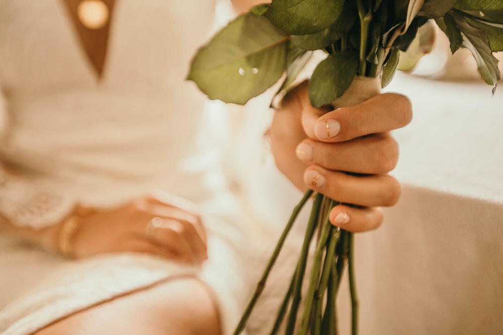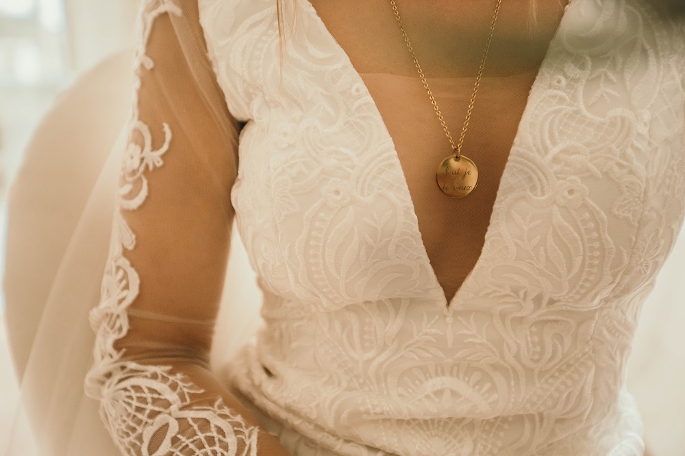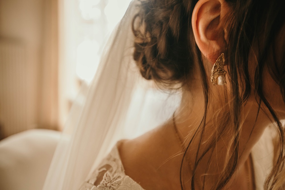 Côté détails, je vous mets les petits bijoux qui m'ont accompagné ce jour là : des boucles d'oreilles Asos, ma médaille Shebam Paris (nous avions fait cette médaille à message ensemble, en collaboration), les ongles nude et dorés réalisés par @Linstantpoudree. Le voile venait de Aliexpress, j'en voulais un qui soit le plus simple possible (j'ai du le payer 3€ et il a vraiment fait l'affaire). Pour le bouquet, j'avais envie d'un bouquet hyper minimaliste également, composé uniquement de roses blanches, avec des tiges très longues.