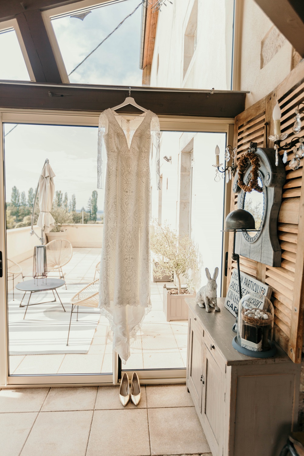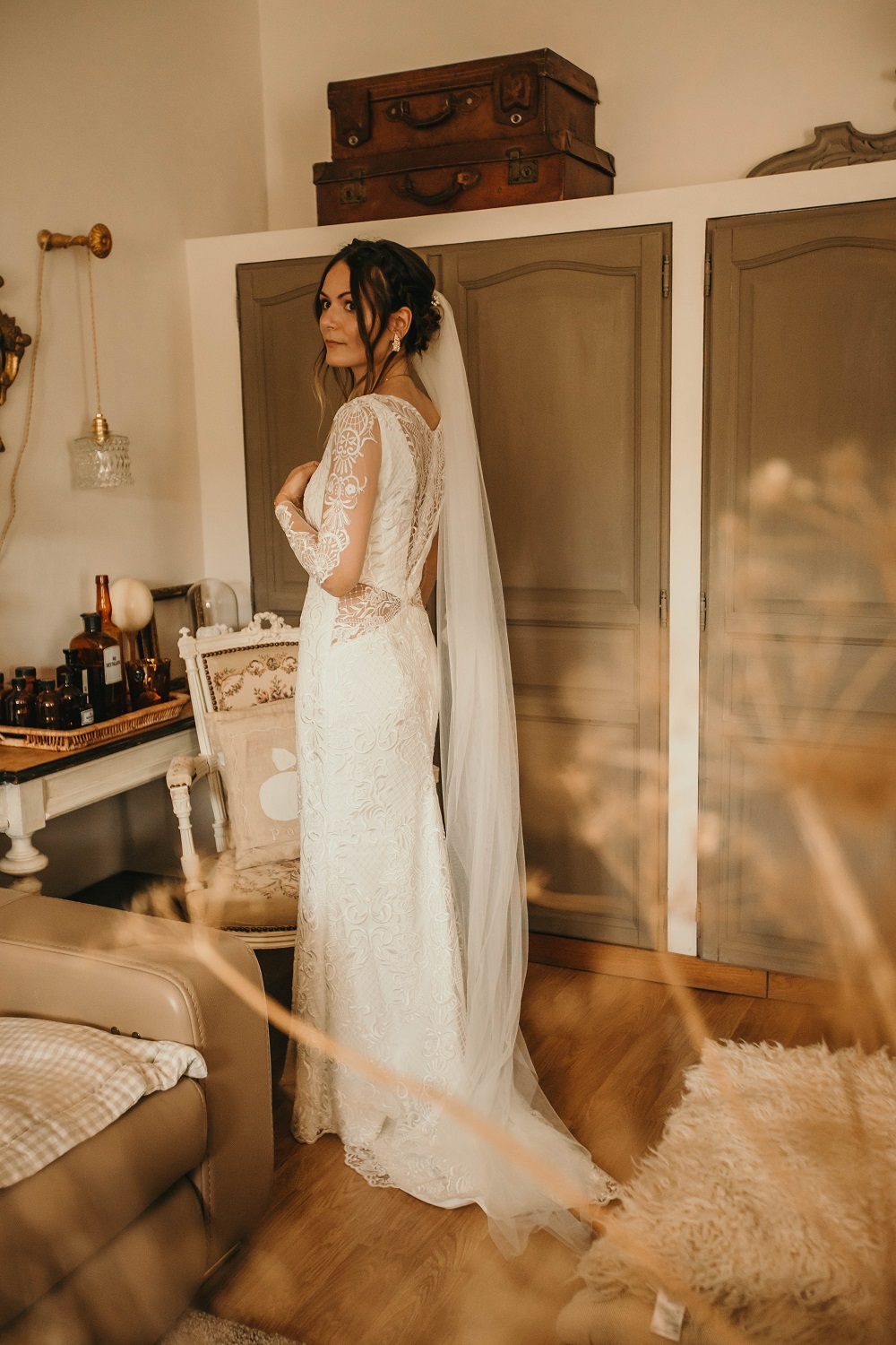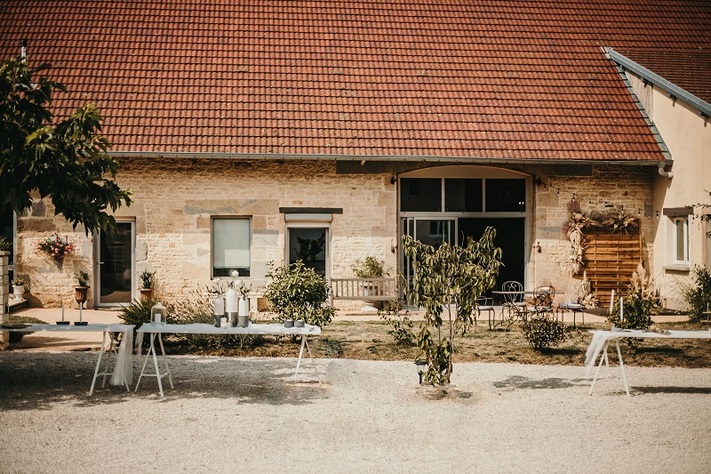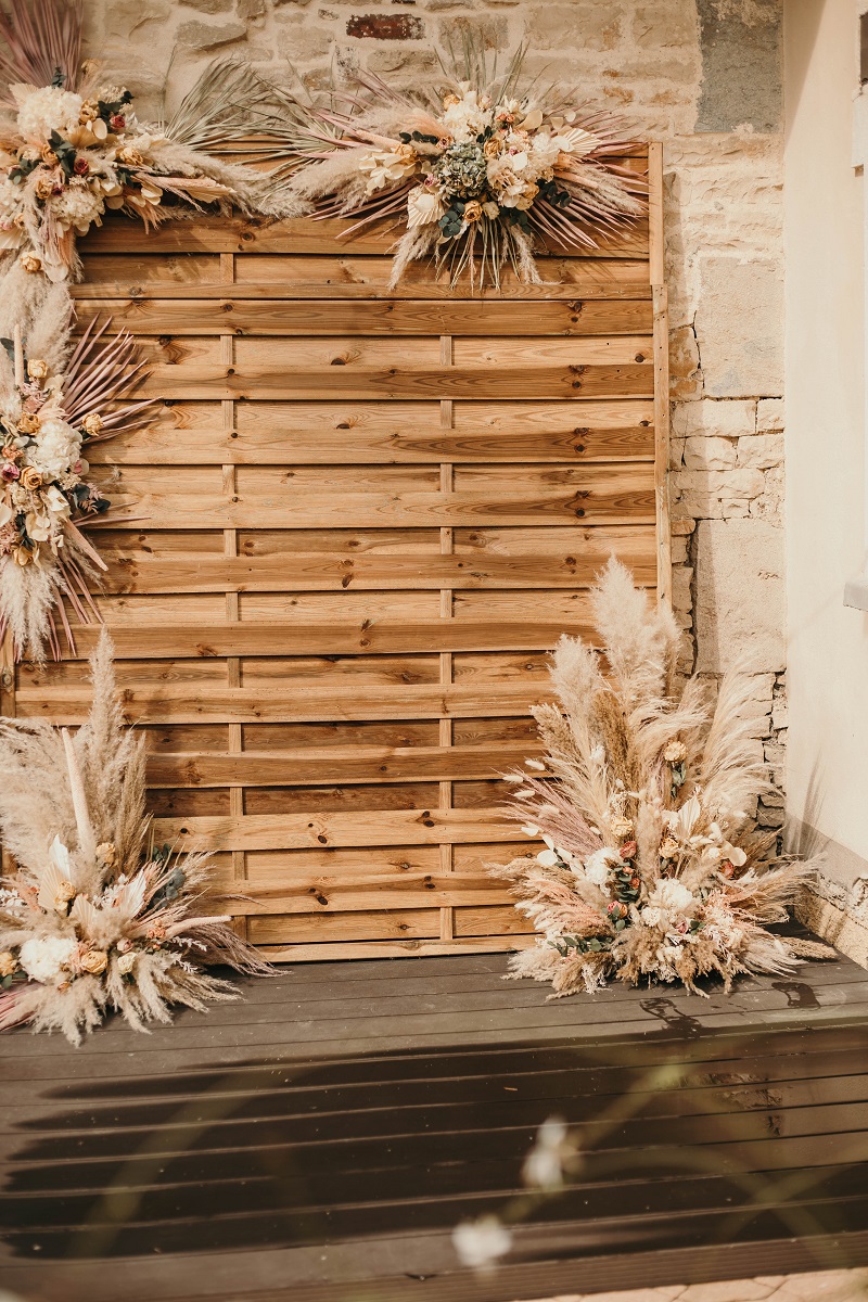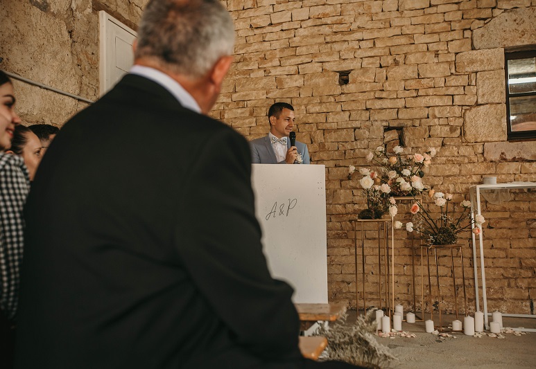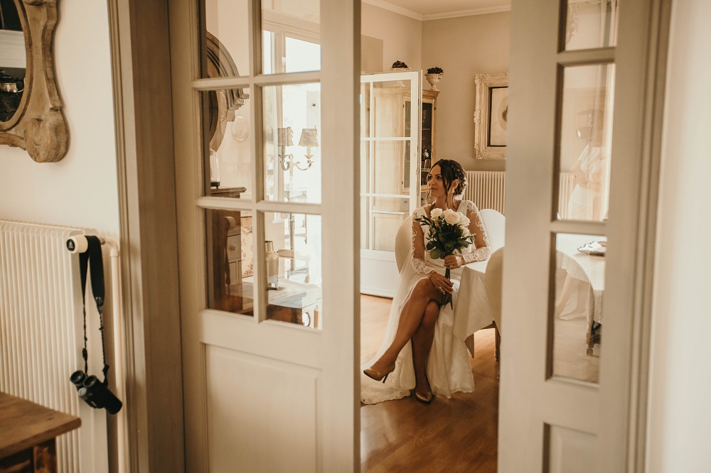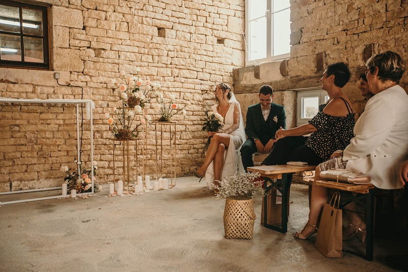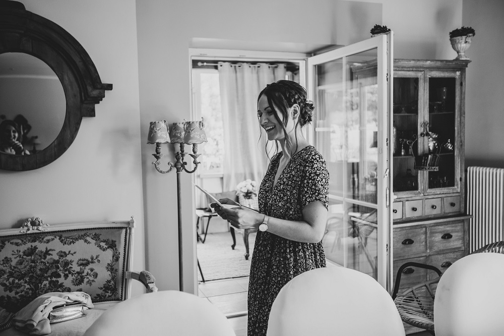 Il y avait beaucoup d'émotion au moment de mettre nos tenues et c'était vraiment un très beau moment. J'en garde un excellent souvenir, j'étais tellement bien entourée. Finalement, l'heure de la cérémonie est arrivée et je me suis retrouvée à attendre dans la maison mon entrée à la cérémonie qui se tenait juste à côté. Laurence, la propriétaire du domaine m'a tenu compagnie pendant ce moment plein d'émotion et m'a aidé à laisser retomber un peu la pression. J'avais super peur à ce moment là, je n'avais encore vu aucun invité, j'allais découvrir monsieur Dress et j'allais devoir m'avancer devant tout le monde.. J'attendais de loin le signal de mes sœurs car c'est elles qui rentraient avant moi à la cérémonie. Puis ce fut le moment, la musique que j'avais choisie a retenti, j'ai vu mes témoins s'avancer sous l'appentis en bois. Et j'y suis allée. Au final j'avais prévu de marcher doucement pour faire une belle entrée.. et j'ai foncé comme une flèche ! Mais à ce moment là tout le stress s'est envolé et j'ai passé la meilleure journée de ma vie.