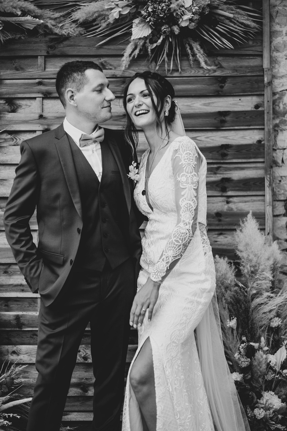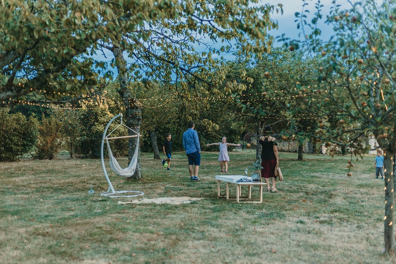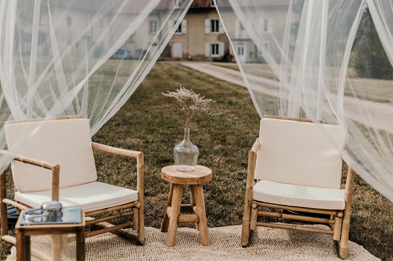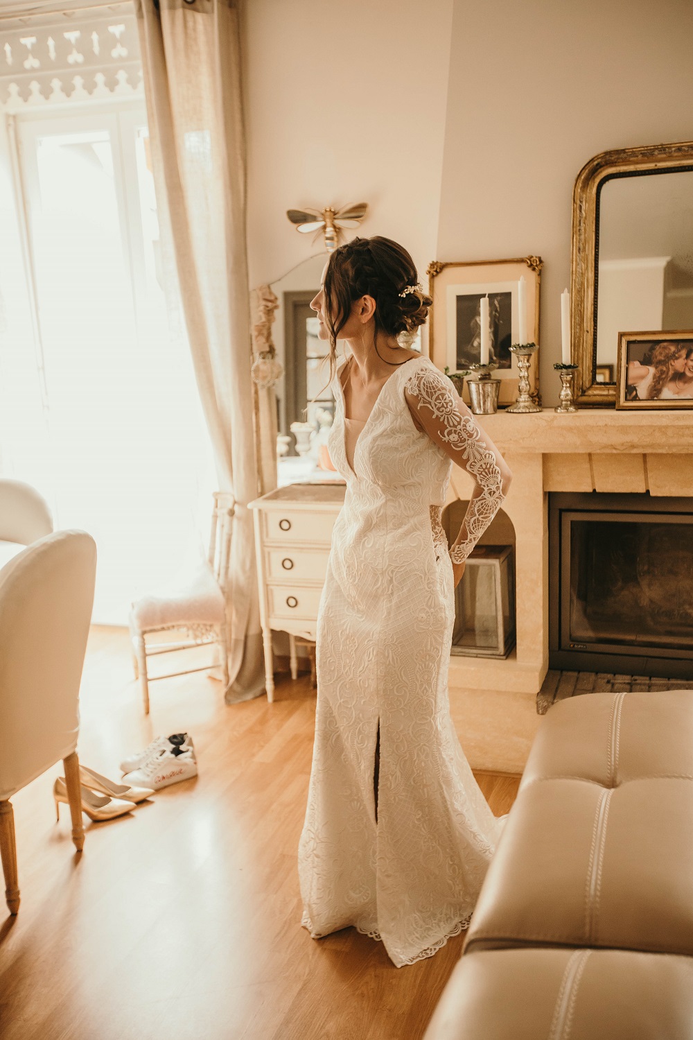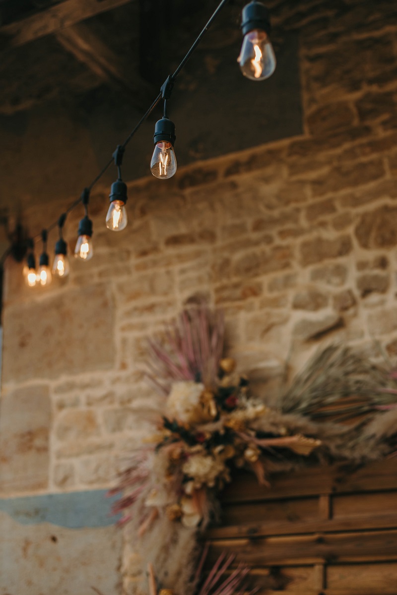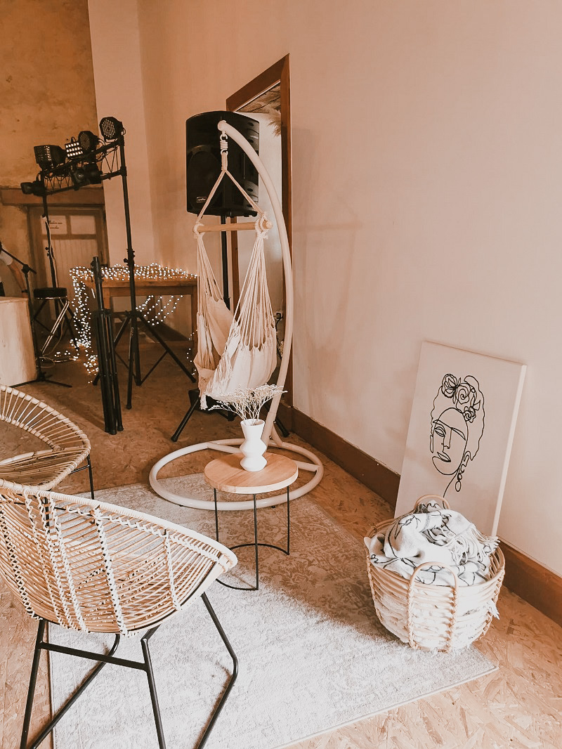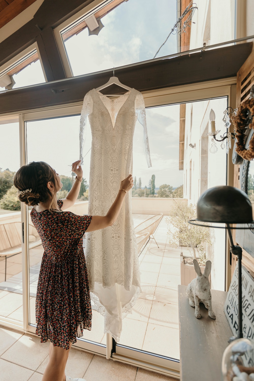 Il y avait beaucoup d'émotion au moment de mettre nos tenues et c'était vraiment un très beau moment. J'en garde un excellent souvenir, j'étais tellement bien entourée. Finalement, l'heure de la cérémonie est arrivée et je me suis retrouvée à attendre dans la maison mon entrée à la cérémonie qui se tenait juste à côté. Laurence, la propriétaire du domaine m'a tenu compagnie pendant ce moment plein d'émotion et m'a aidé à laisser retomber un peu la pression. J'avais super peur à ce moment là, je n'avais encore vu aucun invité, j'allais découvrir monsieur Dress et j'allais devoir m'avancer devant tout le monde.. J'attendais de loin le signal de mes sœurs car c'est elles qui rentraient avant moi à la cérémonie. Puis ce fut le moment, la musique que j'avais choisie a retenti, j'ai vu mes témoins s'avancer sous l'appentis en bois. Et j'y suis allée. Au final j'avais prévu de marcher doucement pour faire une belle entrée.. et j'ai foncé comme une flèche ! Mais à ce moment là tout le stress s'est envolé et j'ai passé la meilleure journée de ma vie.