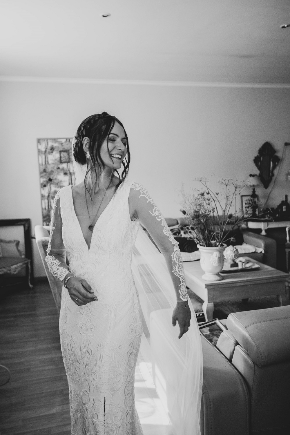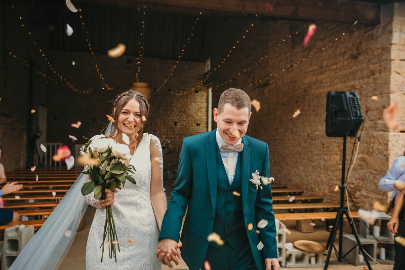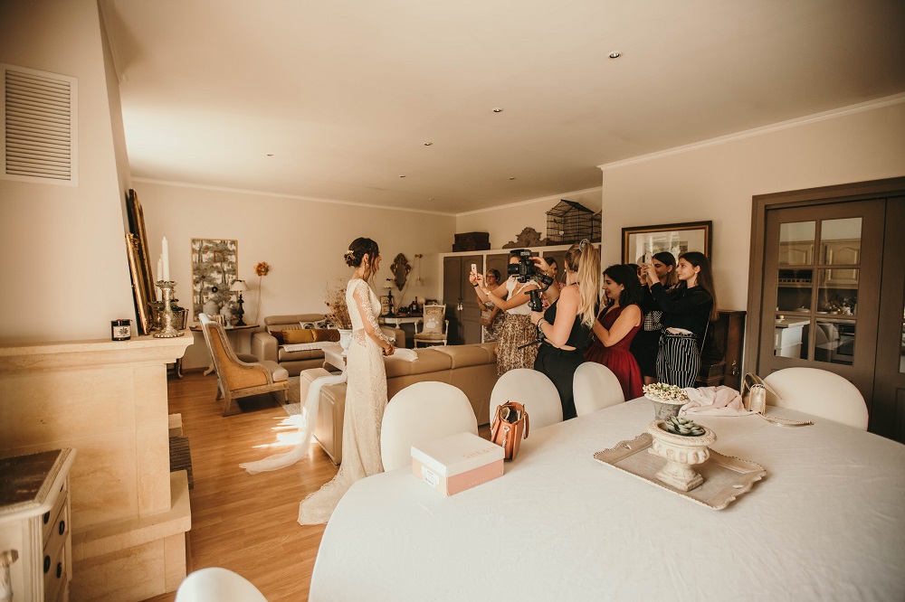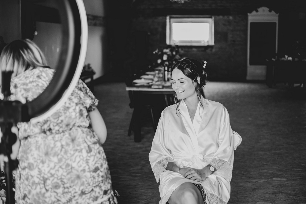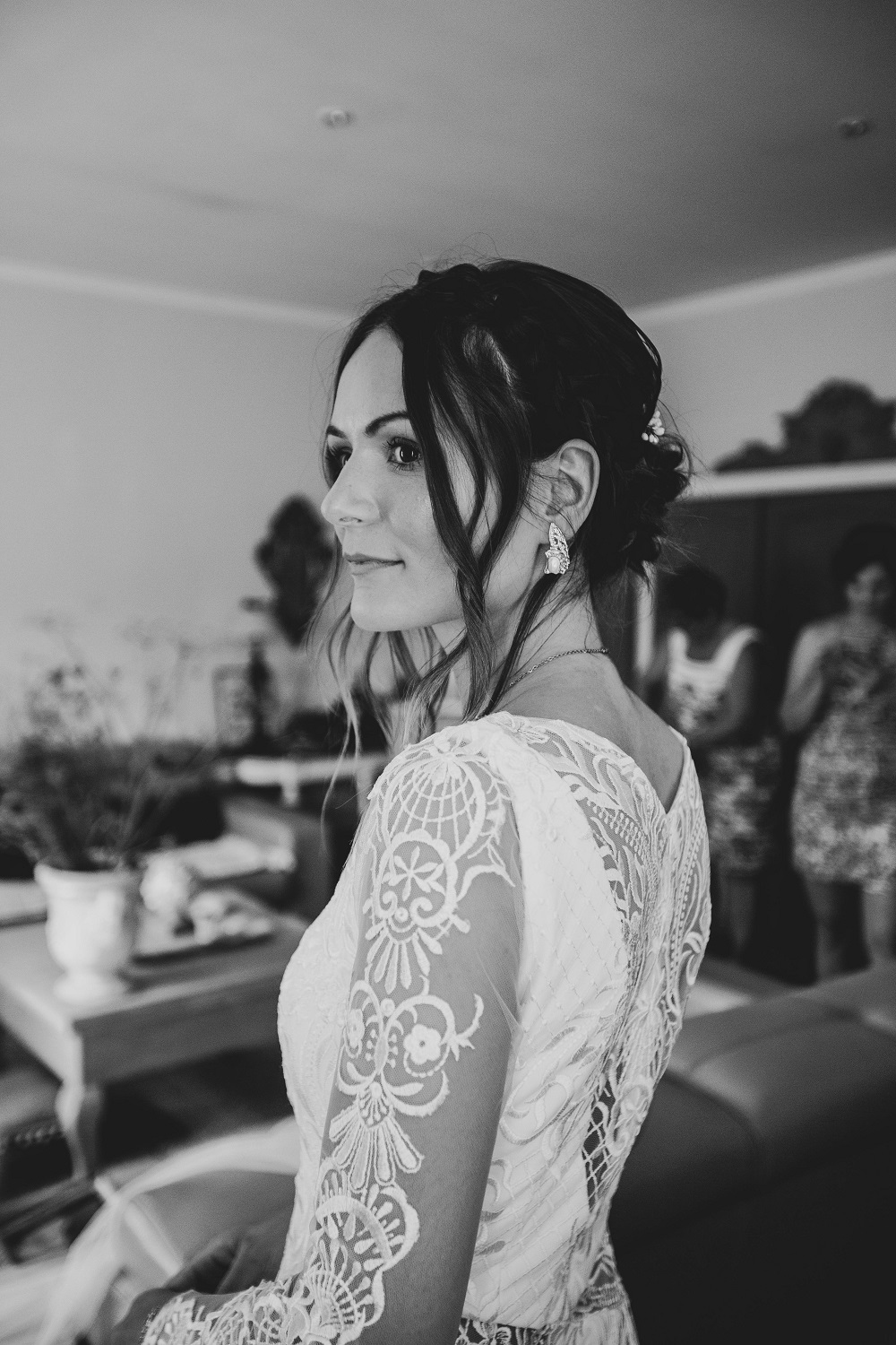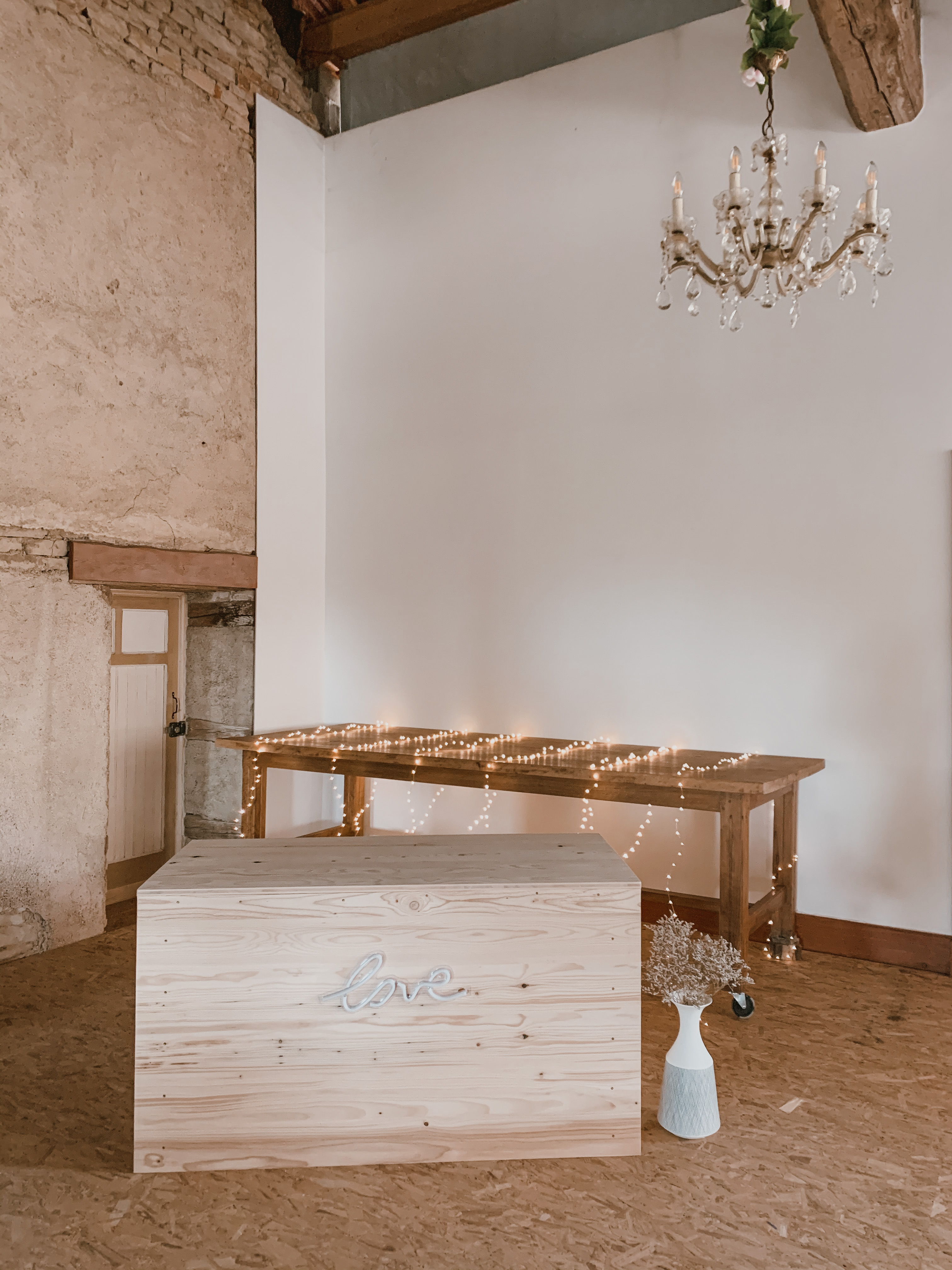 Il y avait beaucoup d'émotion au moment de mettre nos tenues et c'était vraiment un très beau moment. J'en garde un excellent souvenir, j'étais tellement bien entourée. Finalement, l'heure de la cérémonie est arrivée et je me suis retrouvée à attendre dans la maison mon entrée à la cérémonie qui se tenait juste à côté. Laurence, la propriétaire du domaine m'a tenu compagnie pendant ce moment plein d'émotion et m'a aidé à laisser retomber un peu la pression. J'avais super peur à ce moment là, je n'avais encore vu aucun invité, j'allais découvrir monsieur Dress et j'allais devoir m'avancer devant tout le monde.. J'attendais de loin le signal de mes sœurs car c'est elles qui rentraient avant moi à la cérémonie. Puis ce fut le moment, la musique que j'avais choisie a retenti, j'ai vu mes témoins s'avancer sous l'appentis en bois. Et j'y suis allée. Au final j'avais prévu de marcher doucement pour faire une belle entrée.. et j'ai foncé comme une flèche ! Mais à ce moment là tout le stress s'est envolé et j'ai passé la meilleure journée de ma vie.
